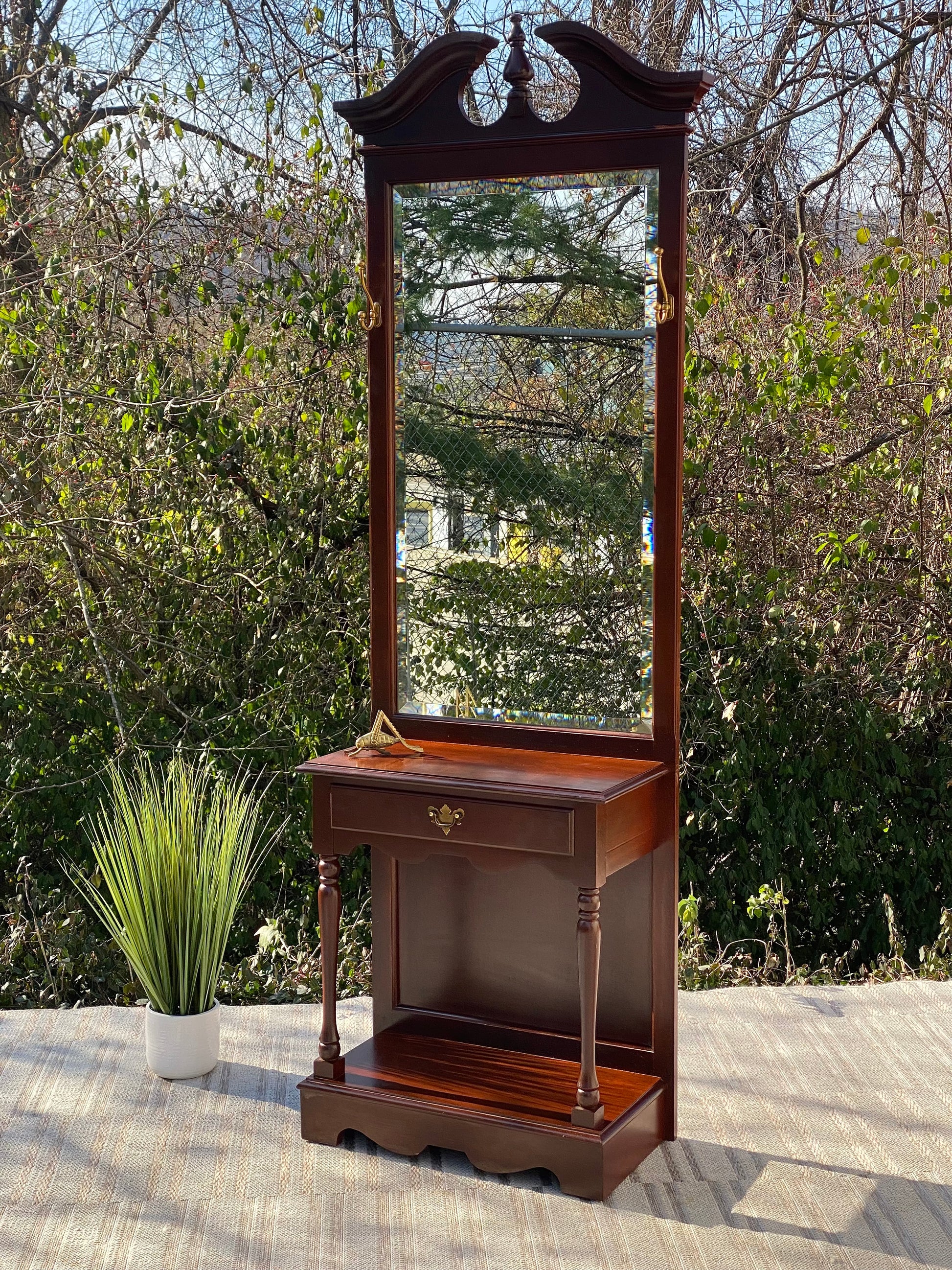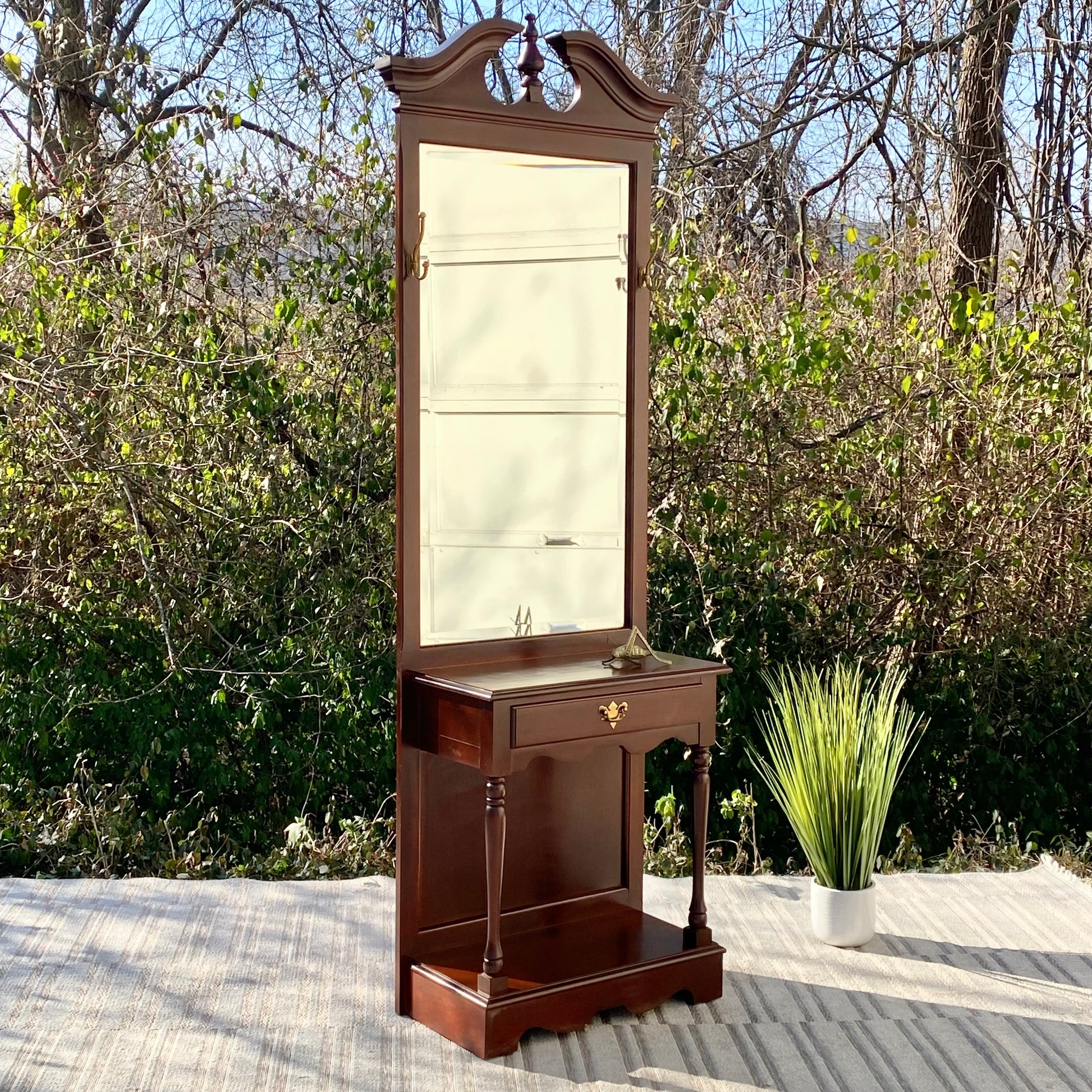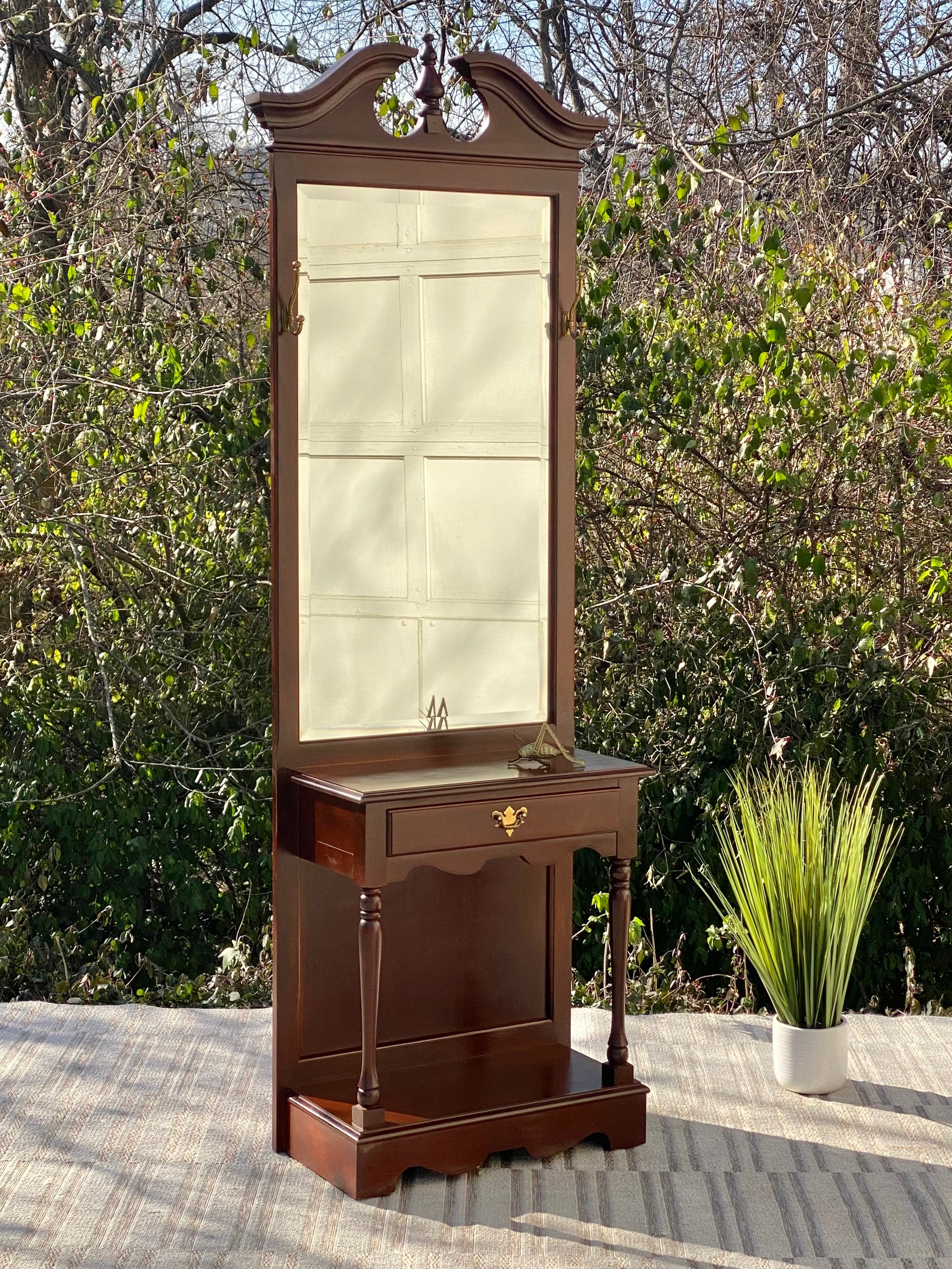 Fresh find! ❄️❄️ Check out this nice vintage Broyhill hallway tree with mirror. Small drawer for storage with original hardware. Made In The USA. 80” x 25” x 13” Good condition