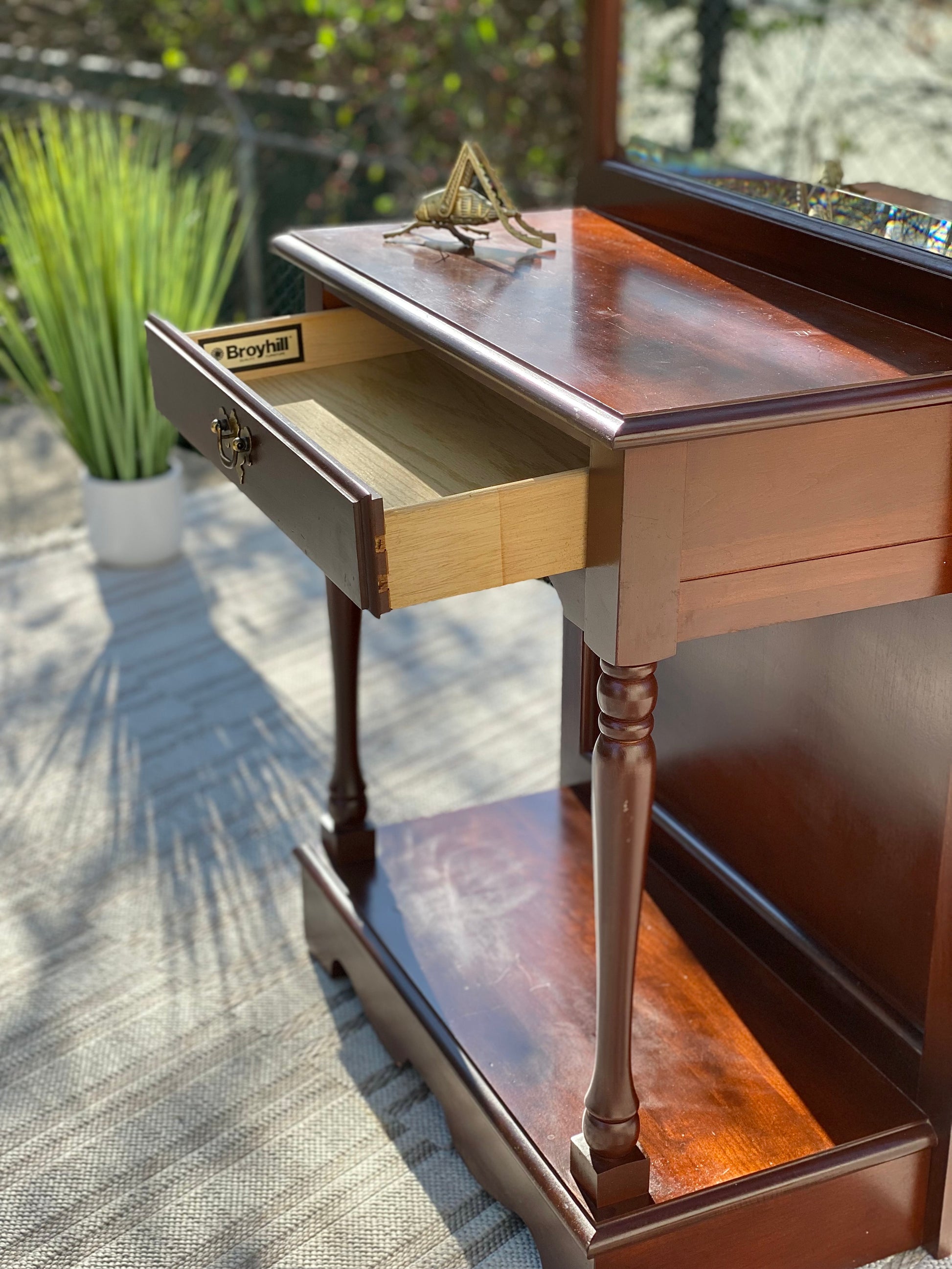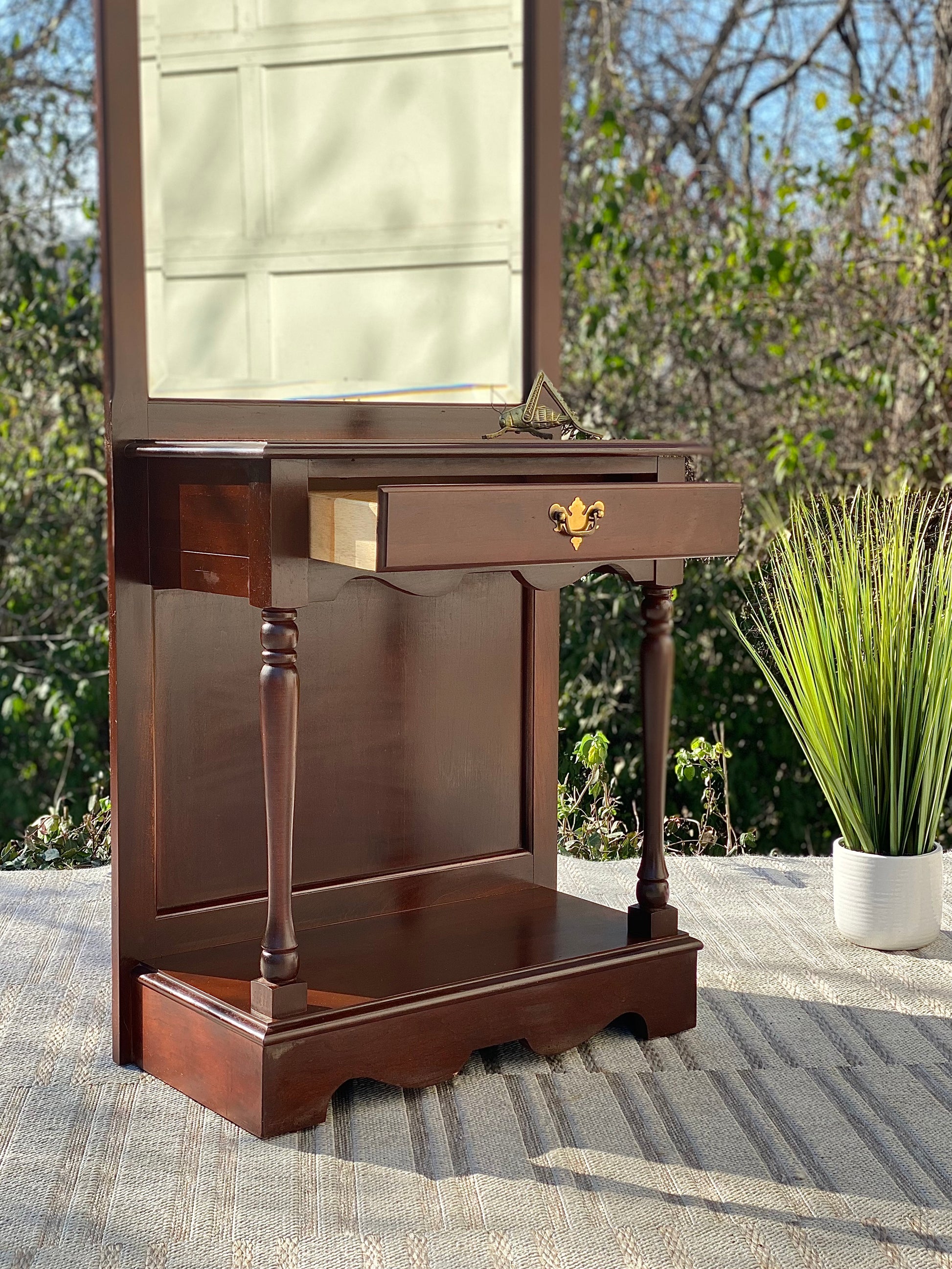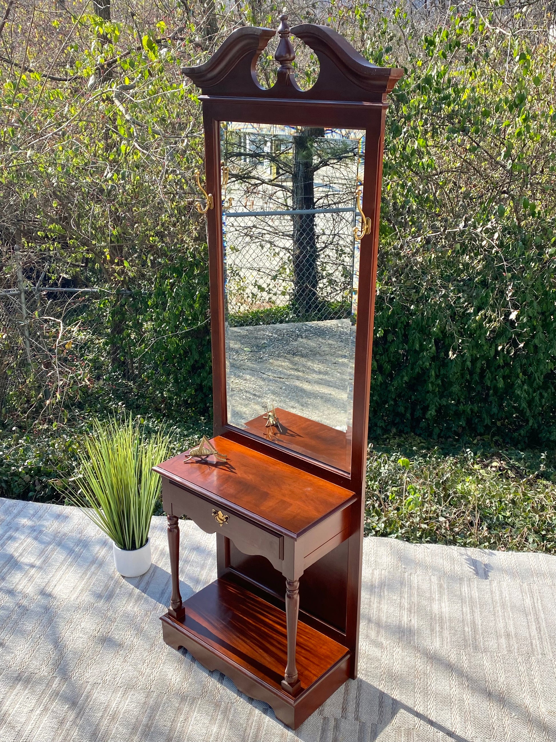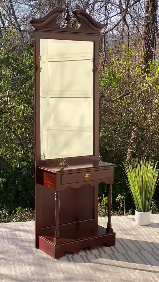Fresh find! ❄️❄️ Check out this nice vintage Broyhill hallway tree with mirror. Small drawer for storage with original hardware. Made In The USA. 80” x 25” x 13” Good condition