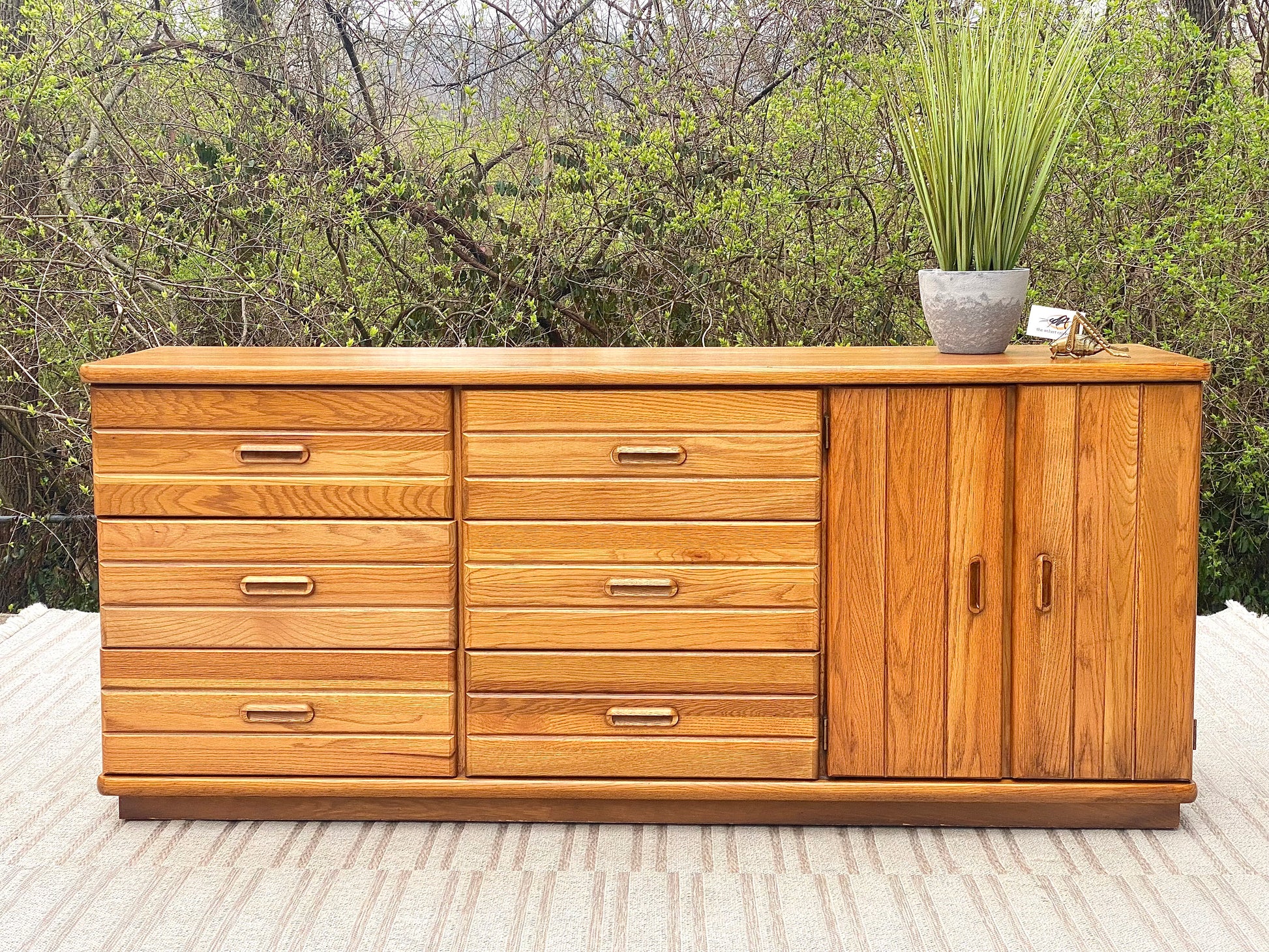 Fresh find! 🌱🪴 We love the vibe of this vintage Broyhill oak 9 drawer dresser. Tons of space with a warm tone. 31”h x 72” x 19” Good condition
