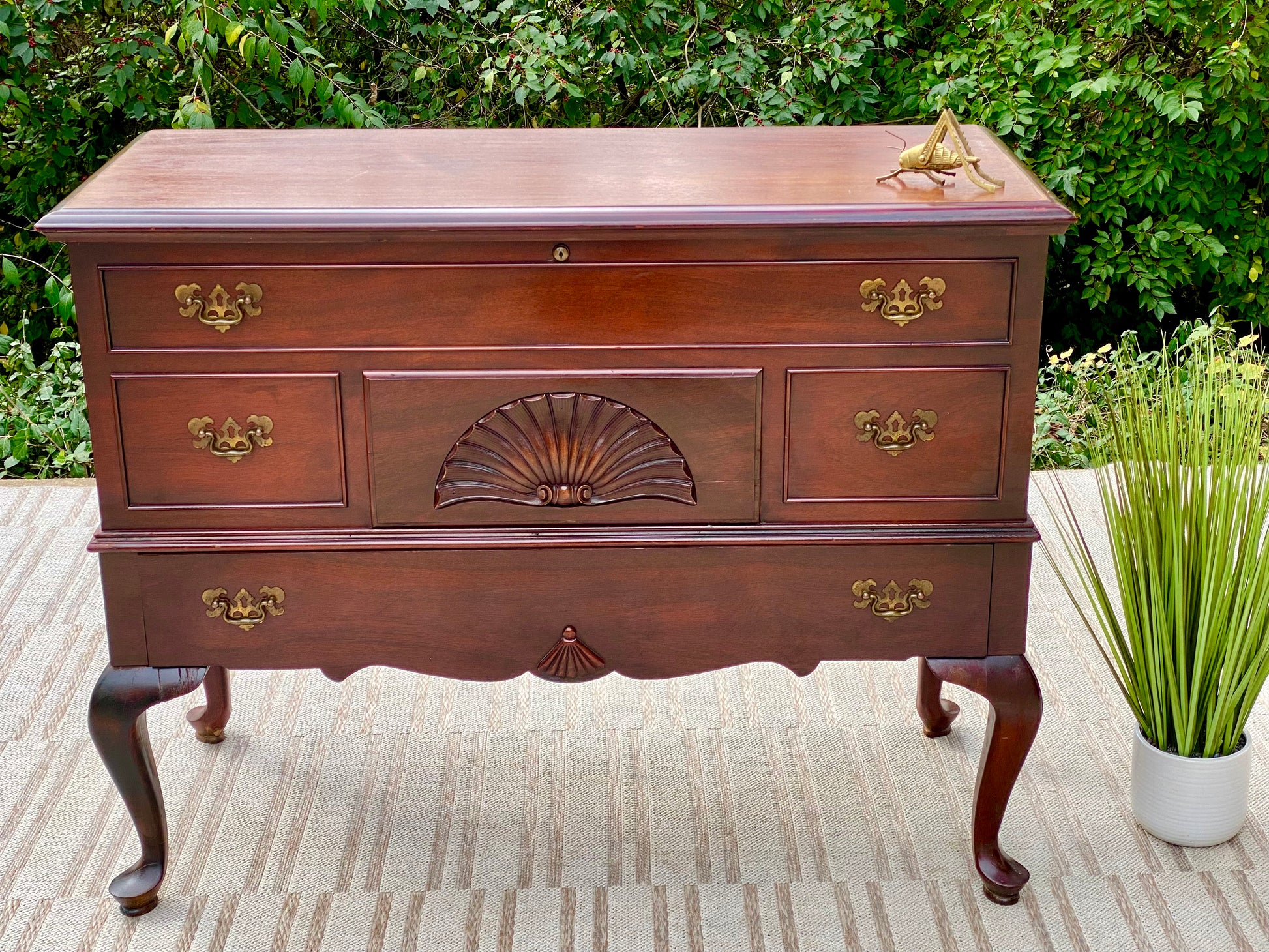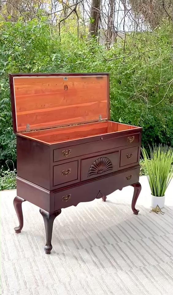 SOLD - New arrival! 🧡🍁 Check out this beautiful vintage dark stained cedar lined chest. Comes with lower drawer and tons of great storage! 35” x 44” x 19” Good condition