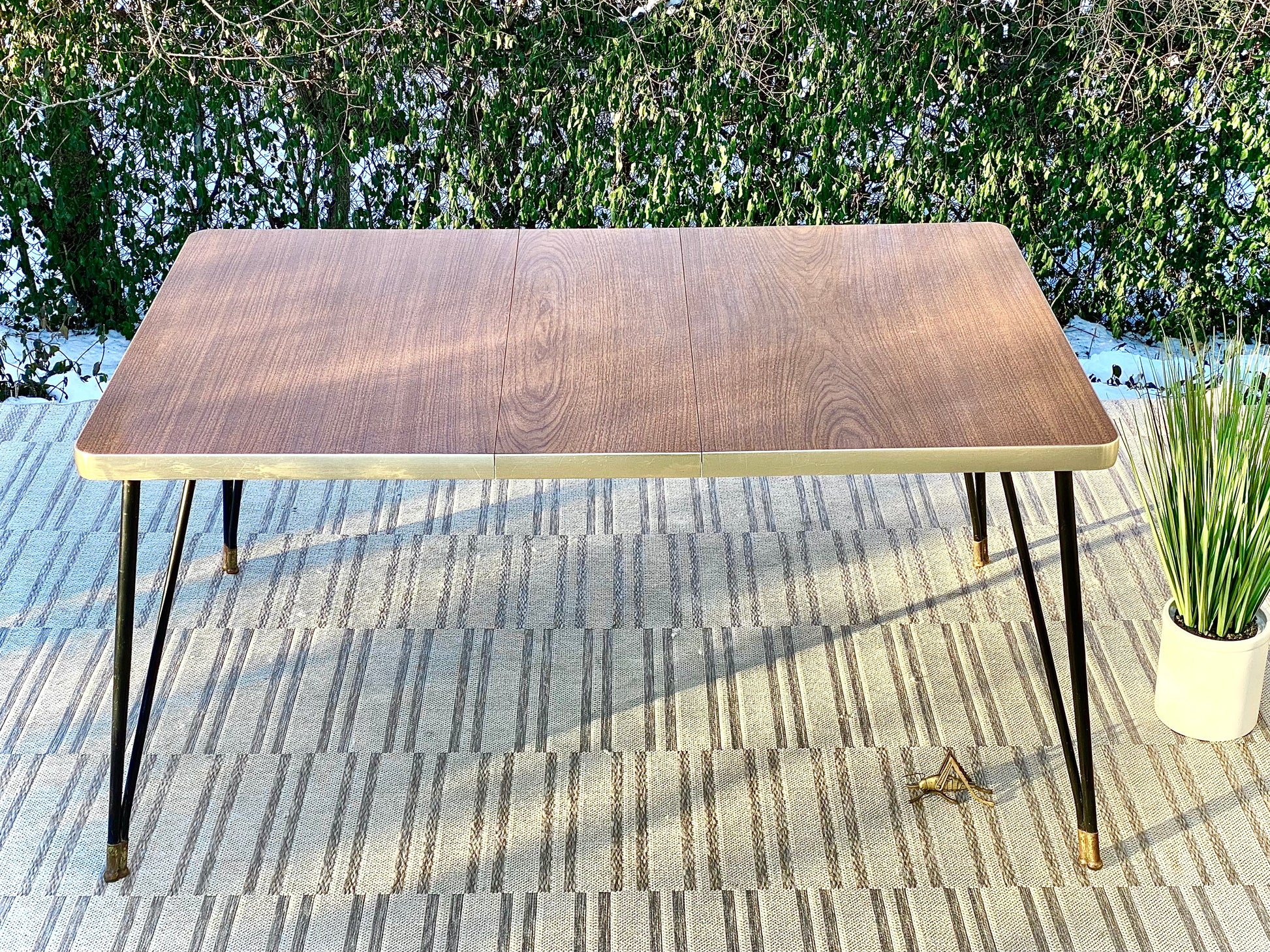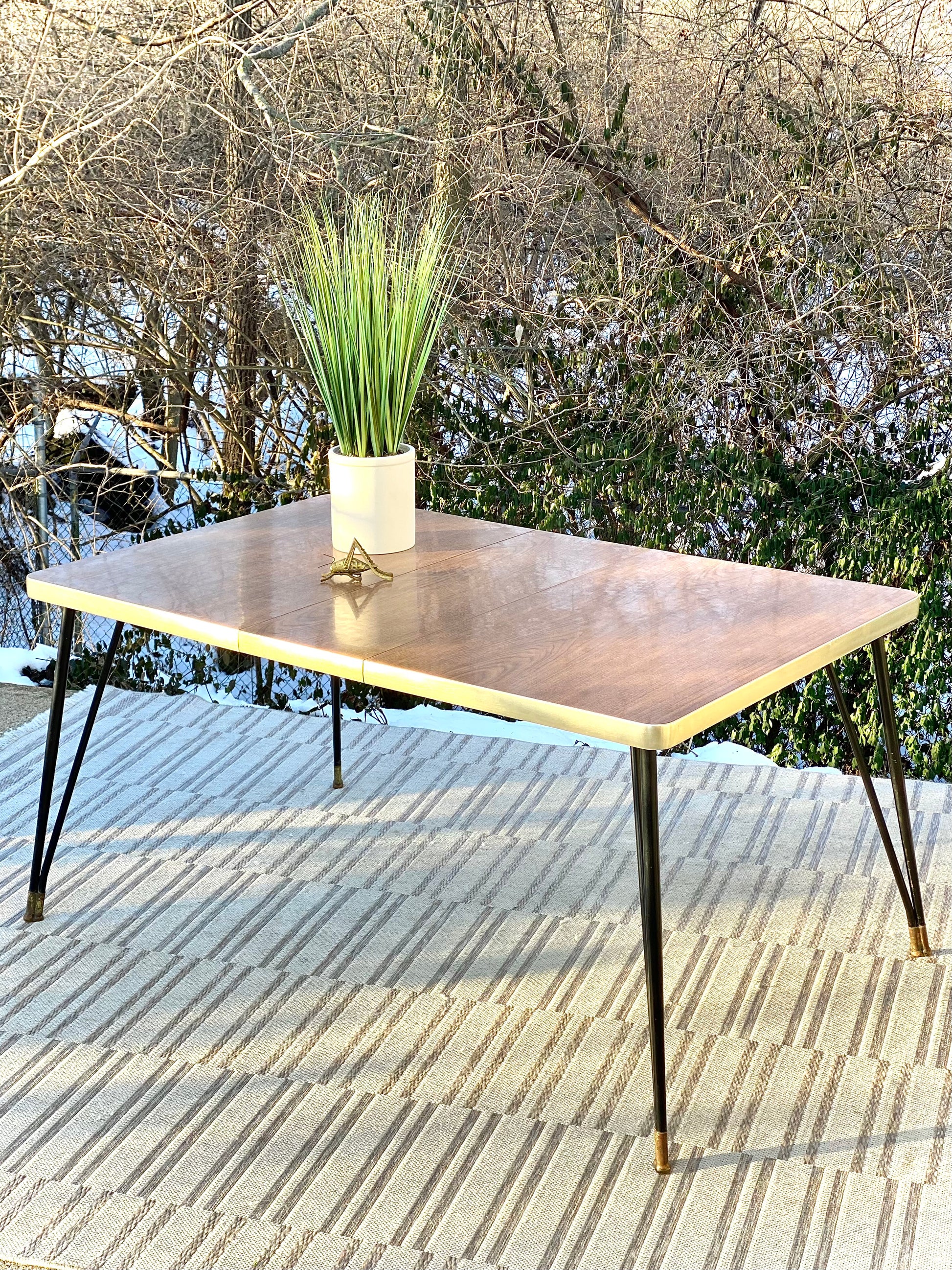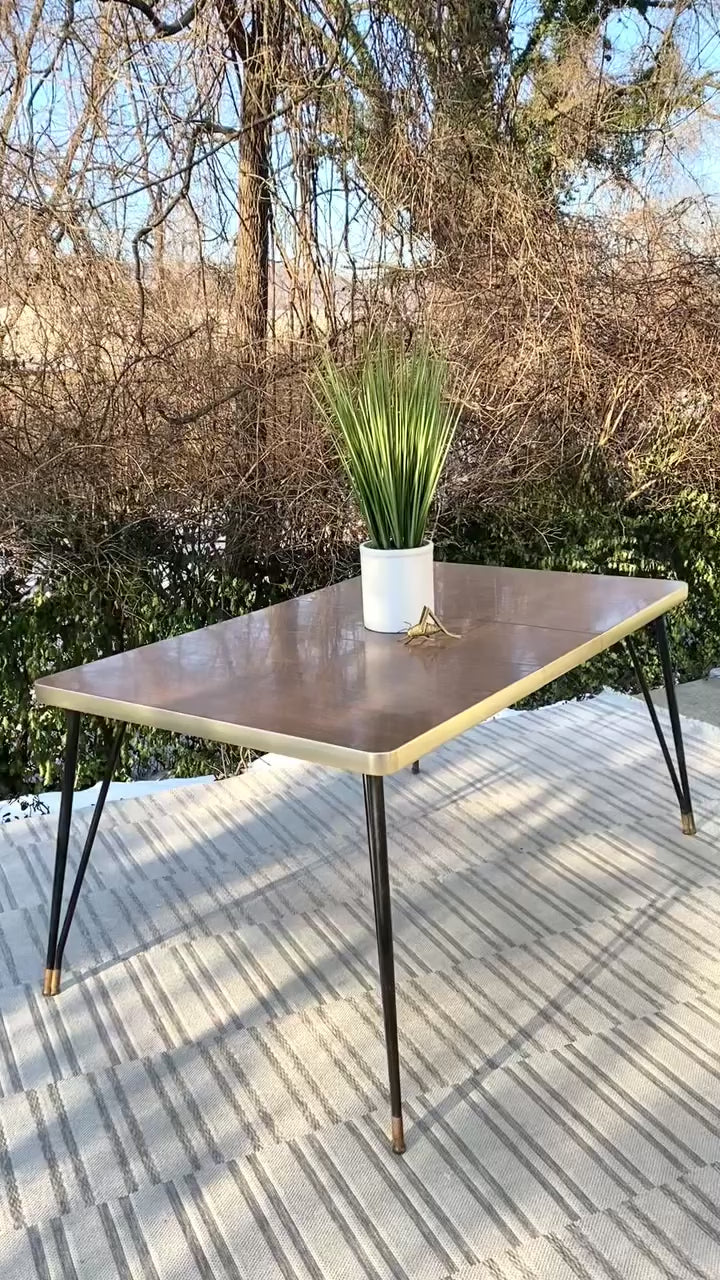 Fresh find! ❄️❄️ Check out this vintage retro Formica top table. Original metal base legs with a classic industrial vibe! Comes with original 11.5” leaf. 29” x 48” x 36” without leaf. Good condition