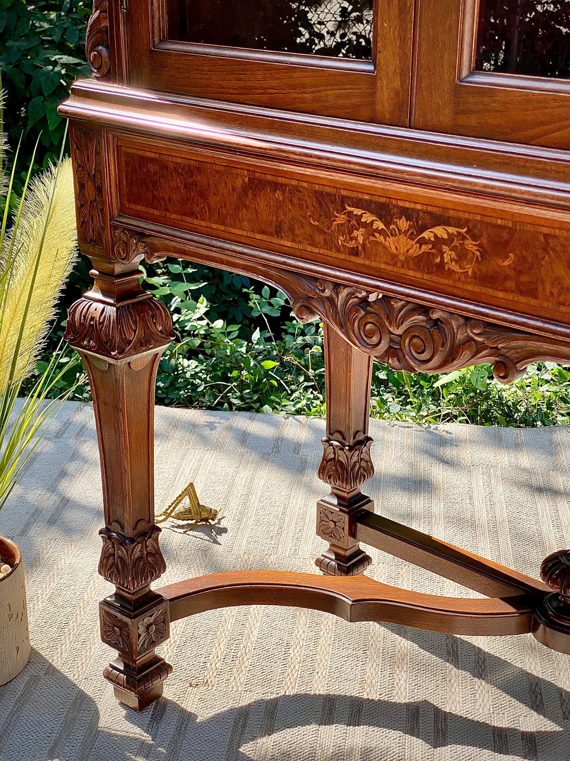 Fresh find! 🍁🍂 We can’t say enough about this original antique walnut hand carved display cabinet. Glass front doors with inside upper shelving. Lower drawer with marquetry inlay and just a beautiful overall piece. 72”h x 38” x 20” Good condition