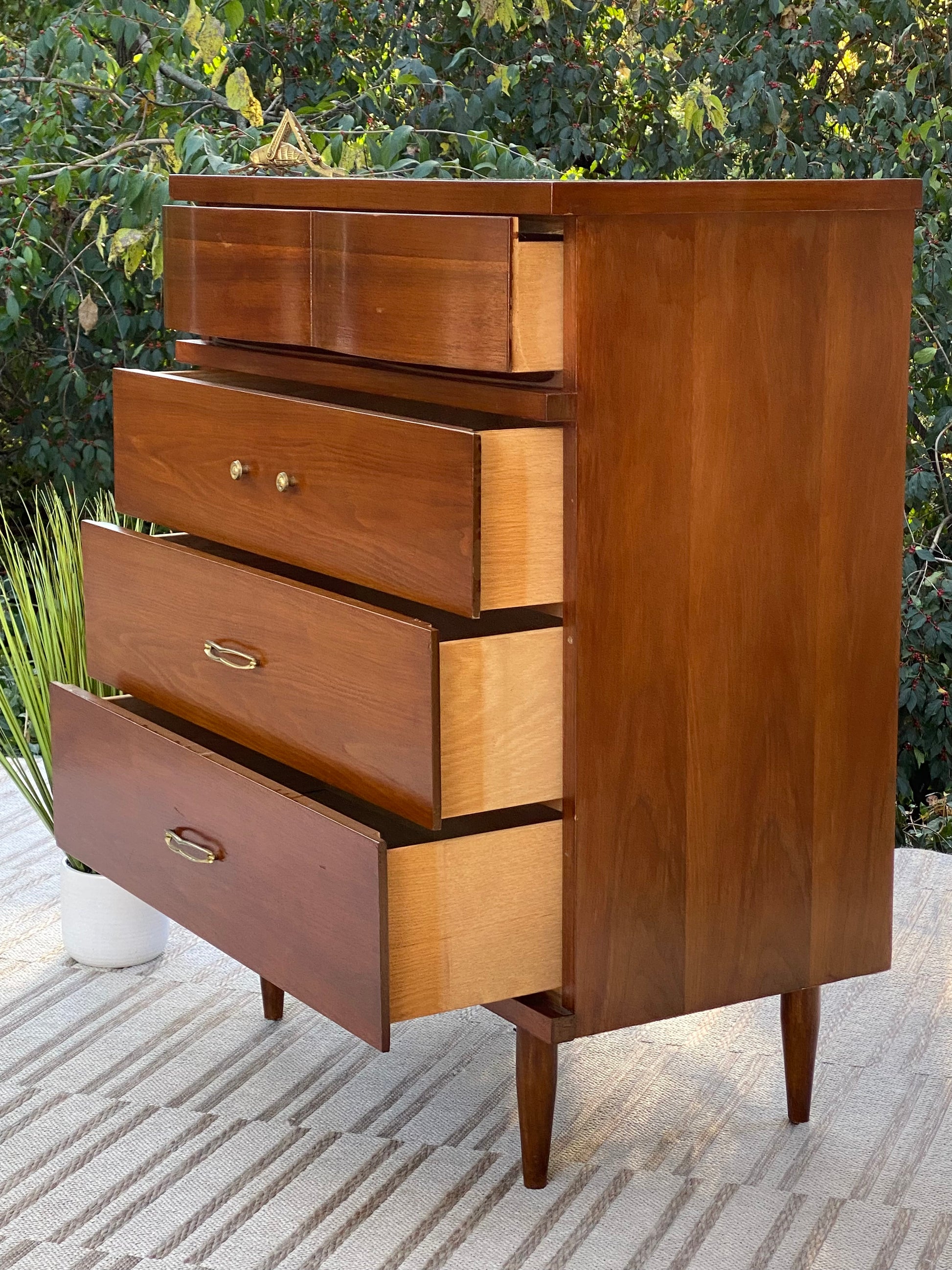 SOLD - New arrival! 🍁🧡 Check out this retro MCM mid century 4 drawer tall wooden dresser. Classic design with lots of storage in this one. We love it! 42” x 35” x 18” Good condition