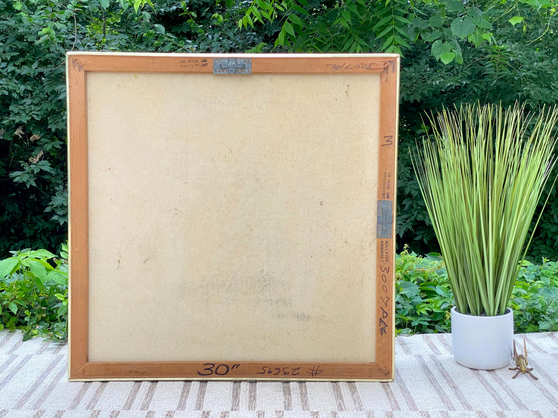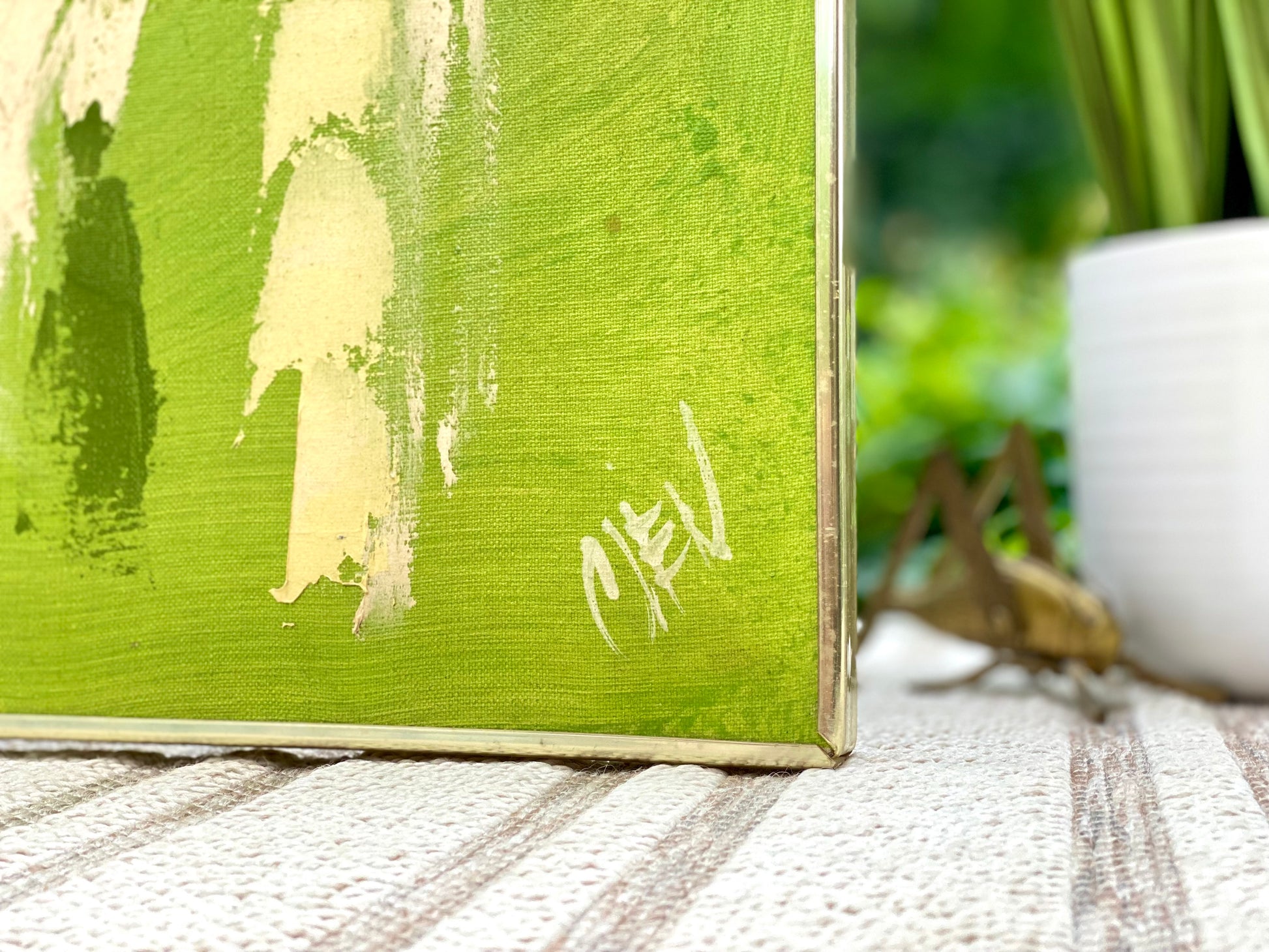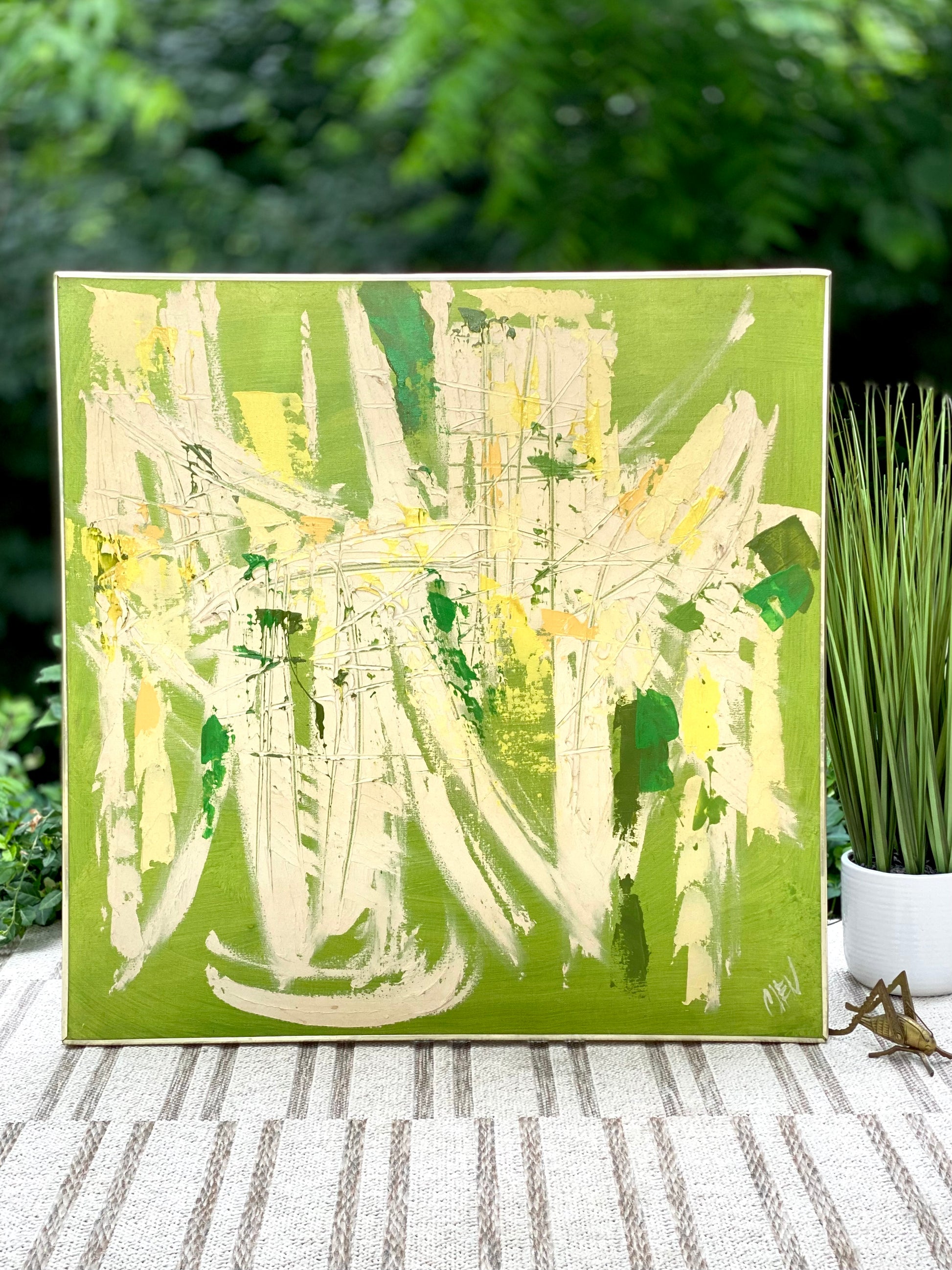 SOLD - Fantastic MCM mid century green abstract framed artwork by Cleves. 30" x 30" Good condition