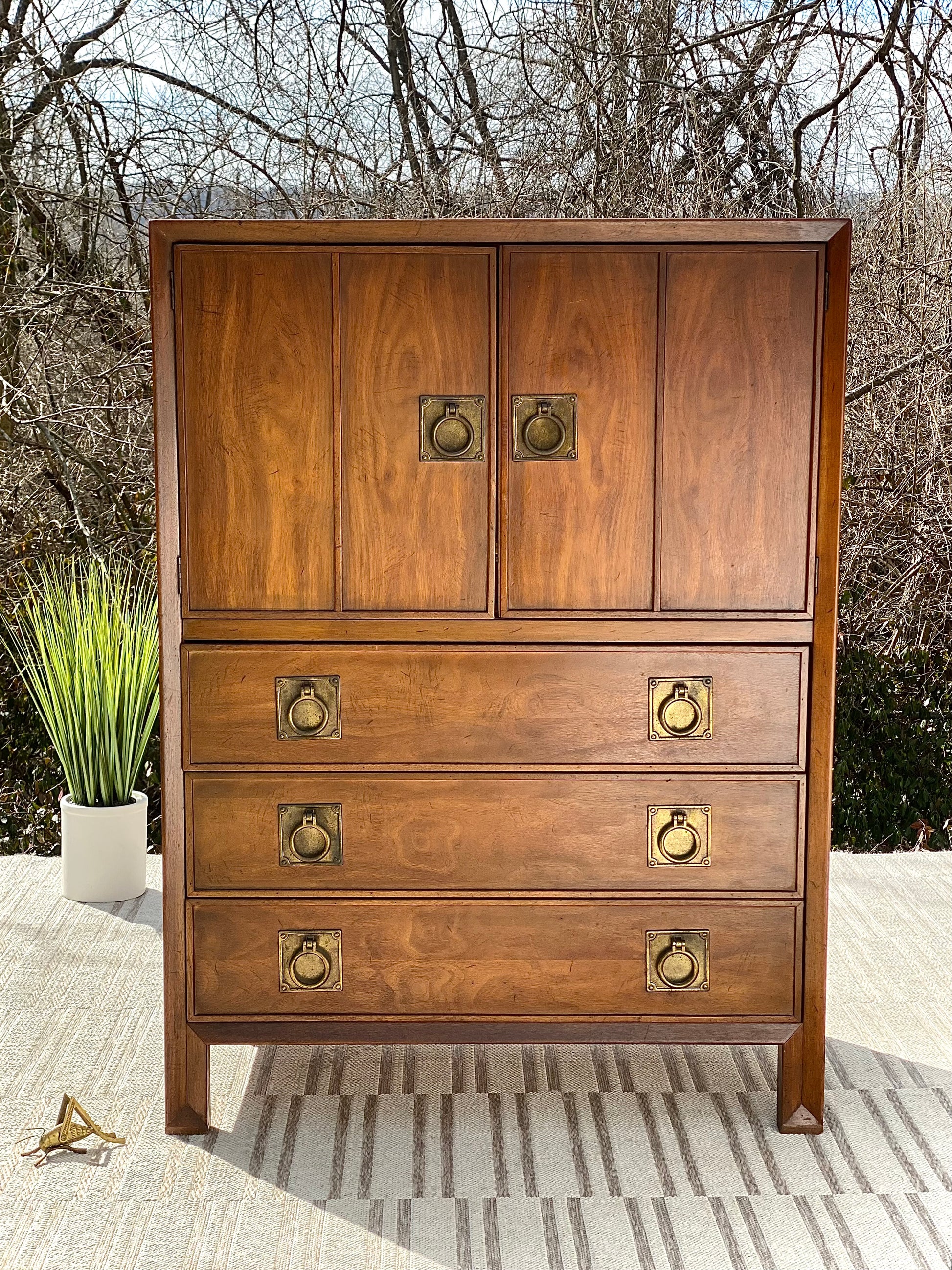 SOLD - Fresh find! 🌱❄️ We love this vintage MCM mid century modern American of Martinsville 4 drawer wooden highboy dresser. Unique design with lots of storage in this one. We love it! 52” x 38” x 19” Good condition
