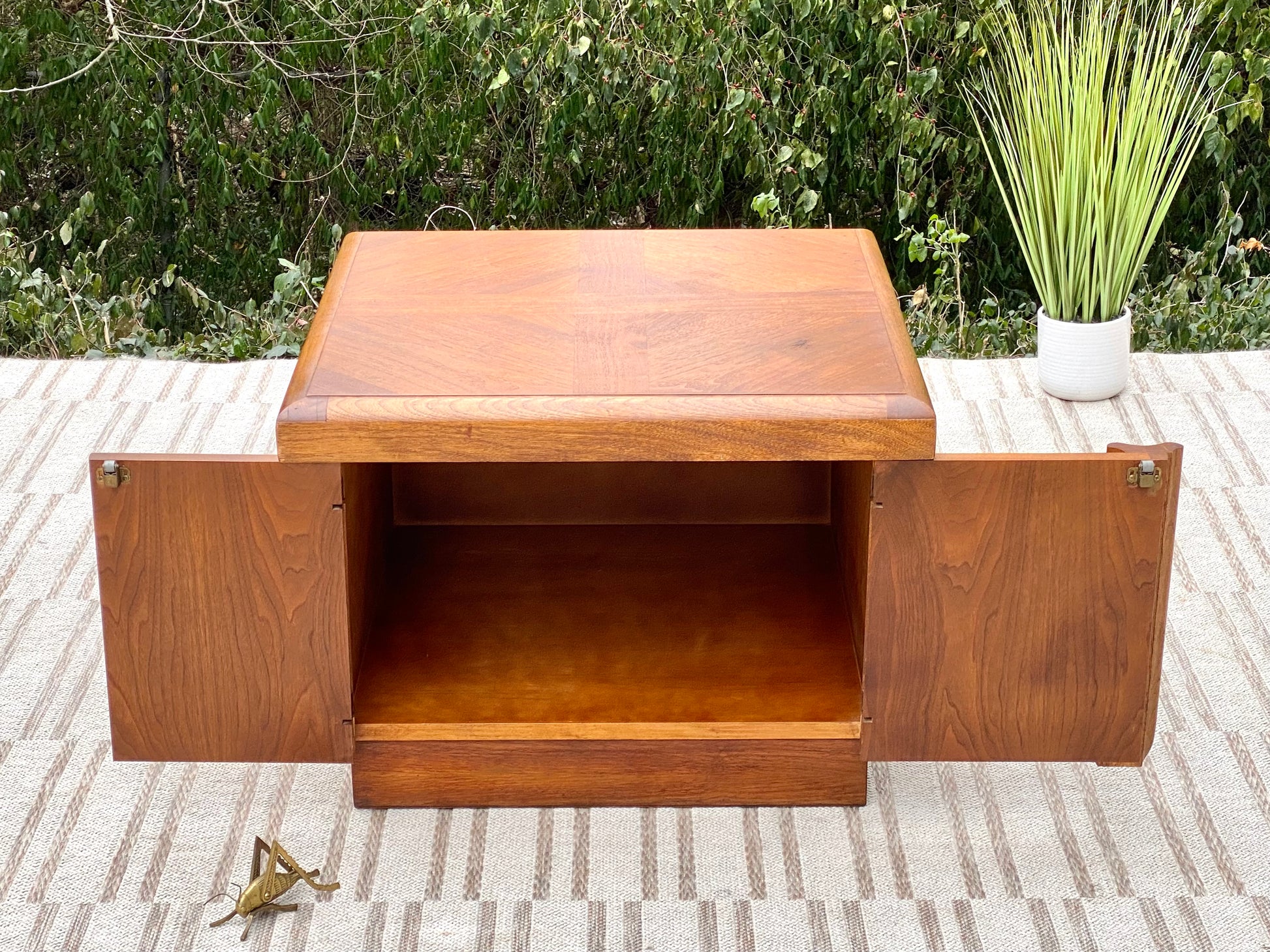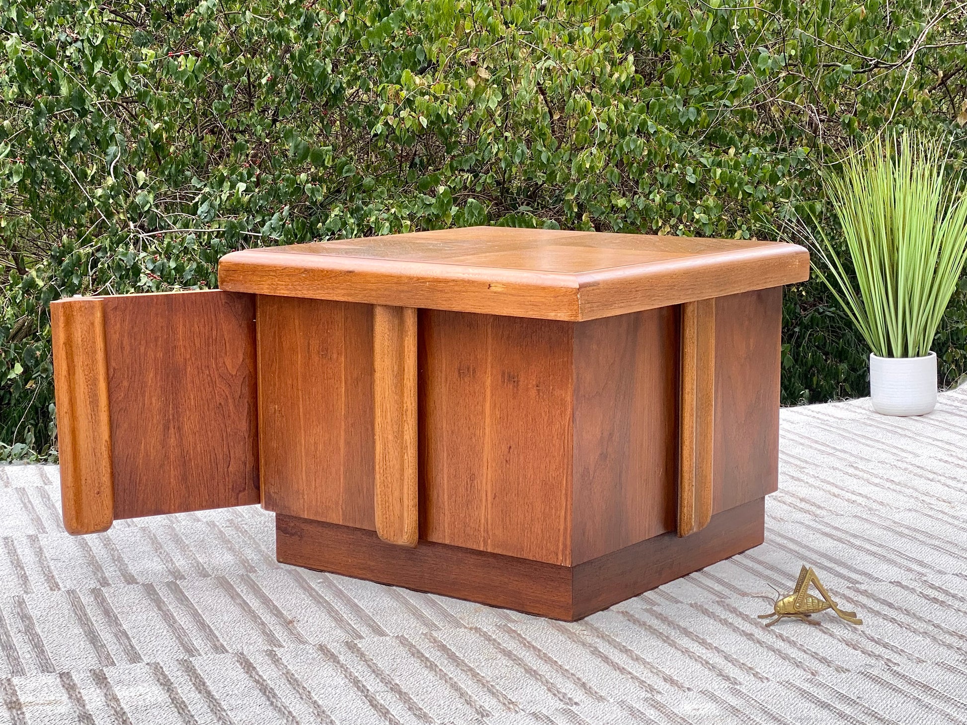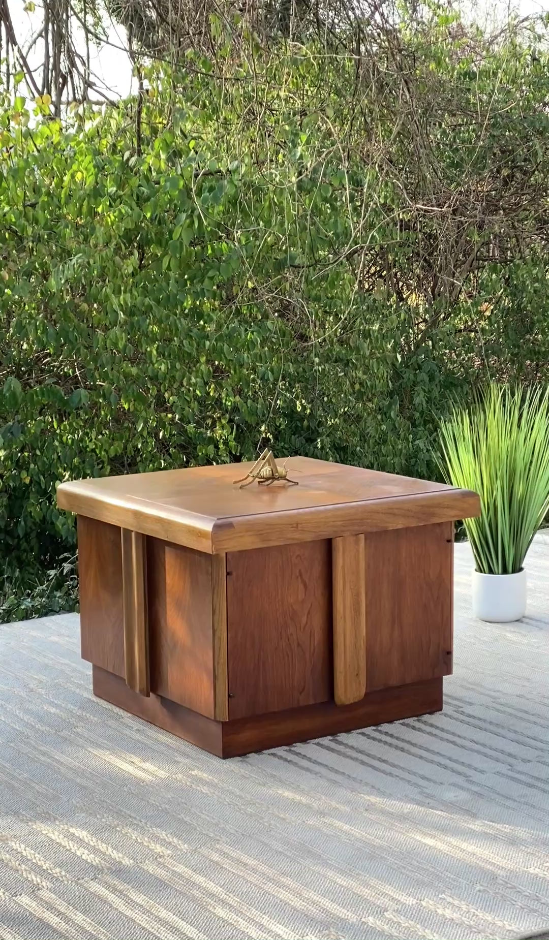 SOLD - New arrival! 🩵❄️ Check out this unique vintage MCM mid century modern walnut side table cabinet. Unique band design on top with tons of storage below. We love it! 20”h x 27” x 27” Good condition