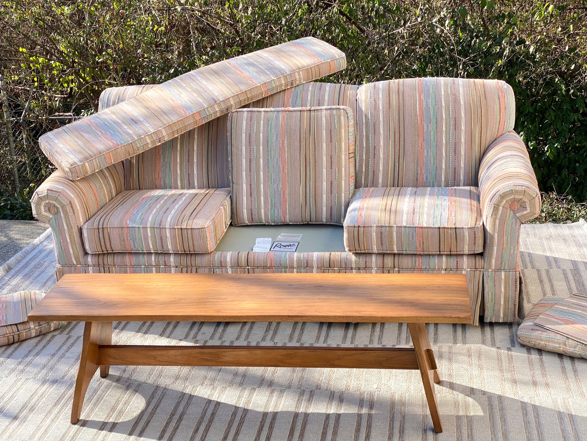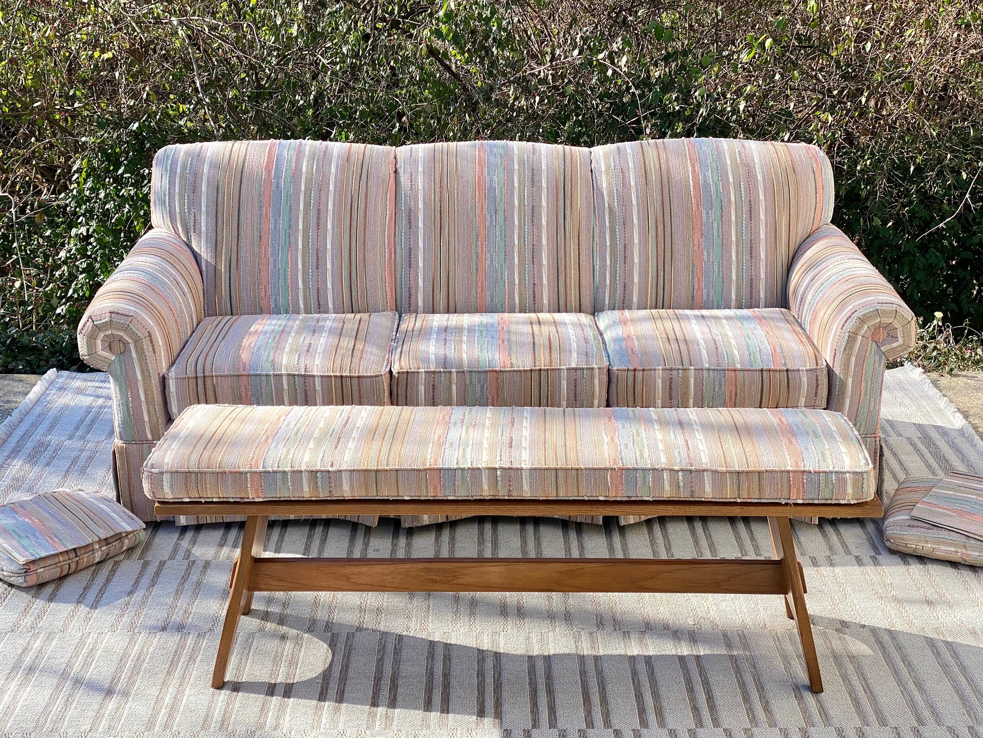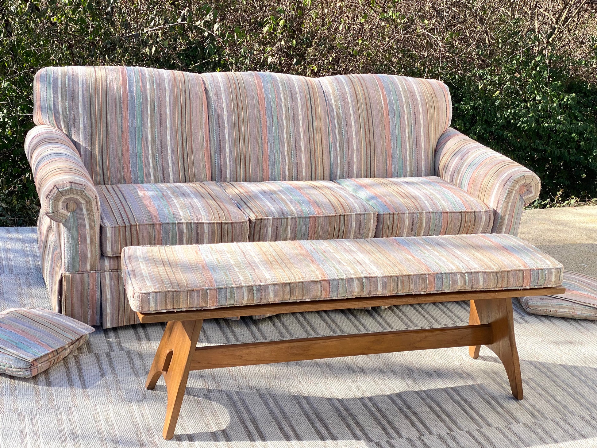 SOLD - New arrival! ❄️❄️ We love this retro MCM mid century modern fabric Rowe designer couch with matching ottoman and cushion. Clean fabric and ready to go. 36” x 84” x 34” Good condition