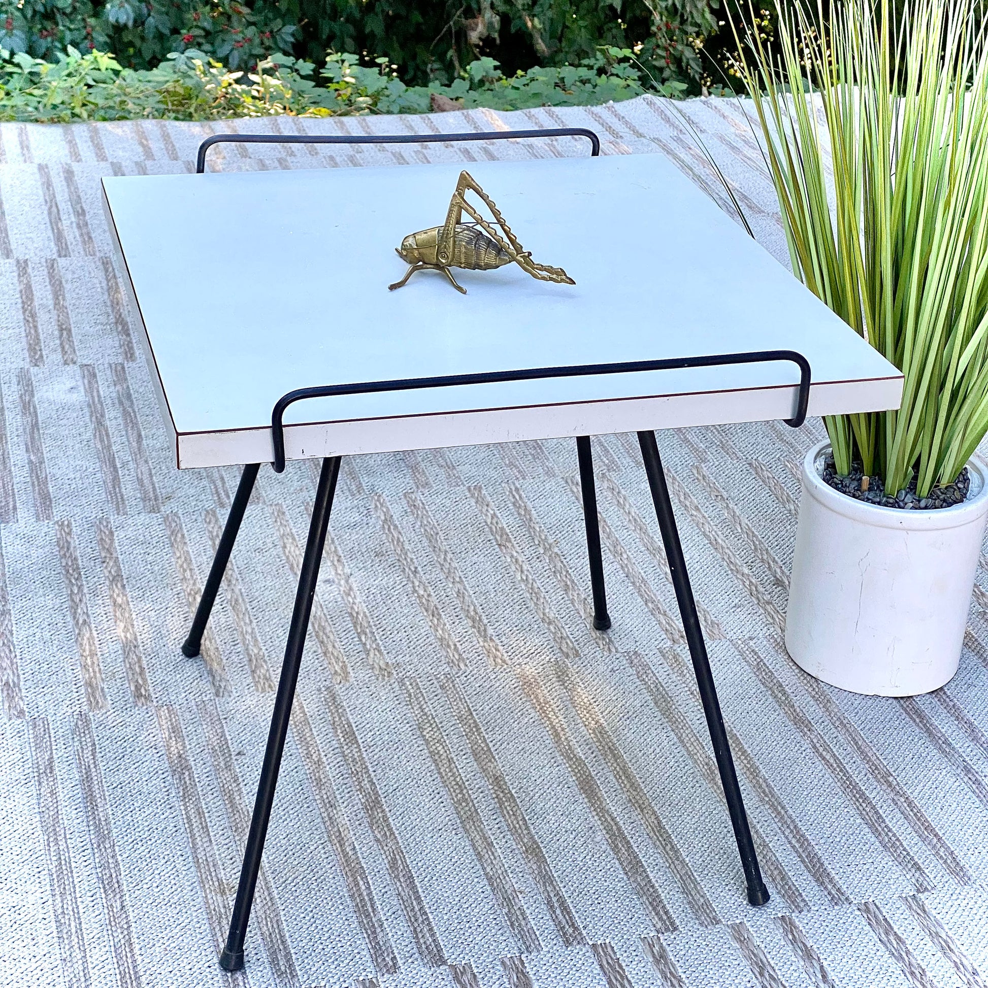 Fresh find! 🍁🍂 We love this vintage MCM mid century modern laminate side table. Classic black metal frame with square white laminate surface. We love the vibe on this one! 20”h x 20” x 21” Good condition