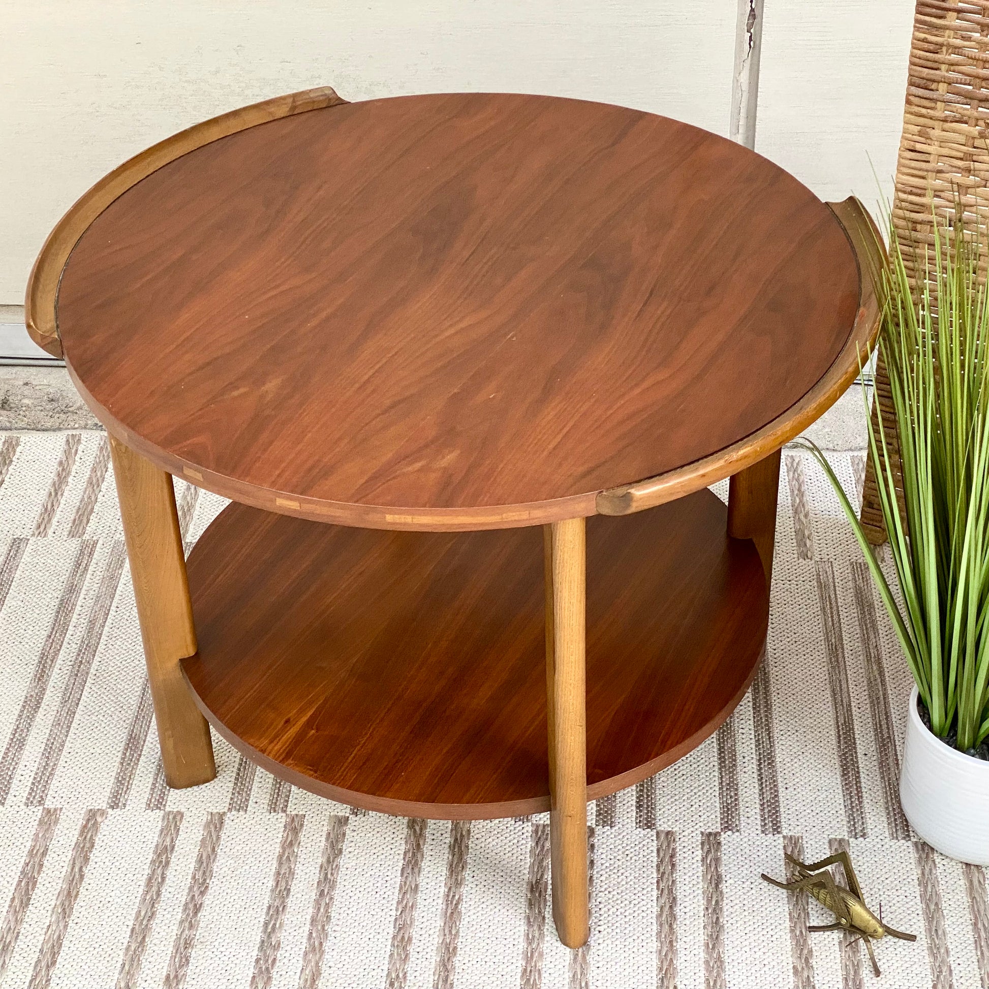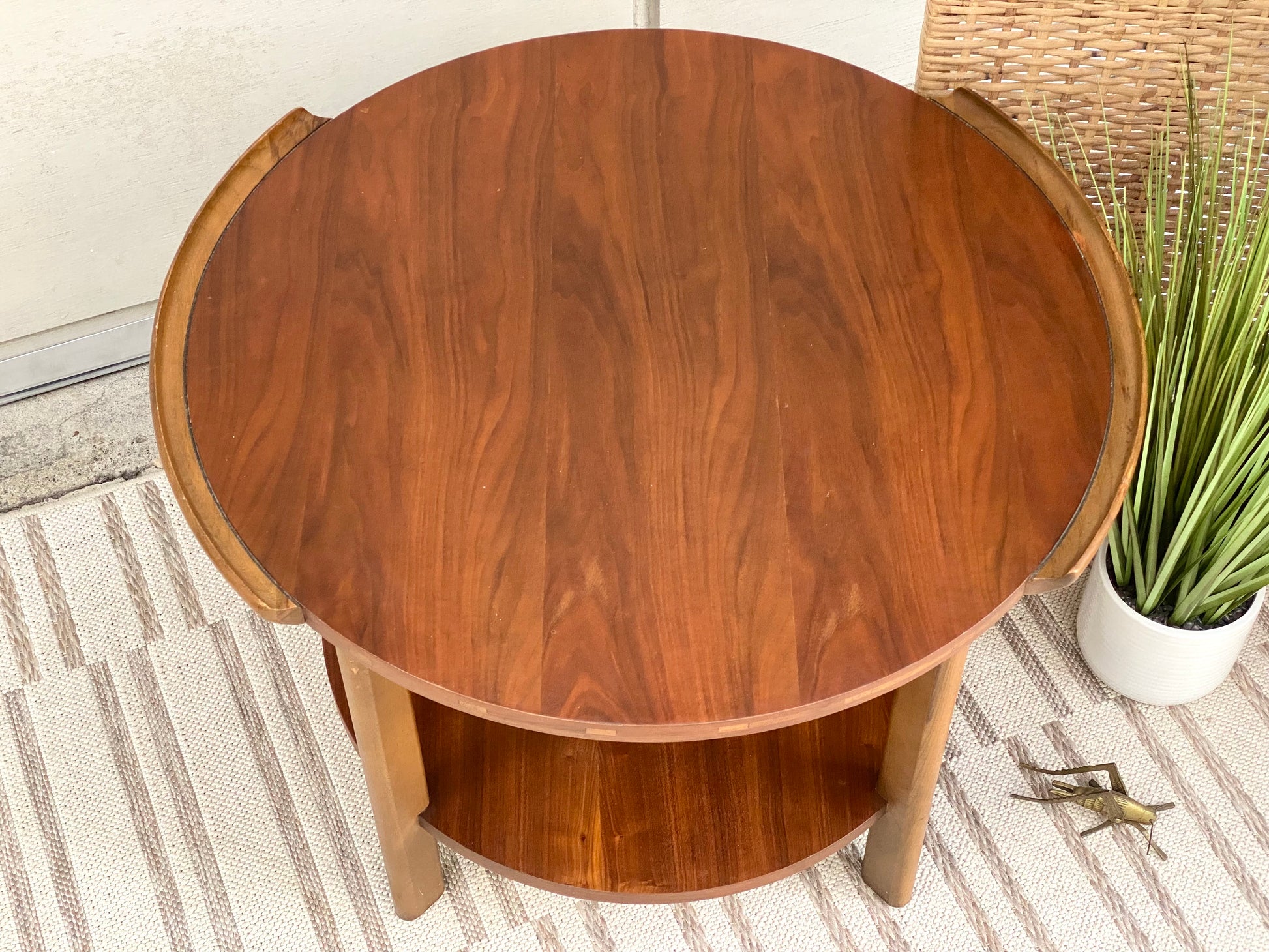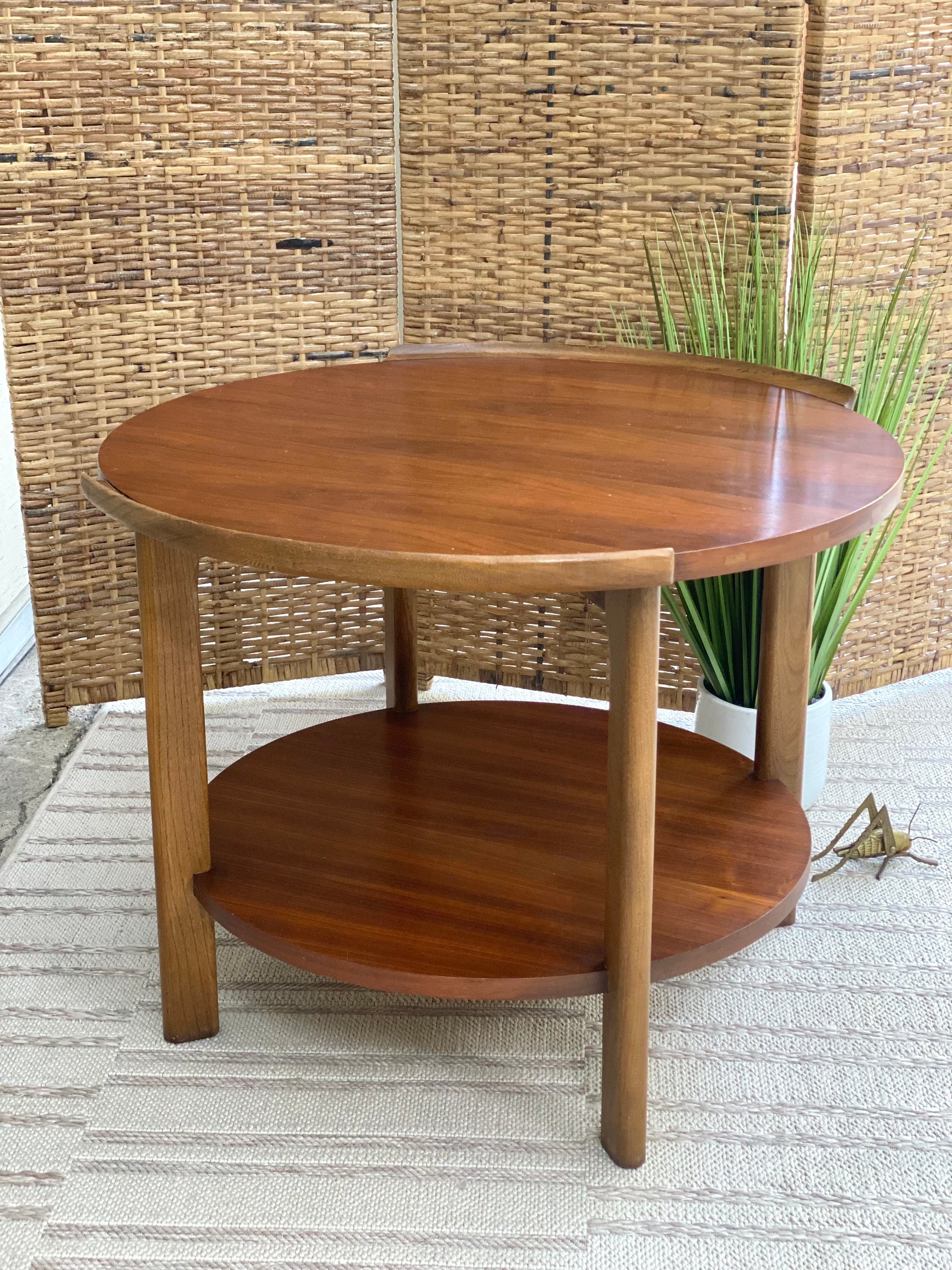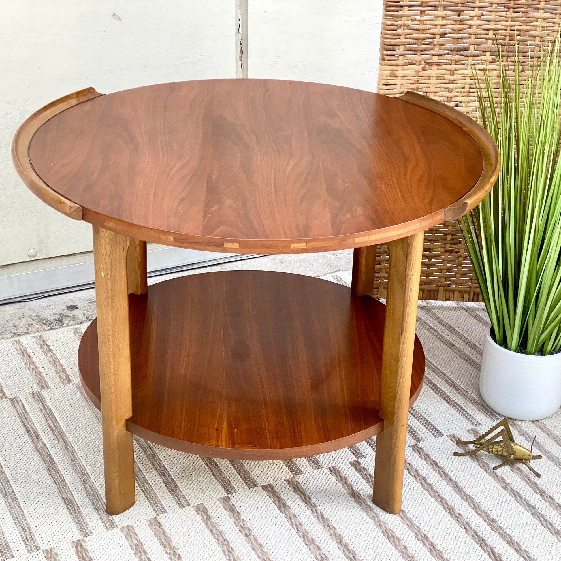 SOLD - Beautiful vintage Lane walnut occasional 2 tier side table. Round design with a classic look. 21” x 28” wide. Good condition