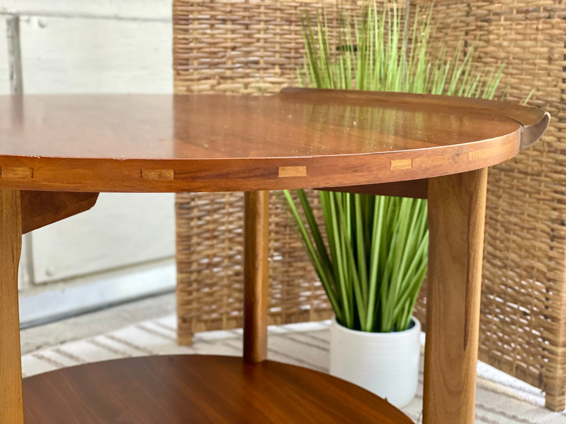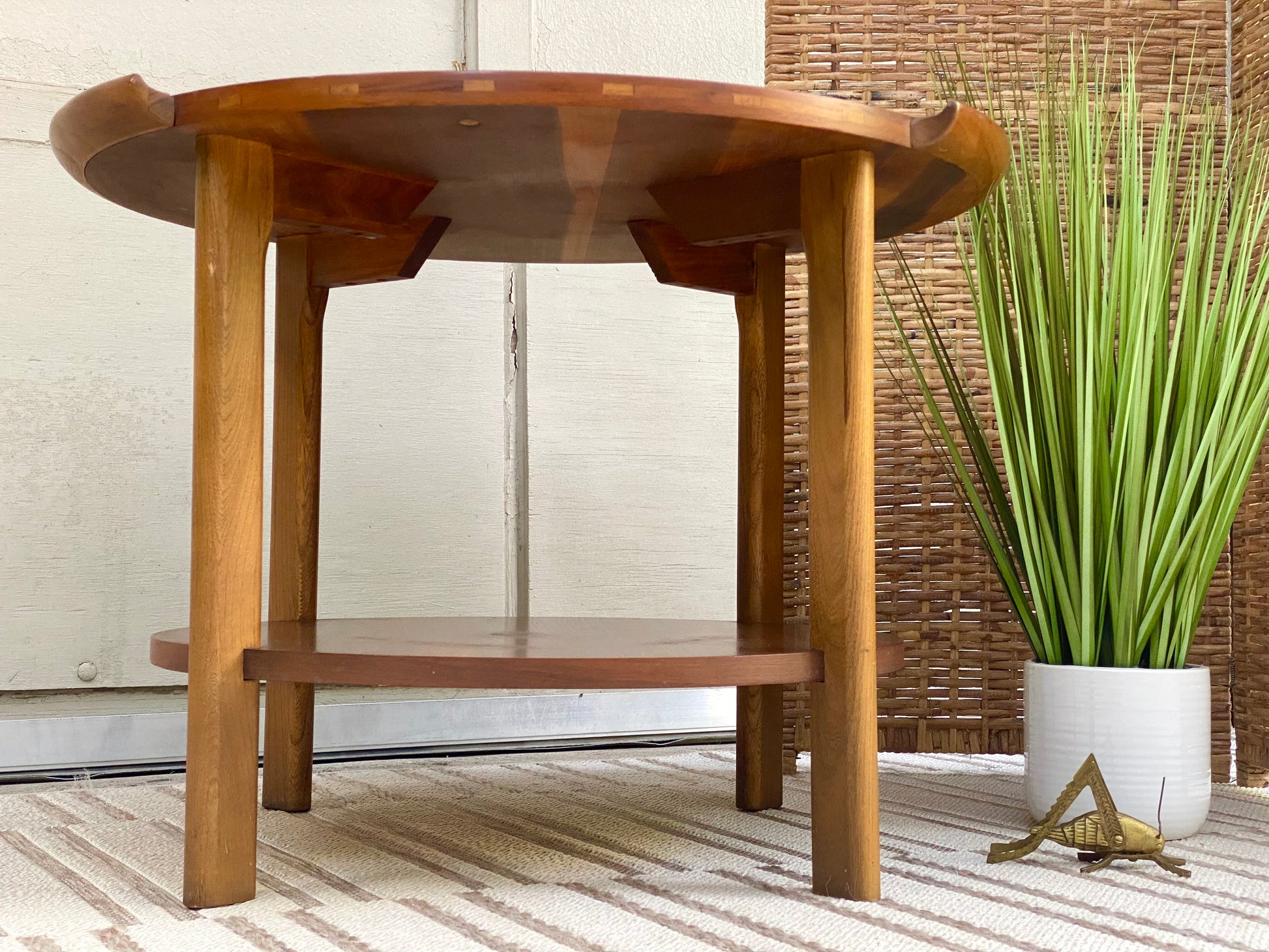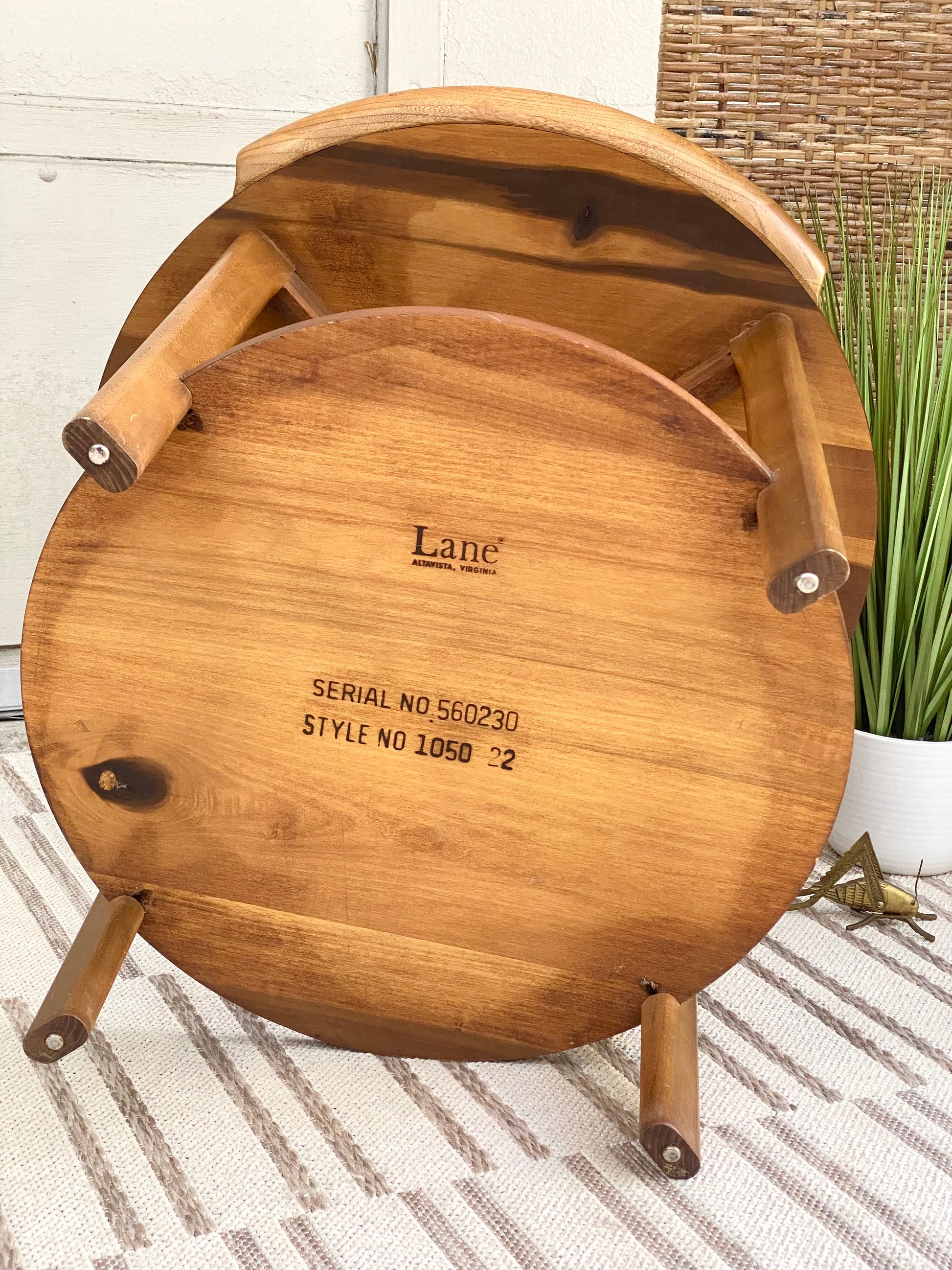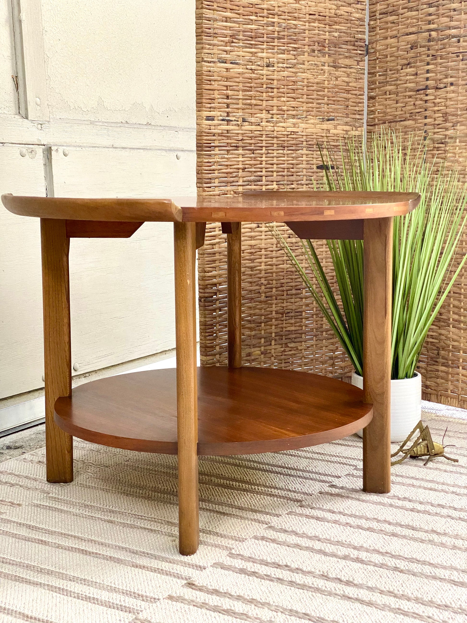 SOLD - Beautiful vintage Lane walnut occasional 2 tier side table. Round design with a classic look. 21” x 28” wide. Good condition