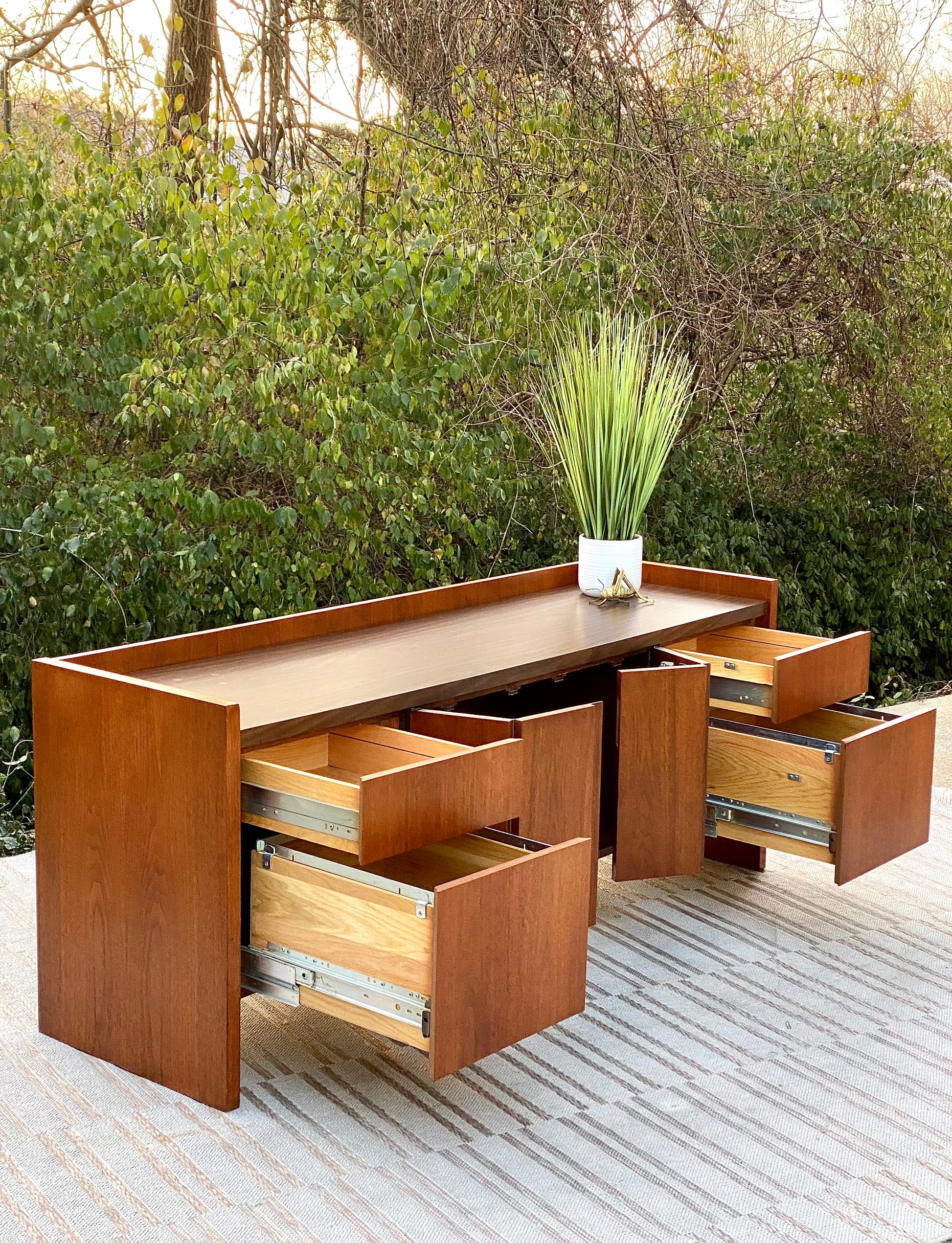 SOLD - Fresh find! 🩵❄️ We love this vintage MCM mid century modern walnut credenza by Mead Assets. Classic tones with the mid century vibe! Lots of storage and tons of uses. We are thinking hallway or mini bar! 27” x 66” x 19” Good condition