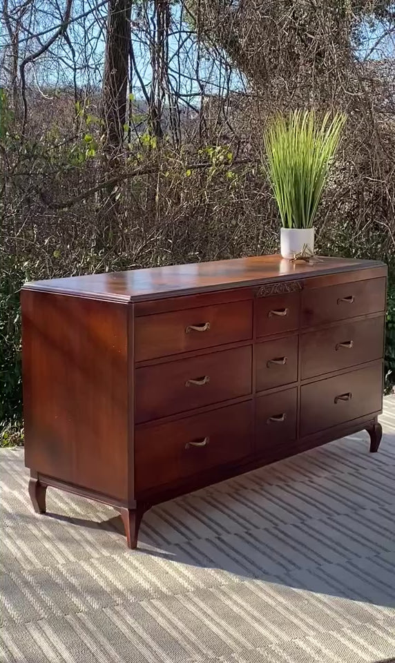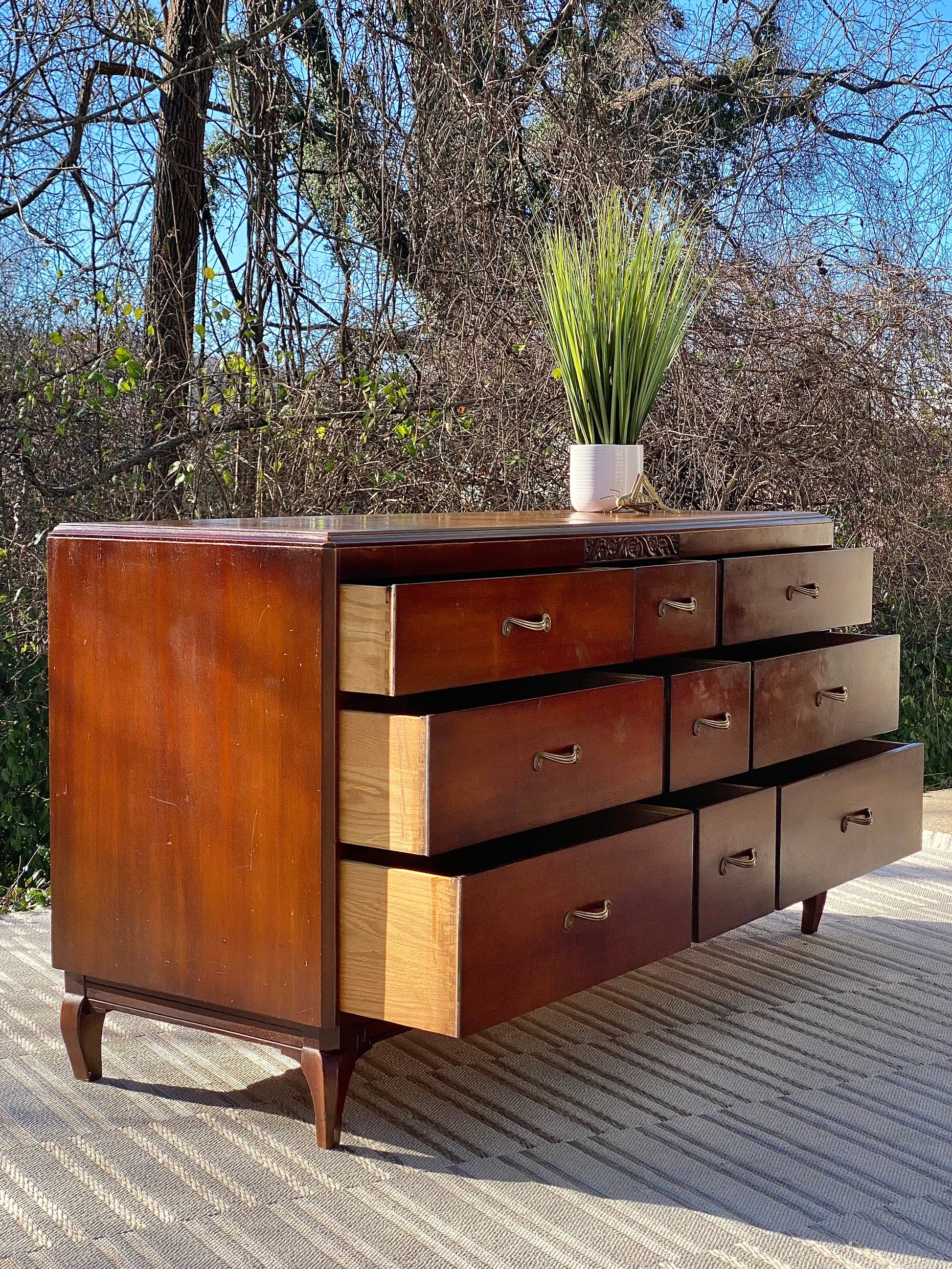 SOLD - Newest arrival! ❄️☃️ Check out this vintage MCM mid century modern R-Way 9 drawer dresser. Slight curved details with original brass pulls. 34” x 61” x 23” Good condition