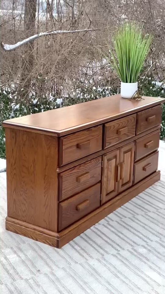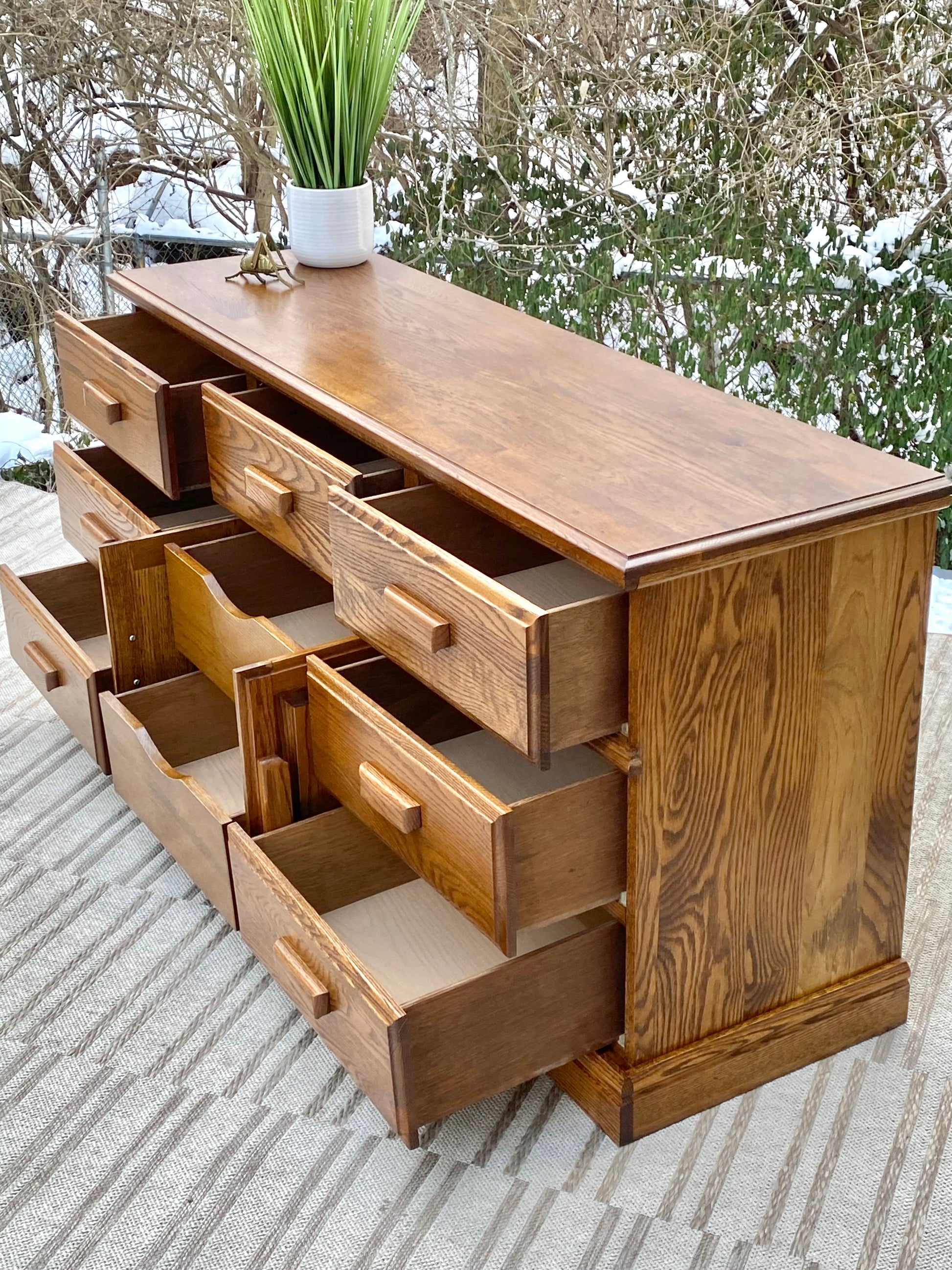 SOLD - New arrival! ❄️❄️ Check out this vintage oak 9 drawer, long dresser. Medium stain with a classic vibe! 30” x 62” x 18” Good condition