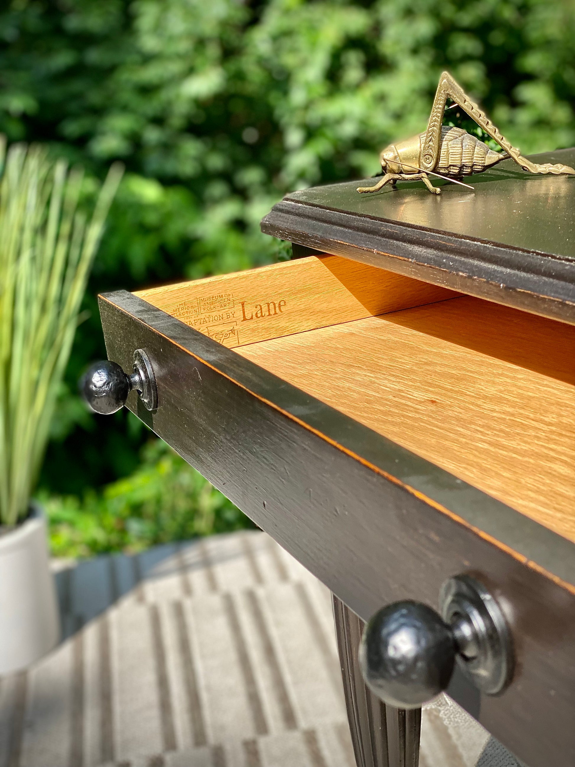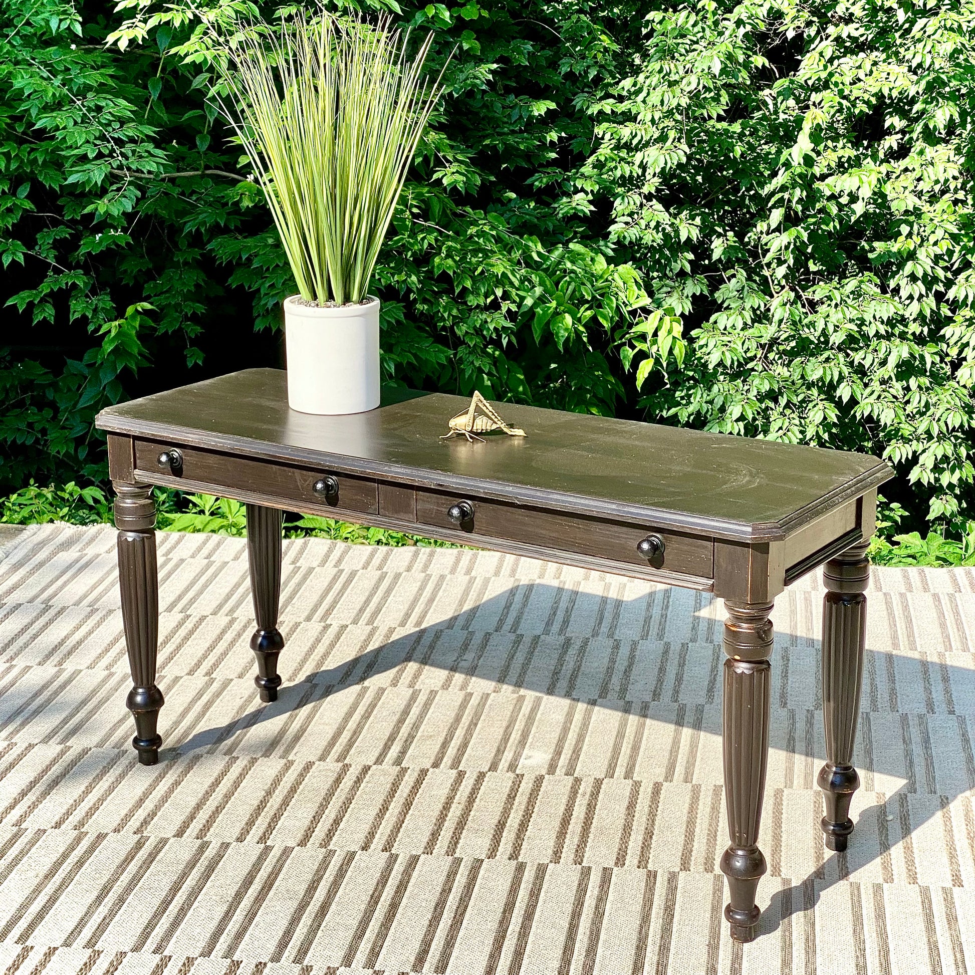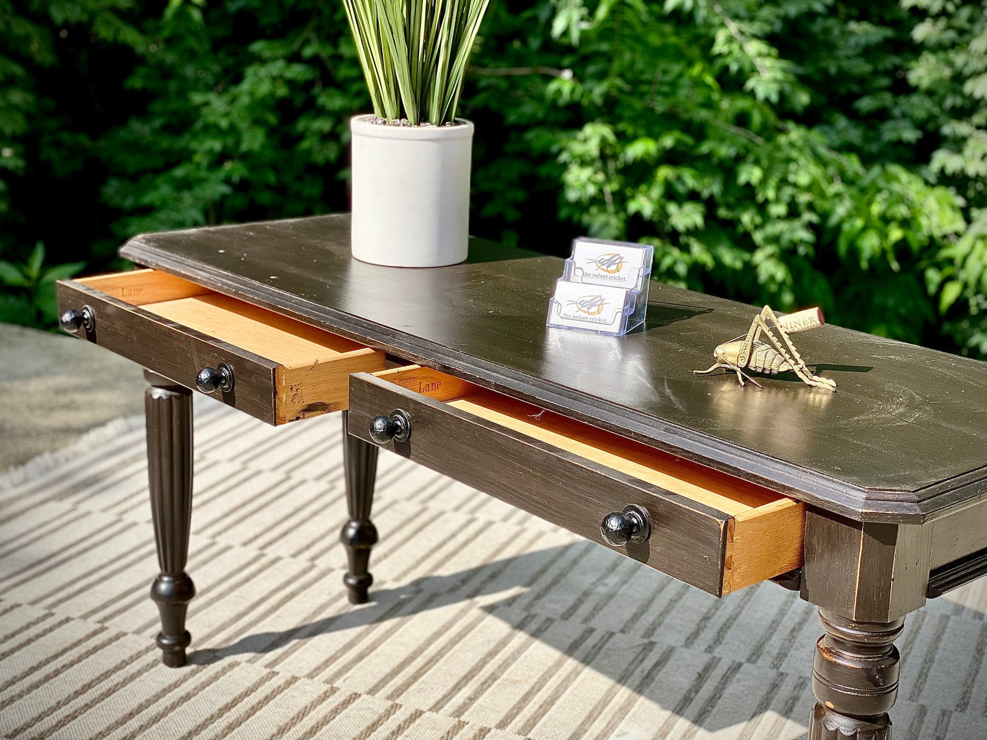 SOLD - Fresh find! 🪴🌱 Check out the vintage black painted Lane hallway table. classic design with two little drawers for storage. Great piece for a hallway with a piece of art above it. 28” x 56” x 21” Good condition