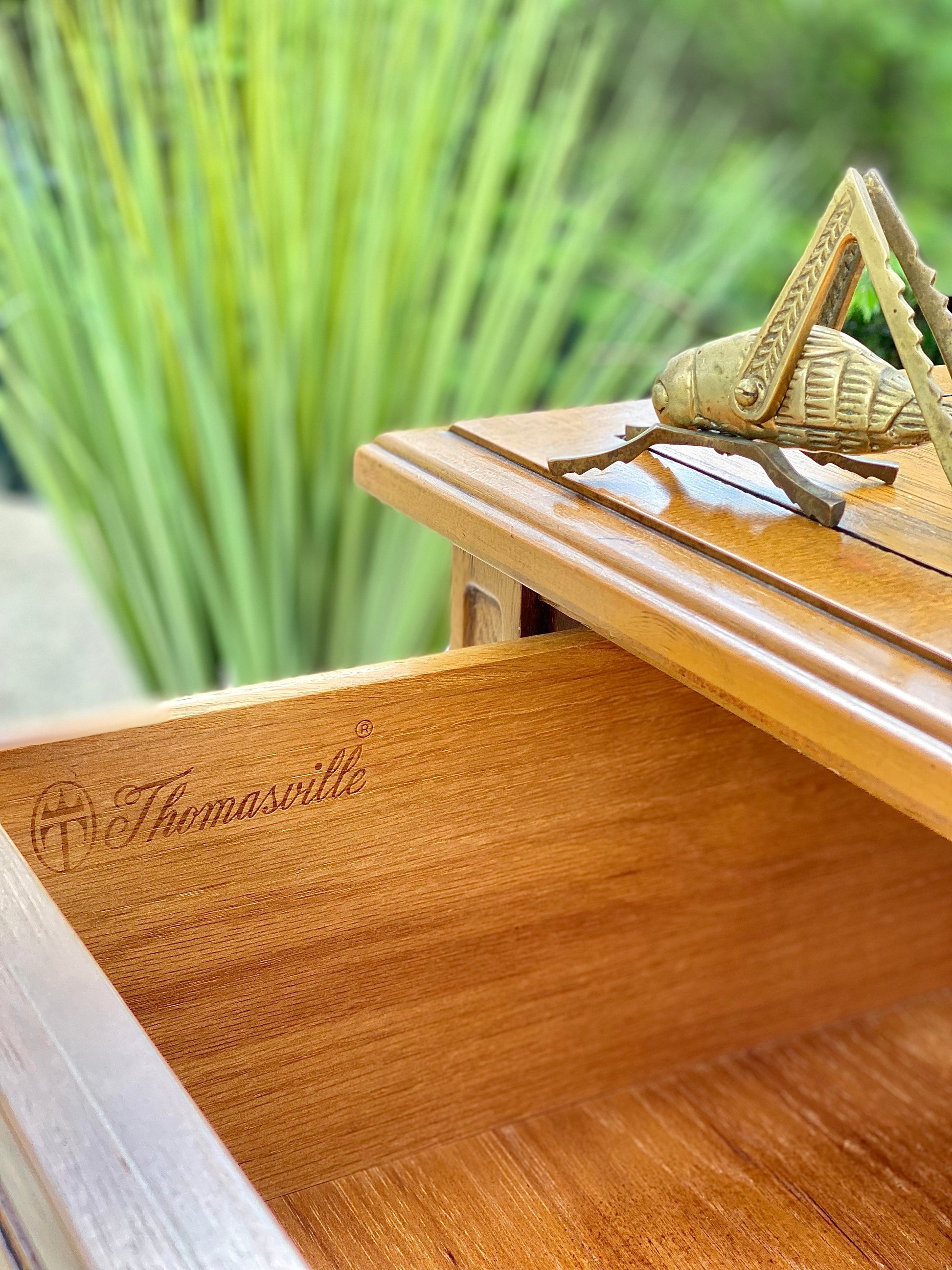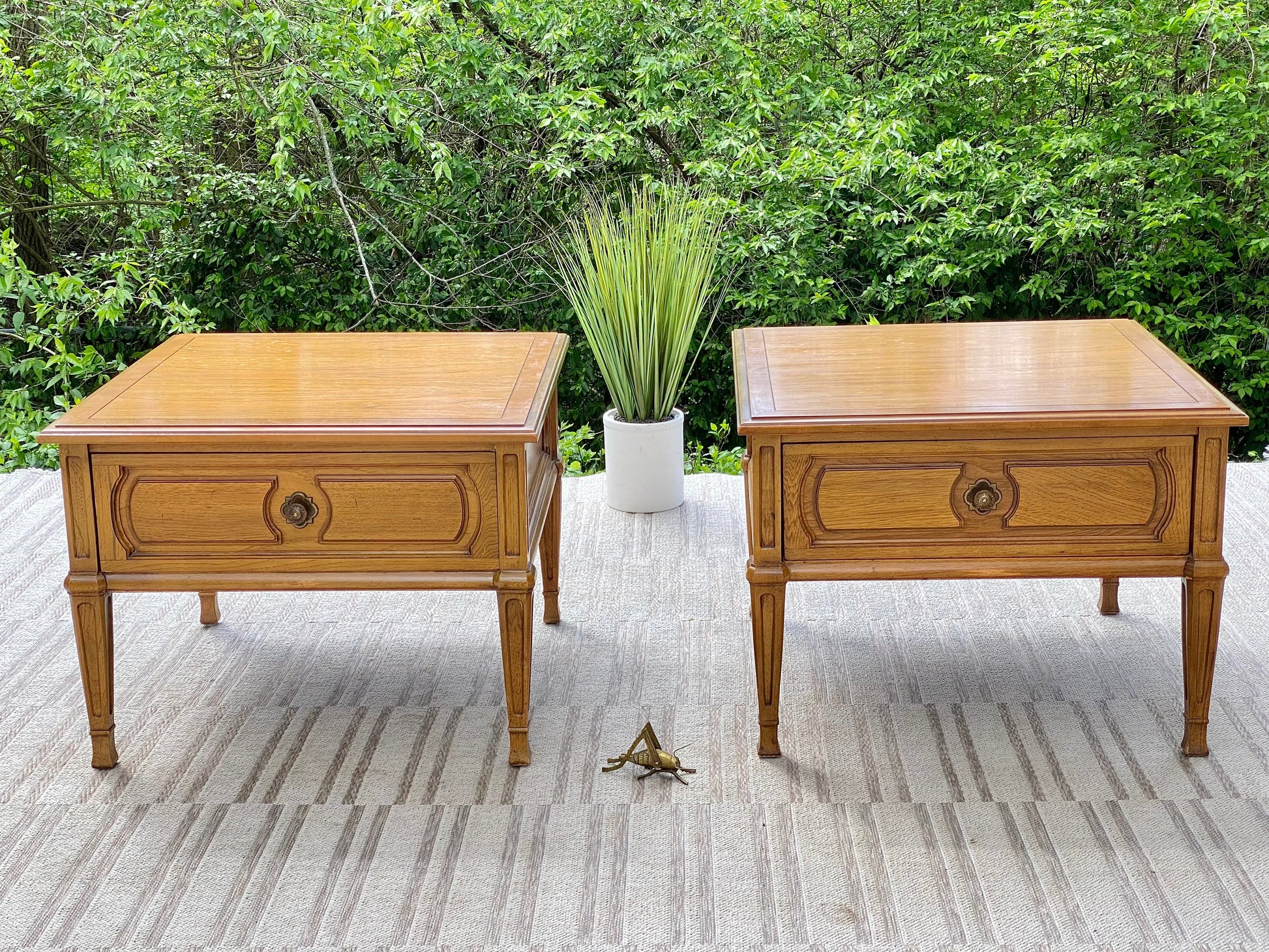 SOLD - Fresh find! 🌱❄️ We love this pair of vintage Thomasville wooden side tables. Each comes with a small drawer for storage. Nice warm tones and we love them! 21”h X 28” x 28” Good condition