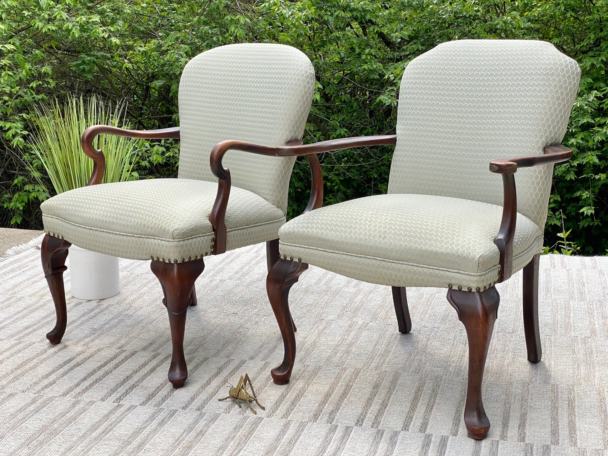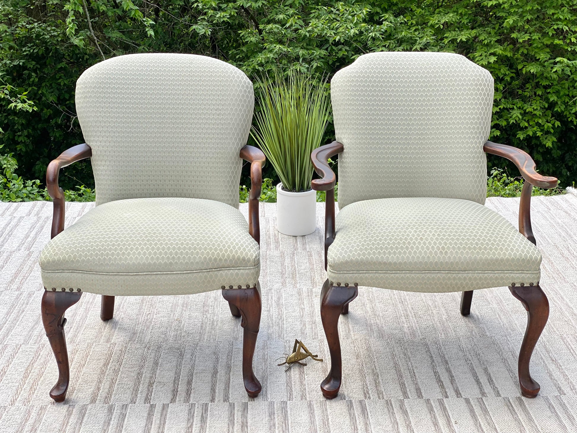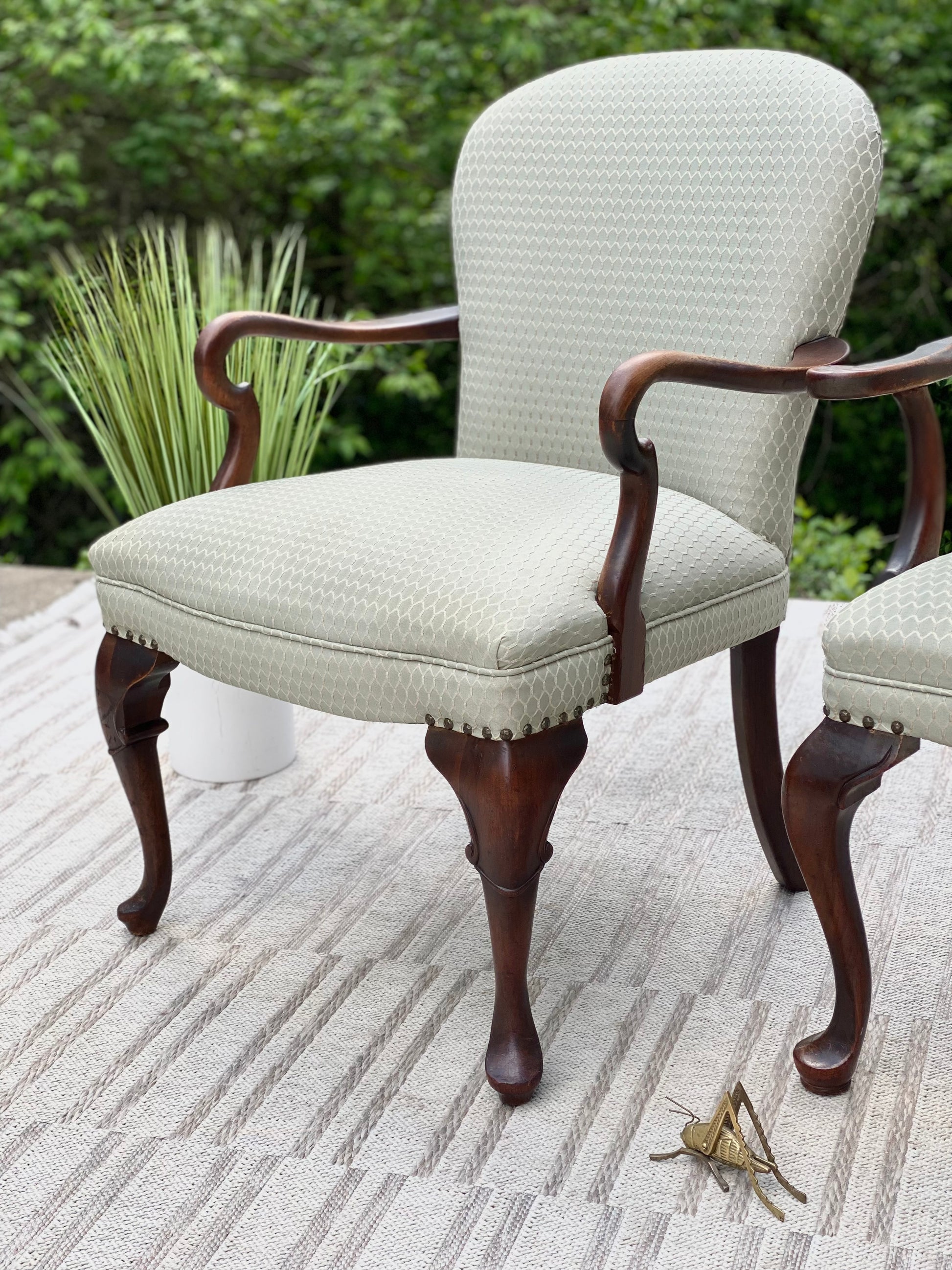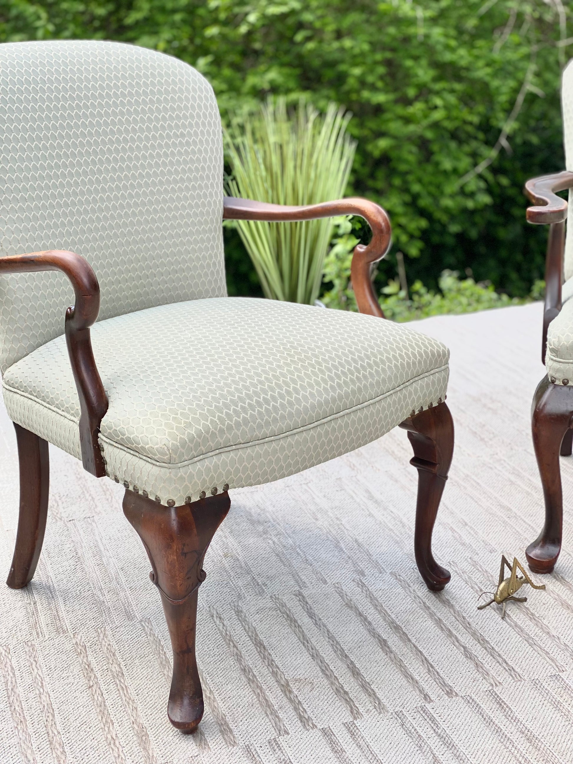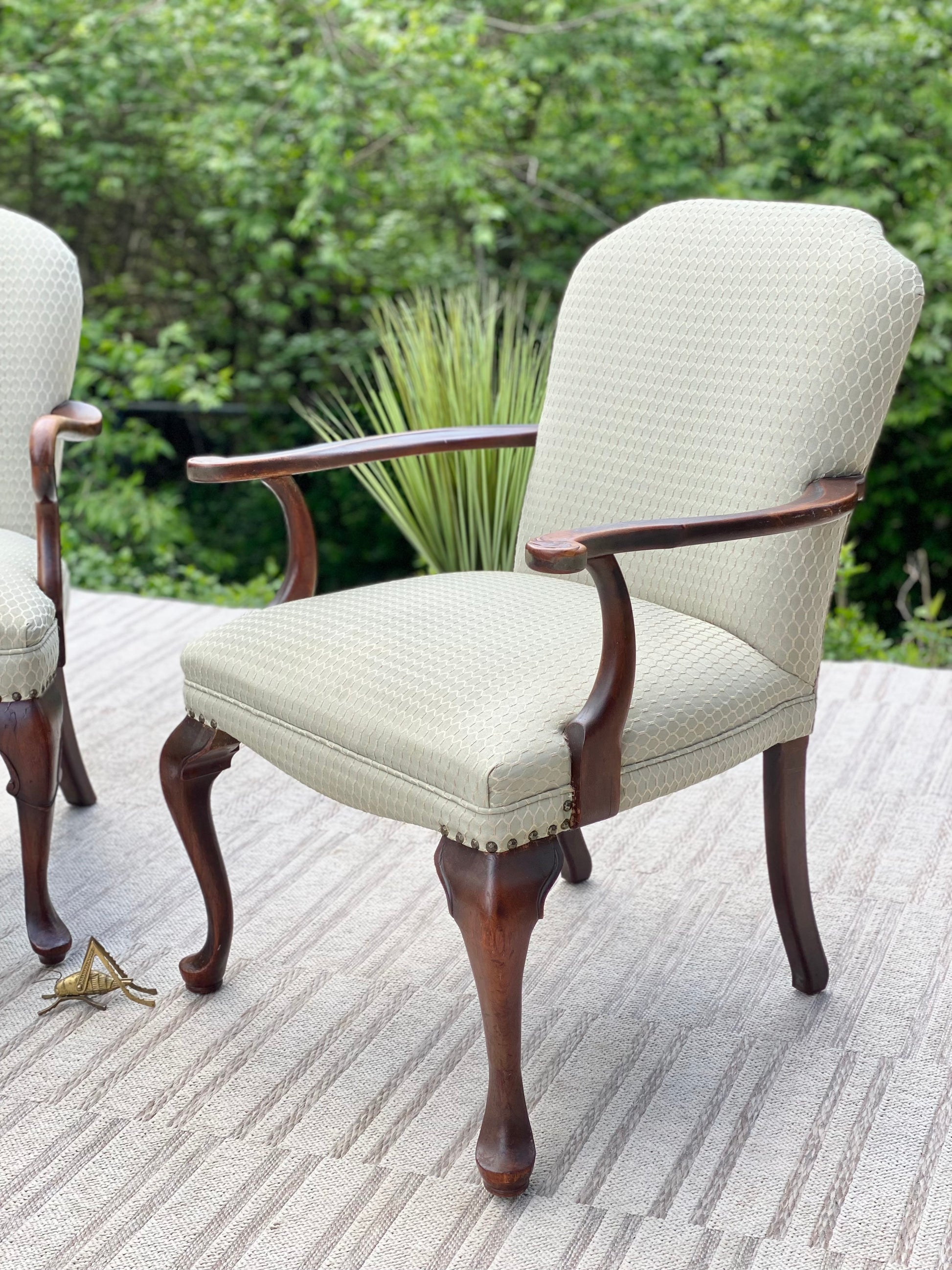 SOLD - Fresh find! 🌱❄️ Check out this beautiful pair of freshly upholstered vintage accent chairs. Wooden frames with a brass pin design. Different arm design on each chair and would work perfect around the house. 36” x 27” x 24” Good condition