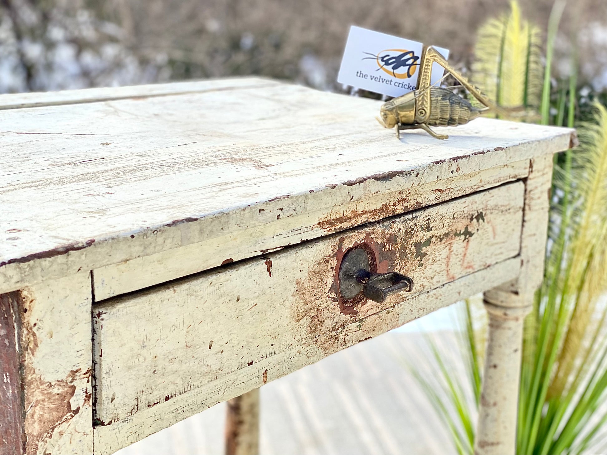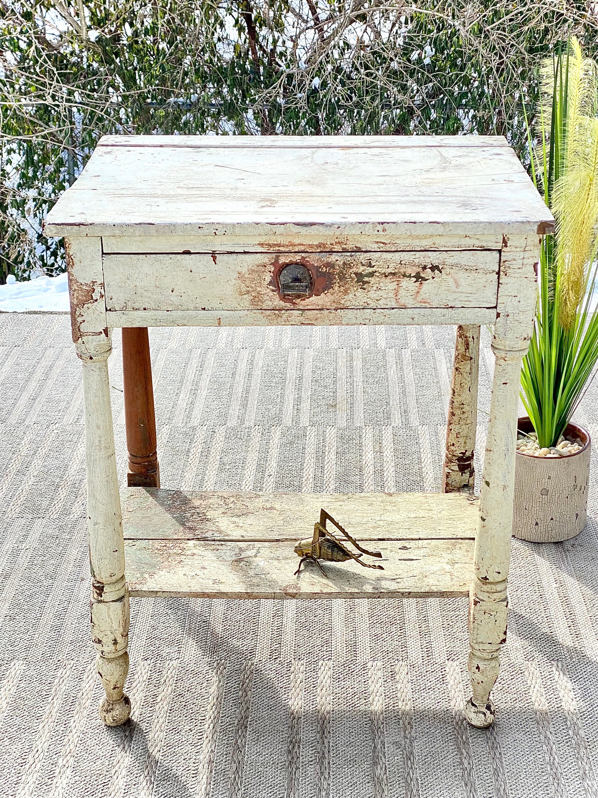 Just arrived! ❄️🍁 Check out the patina on this primitive chippy white side table. Small drawer and original pulls with that awesome farmhouse vibe. 28”h x 23” x 17” Good condition