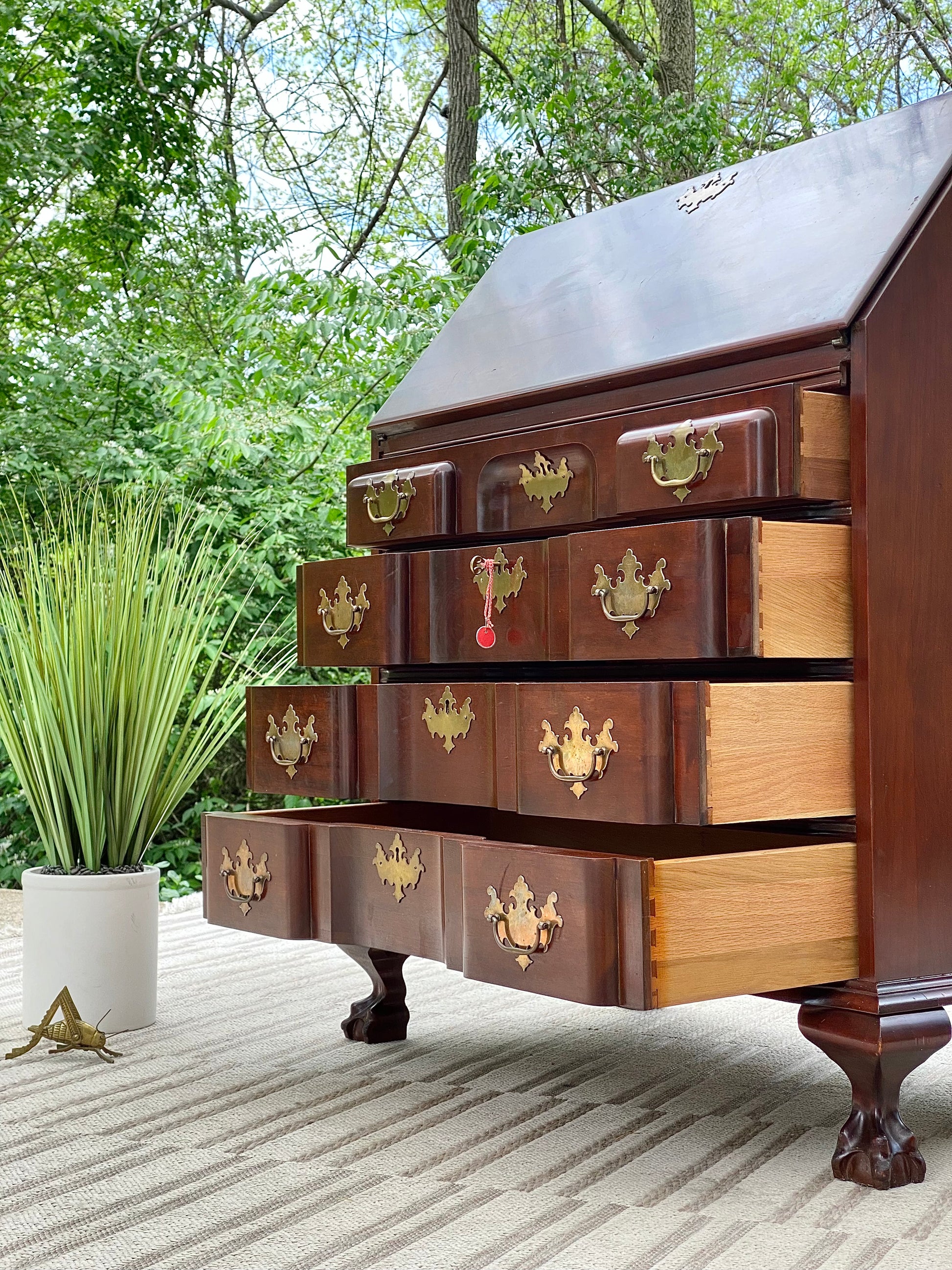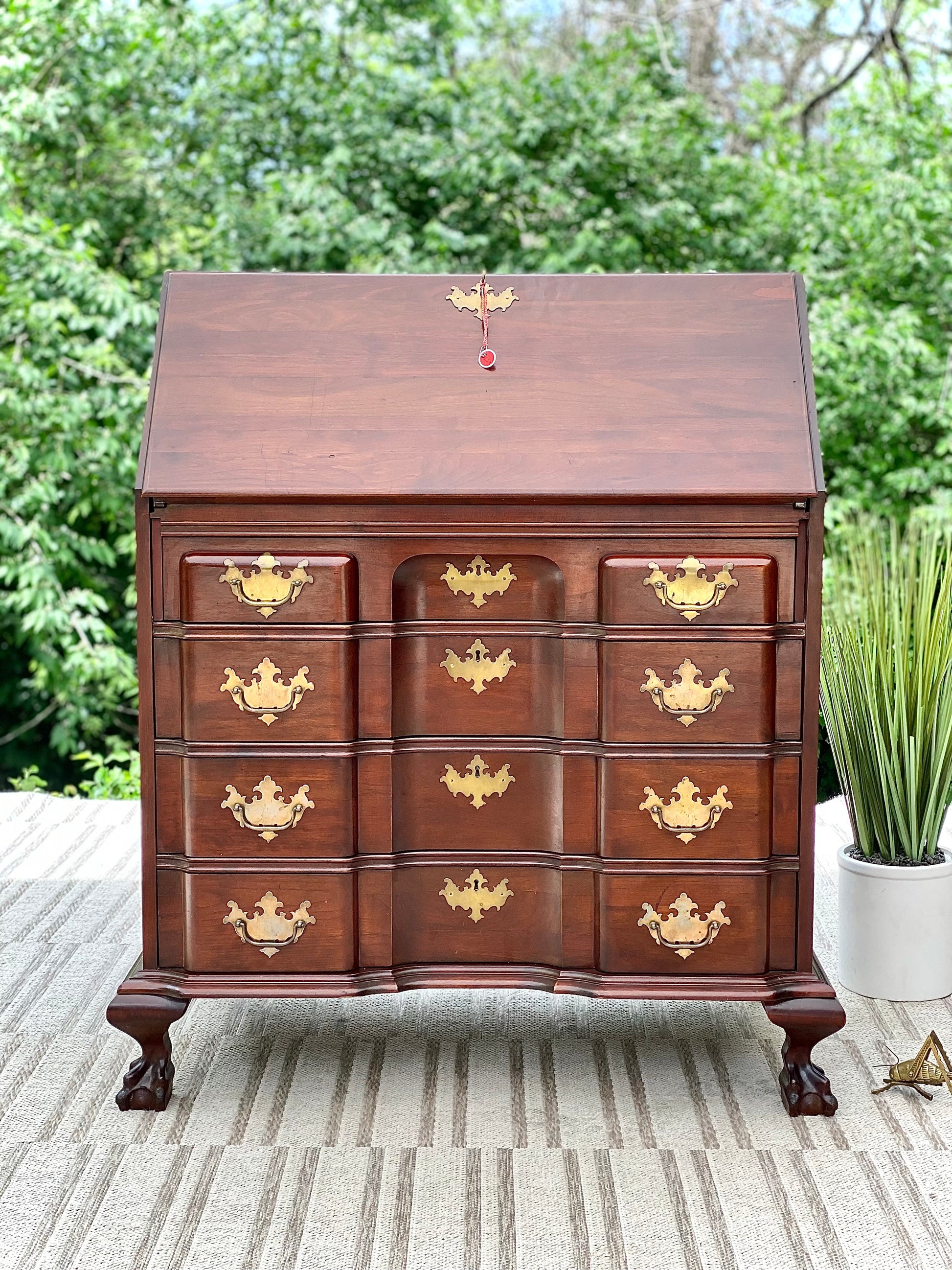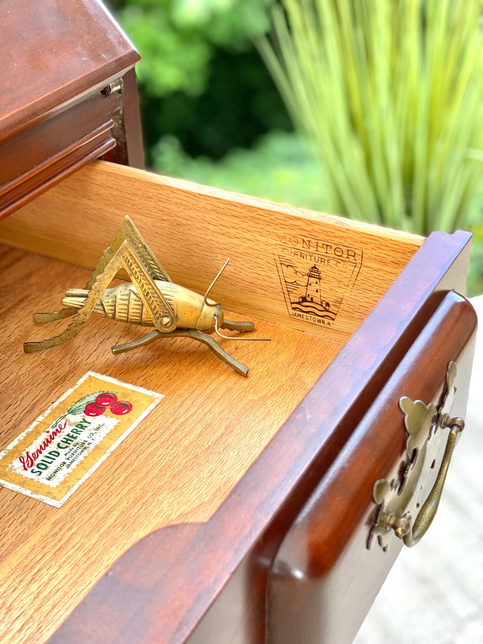 SOLD - Just arrived! 🪴🌱 Check out this beautiful vintage solid cherry Monitor of Jamestown NY secretary. Nice serpentine style drawer fronts with a stately vibe. You know we love this beauty! 41” x 33” x 21” Good condition