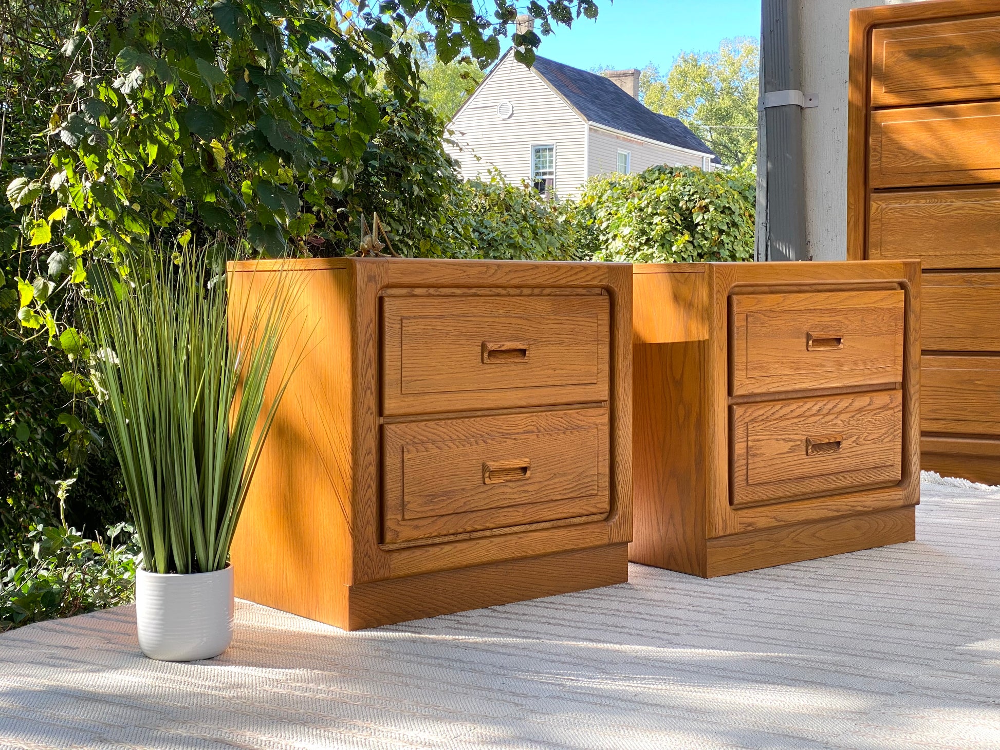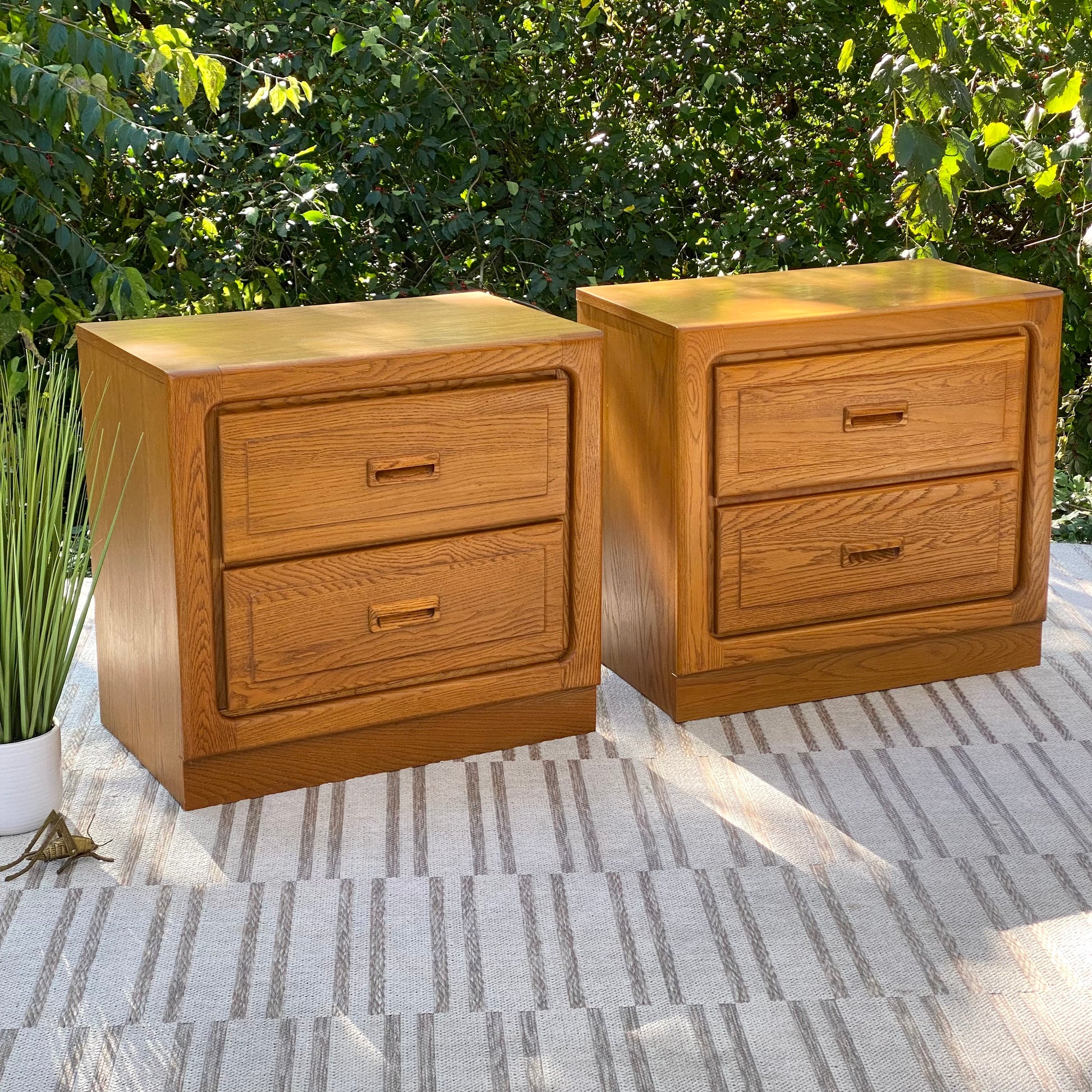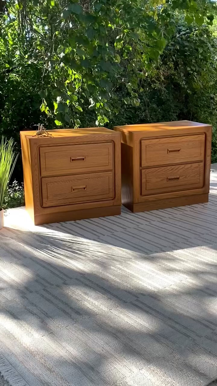SOLD - Newest arrival! 🧡🍁 Check out this nice pair of vintage Stanley oak night stands. Good working drawers with a classic rounded design. 25” x 26” x 16” for both. Good condition