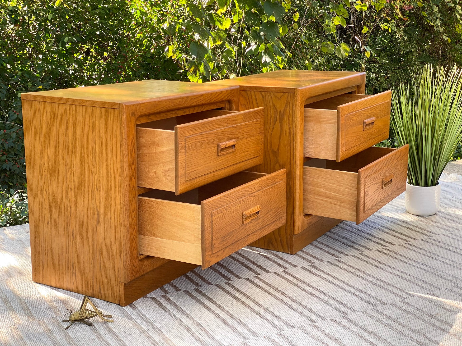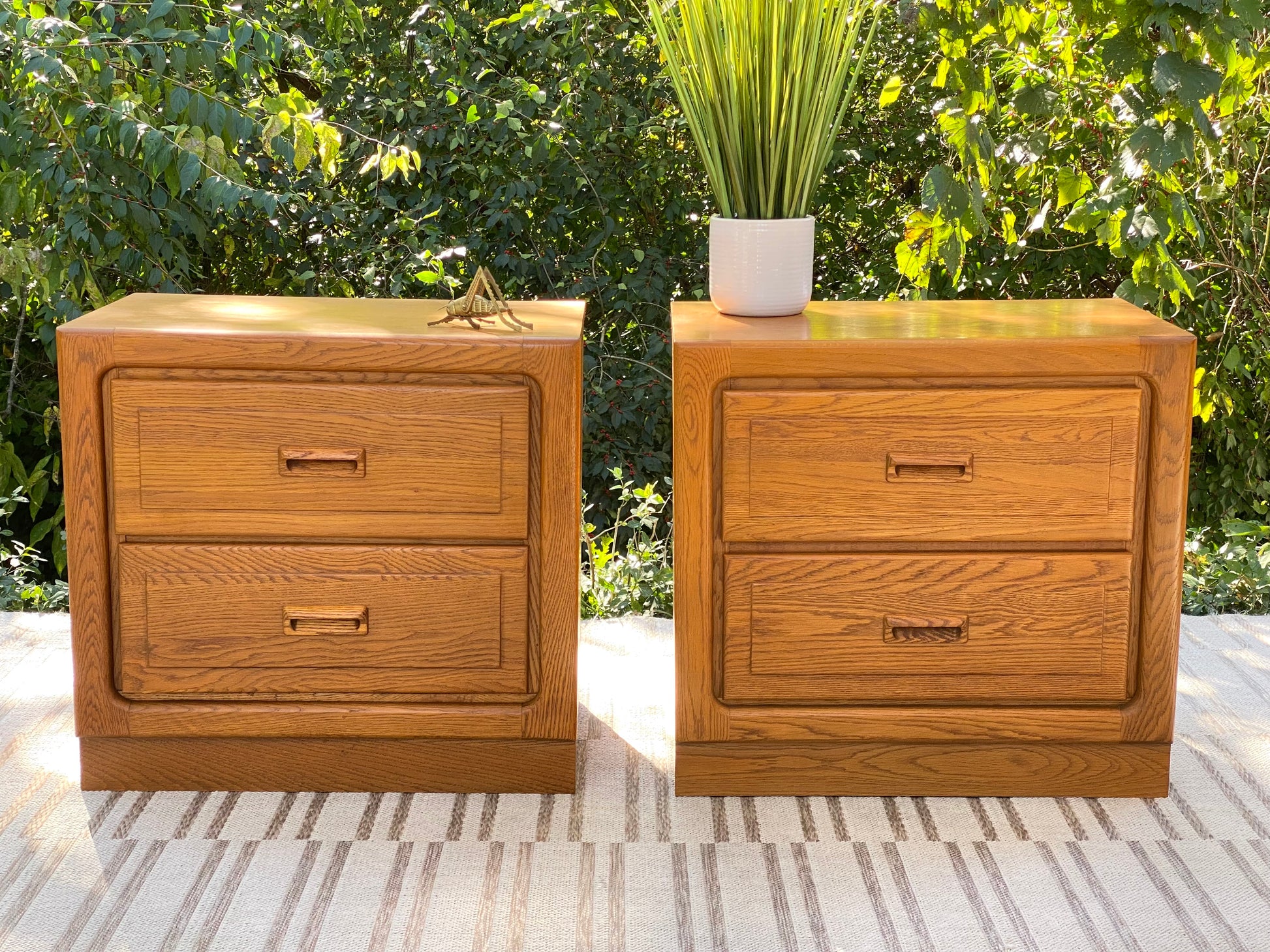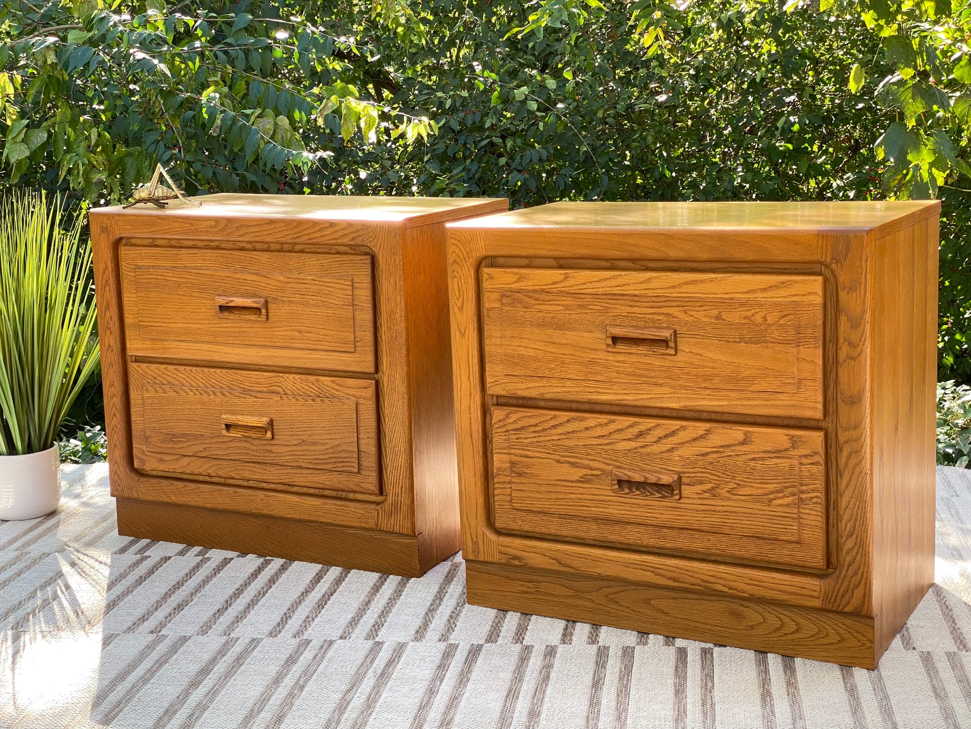 SOLD - Newest arrival! 🧡🍁 Check out this nice pair of vintage Stanley oak night stands. Good working drawers with a classic rounded design. 25” x 26” x 16” for both. Good condition