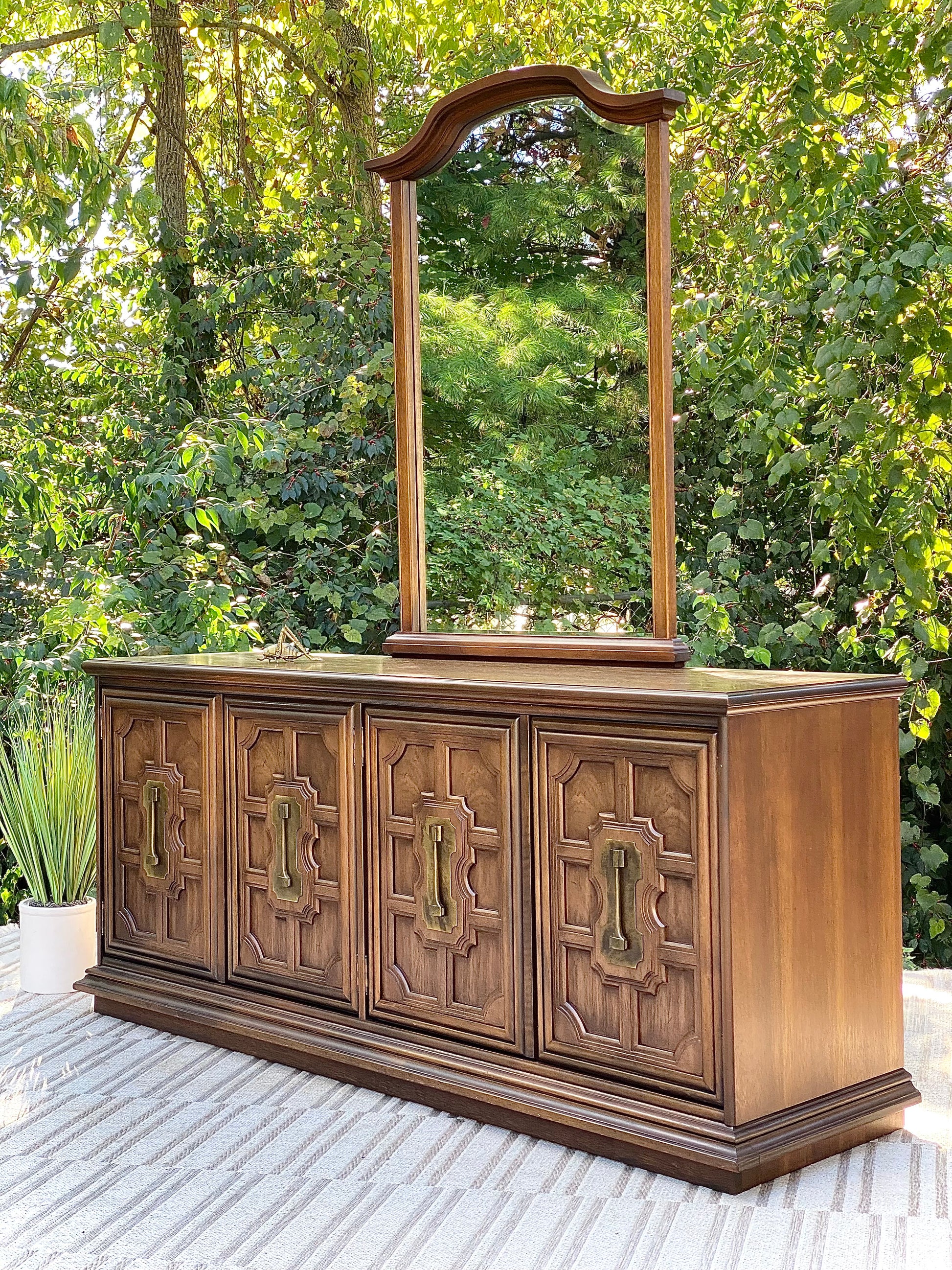 Fresh find! 🍁🍂 Check out this vintage wooden Stanley six drawer dresser. Beautiful front design with lots of storage and optional mirror included. 79”h (w/ mirror) x 72” x 20” Good condition