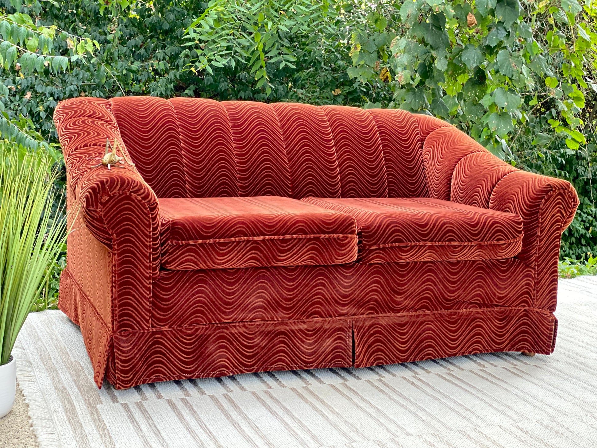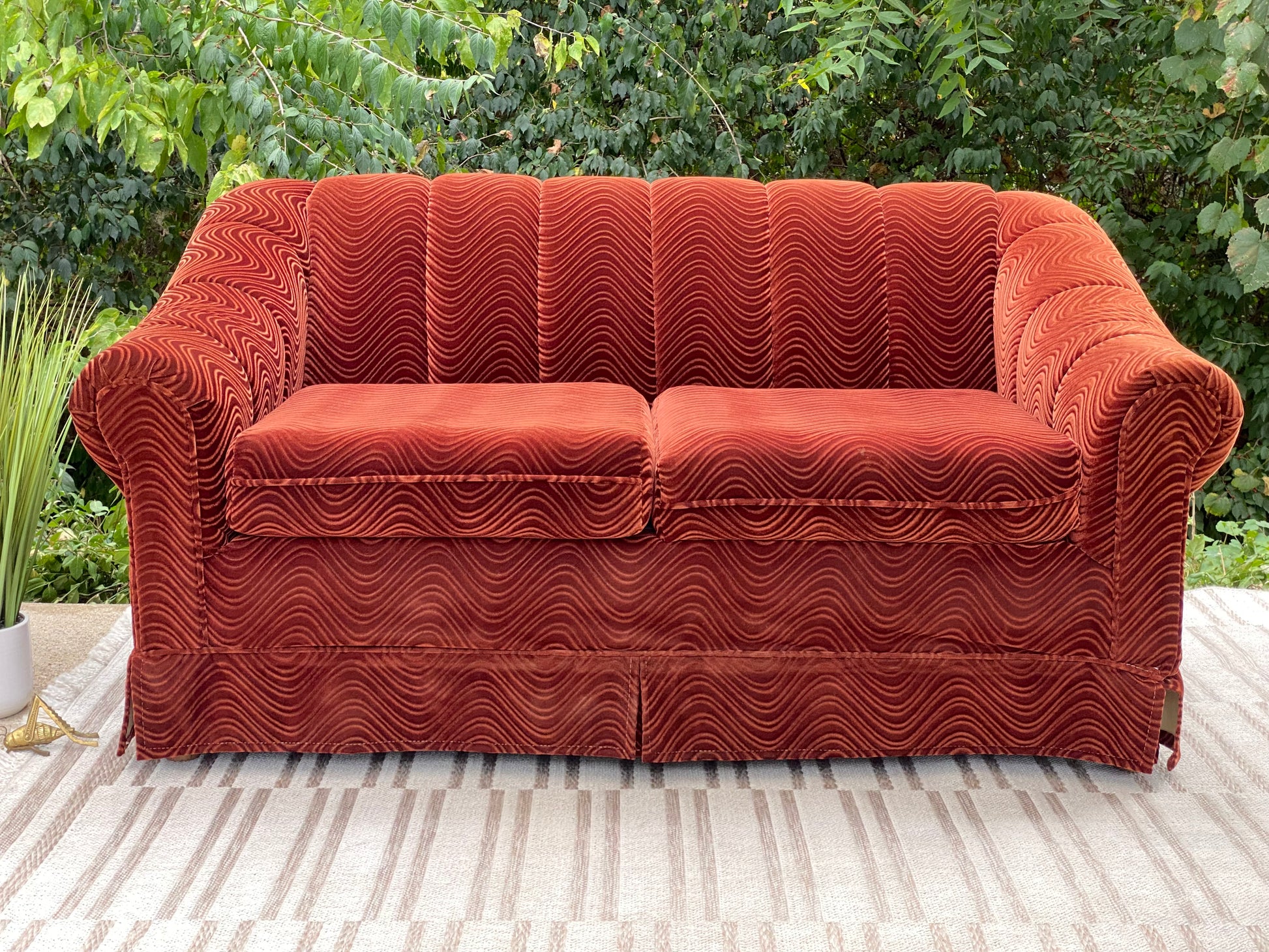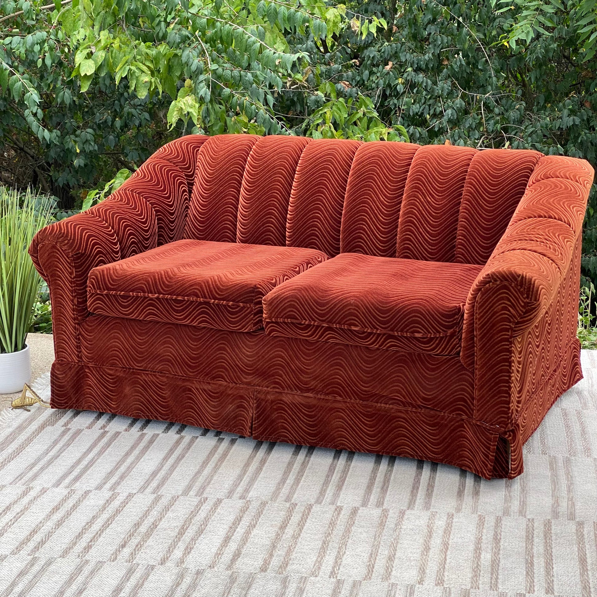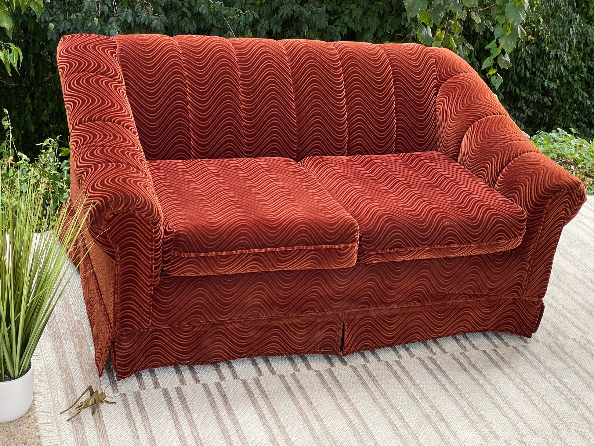 SLD - Newest arrival! 🤎🧡🤎 We are super excited about this 1970s extra funky retro loveseat (and matching couch) in a groovy velvet Swirl raisin pattern. Wavy design with a comfortable seat. No rips or tears and in really good condition!!! 30” x 60” x 36” Nice condition