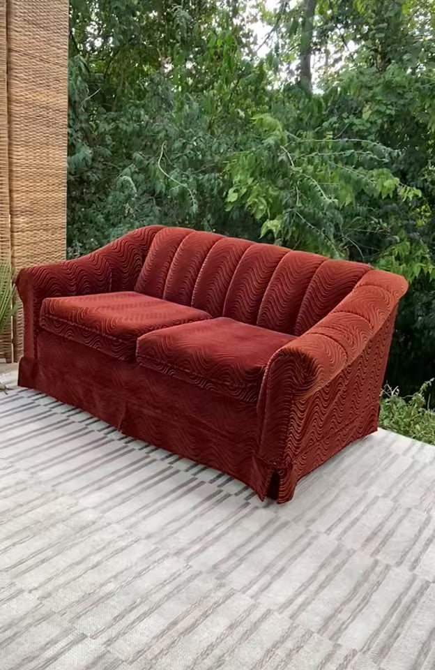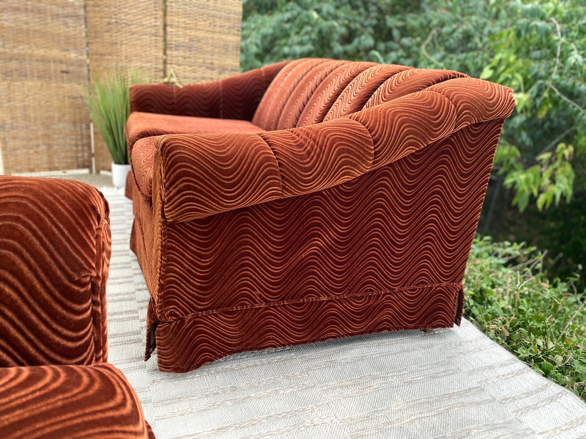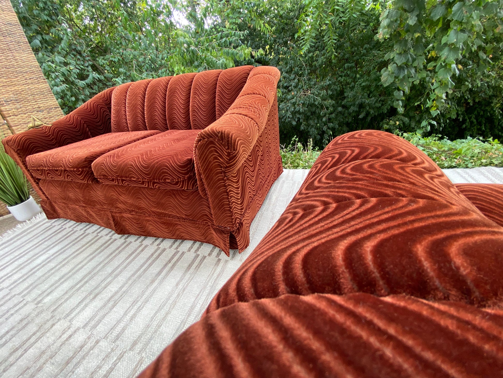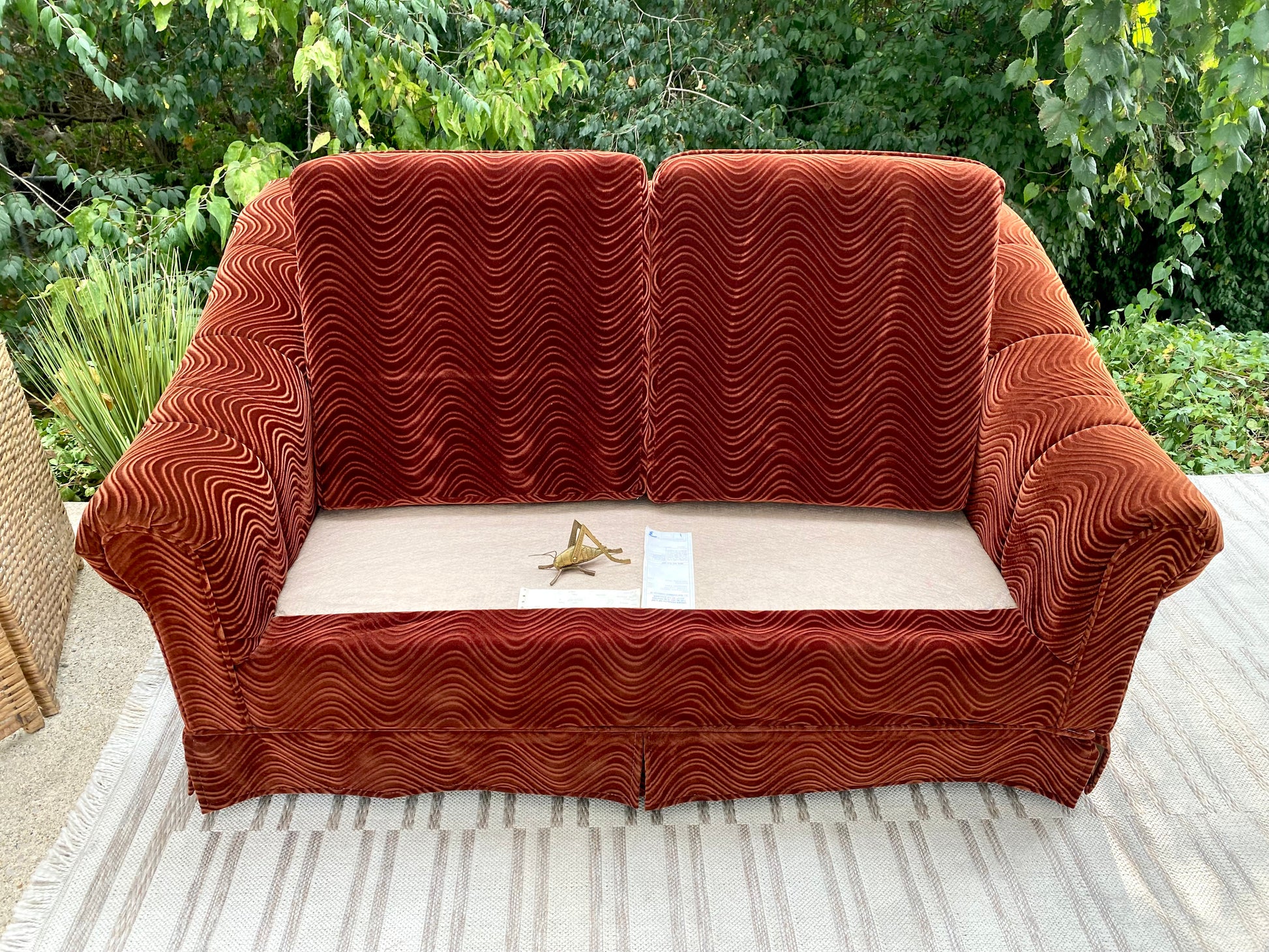 SLD - Newest arrival! 🤎🧡🤎 We are super excited about this 1970s extra funky retro loveseat (and matching couch) in a groovy velvet Swirl raisin pattern. Wavy design with a comfortable seat. No rips or tears and in really good condition!!! 30” x 60” x 36” Nice condition