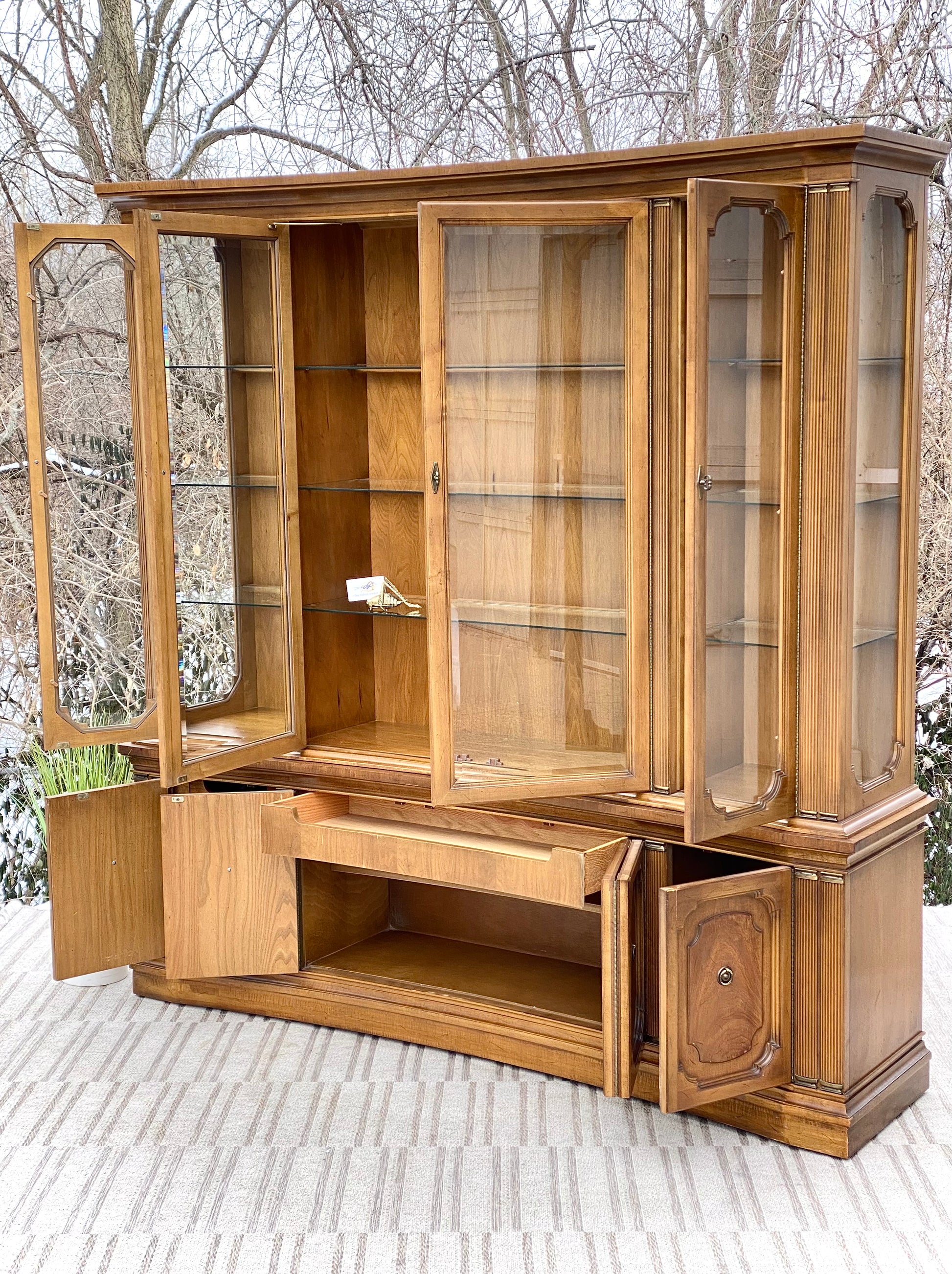 Just arrived! ❄️🍁 Check out this beautiful vintage Unique Furniture two piece lighted hutch. Gorgeous curved front design with glass shelves and a warm vibe. We love the look of this one! 80”h x 78” x 18” Good condition