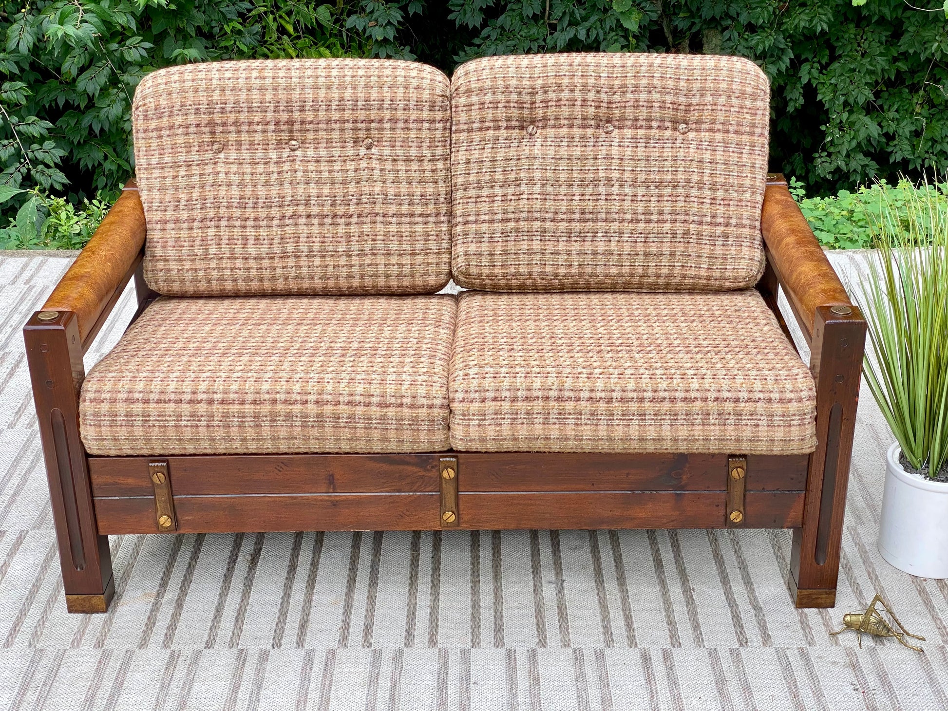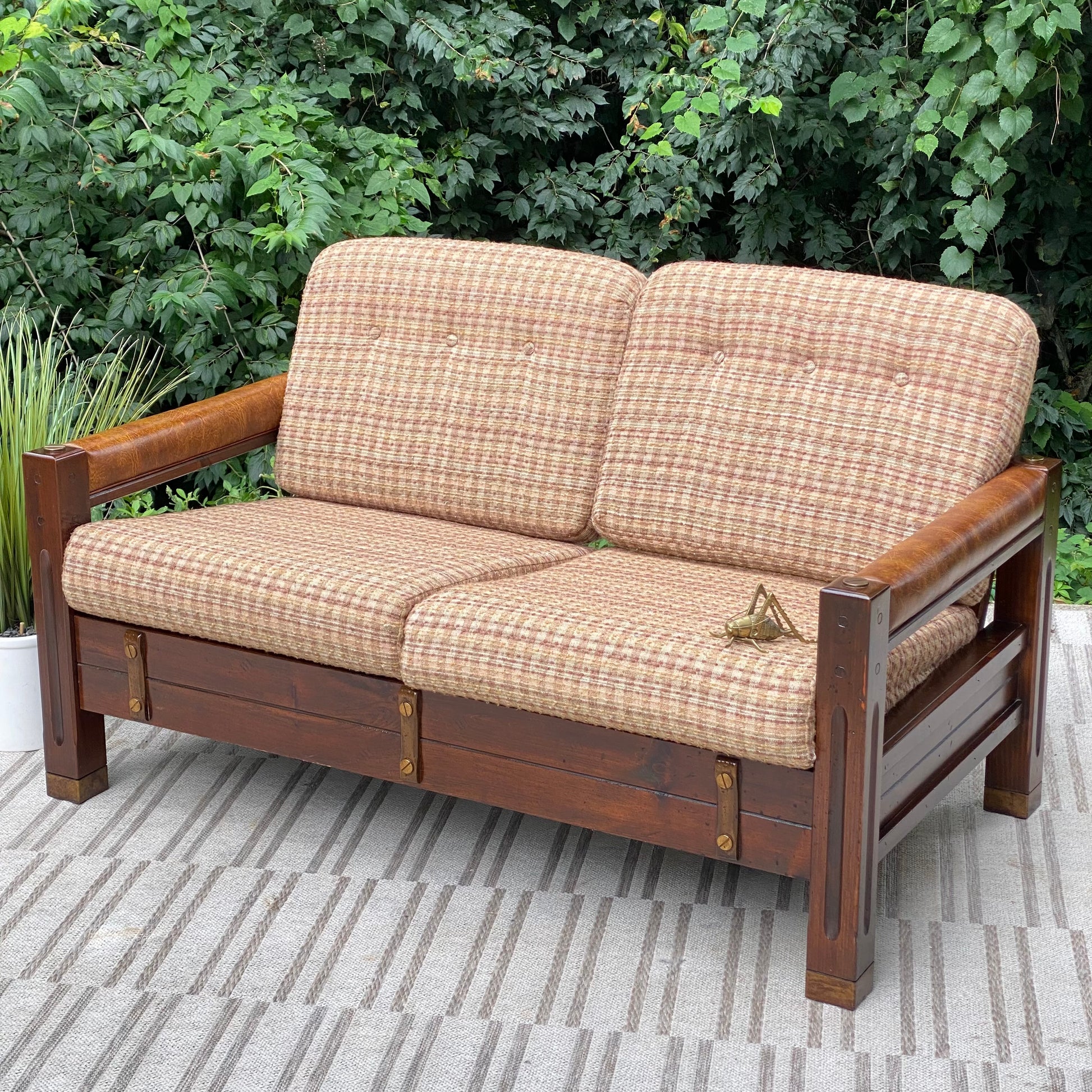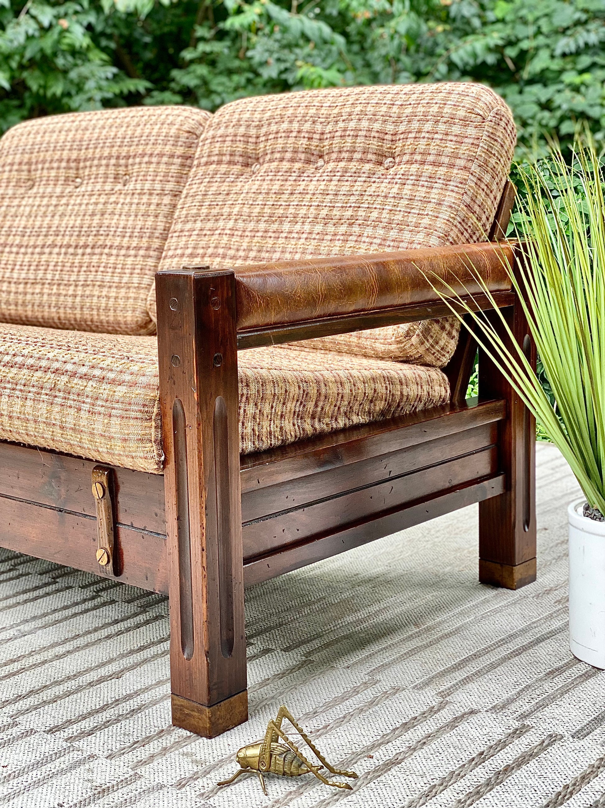 SOLD - Fresh find! 🌱🪴 We love the retro vibes of this vintage upholstered pine loveseat. Original cushions and brass accents make this an awesome piece! 31”h x 54” x 32” Good condition