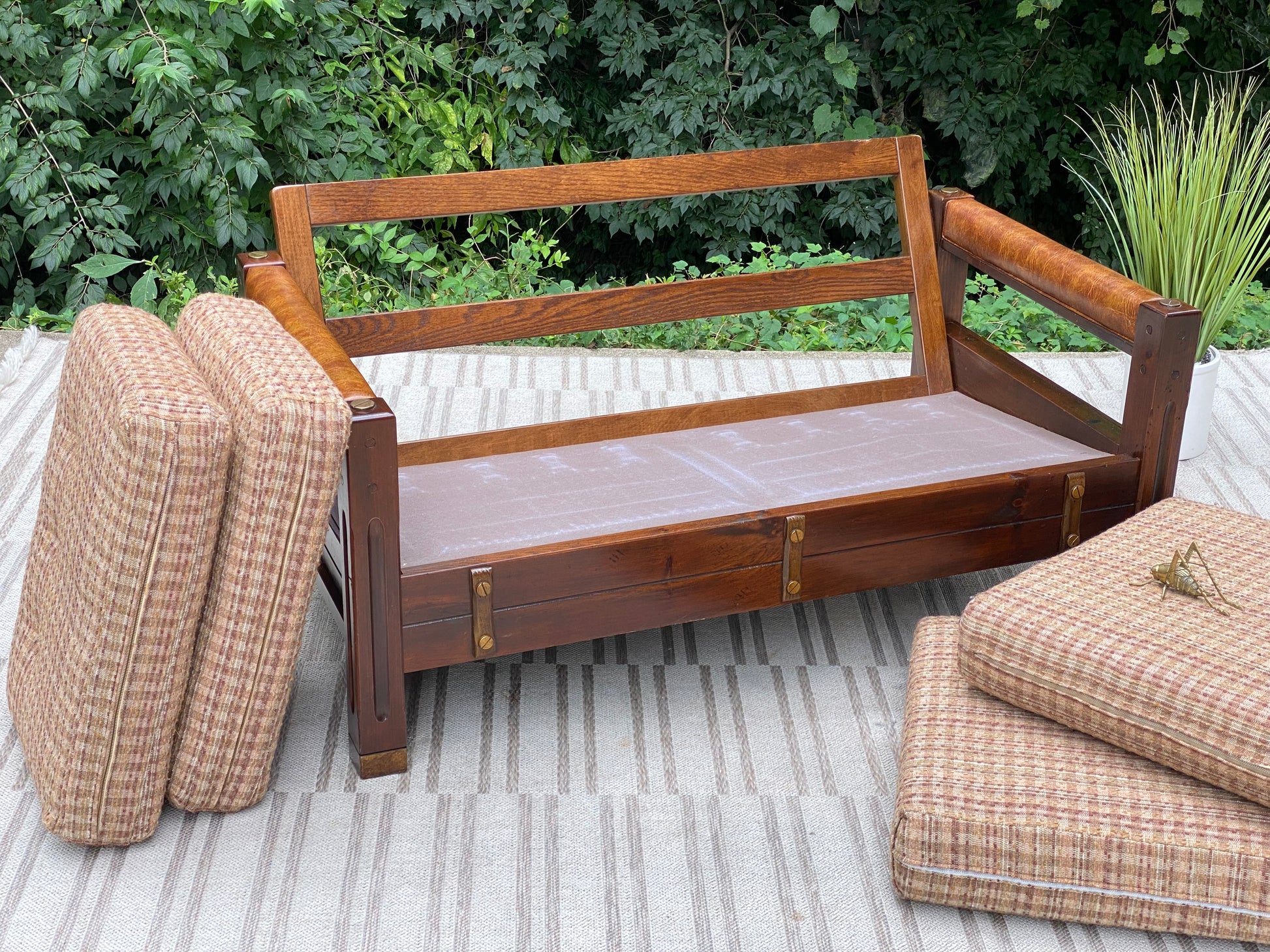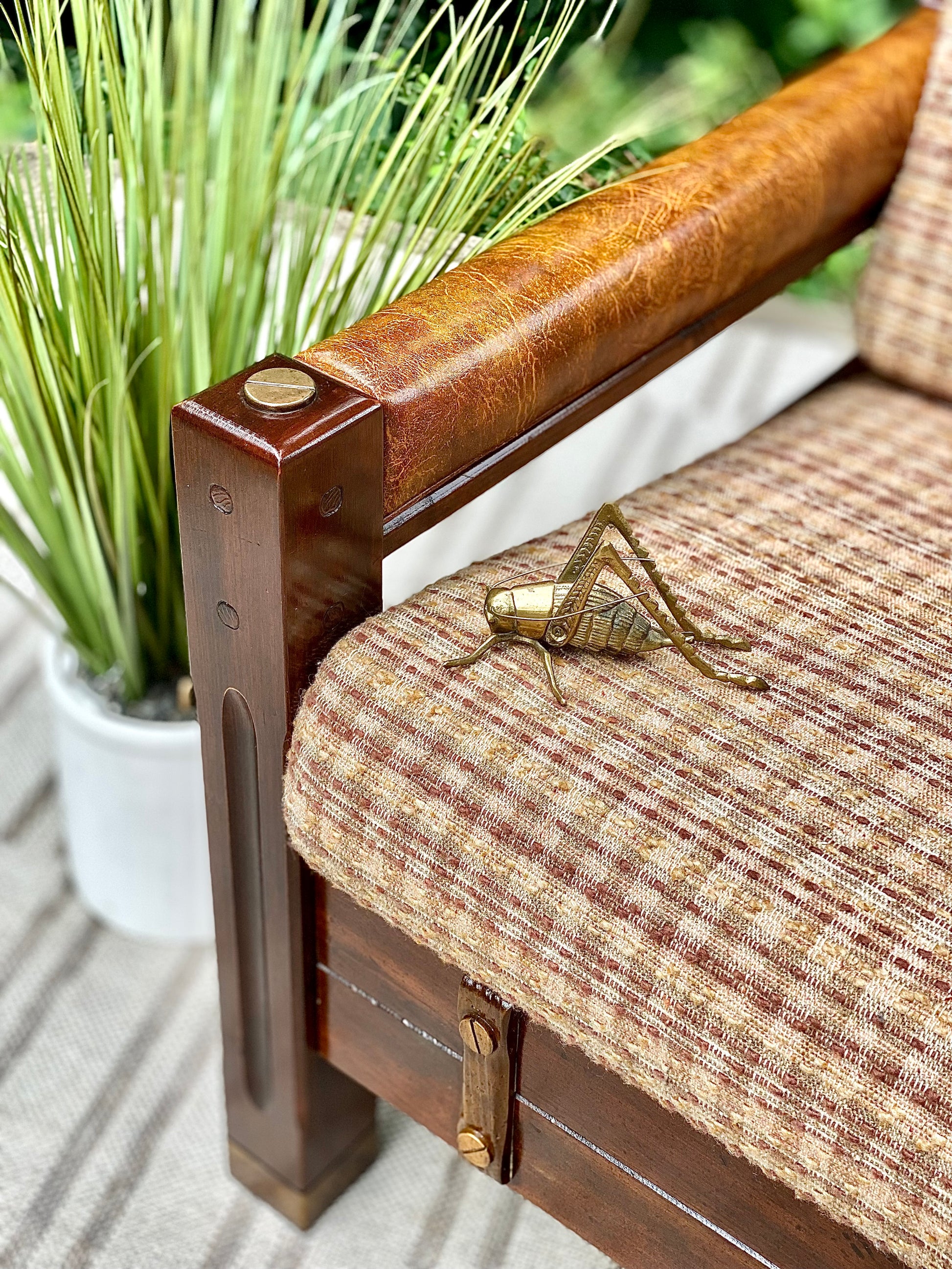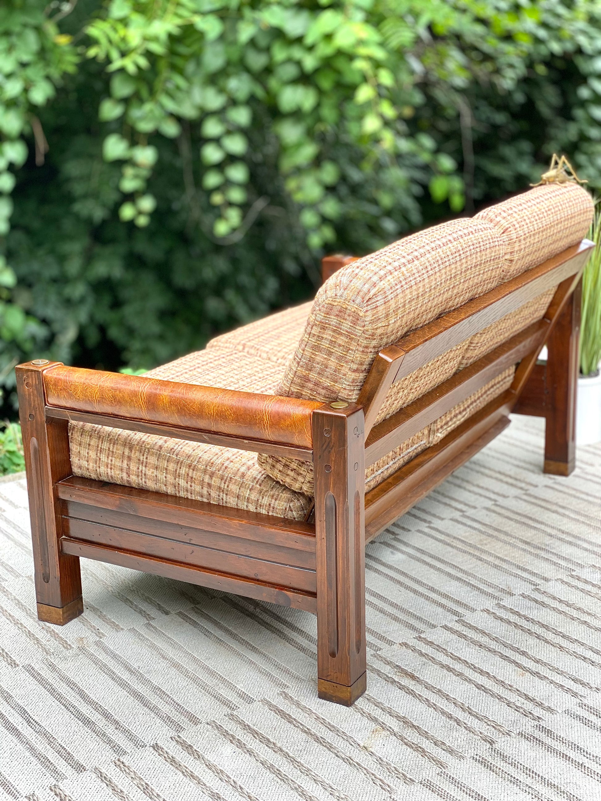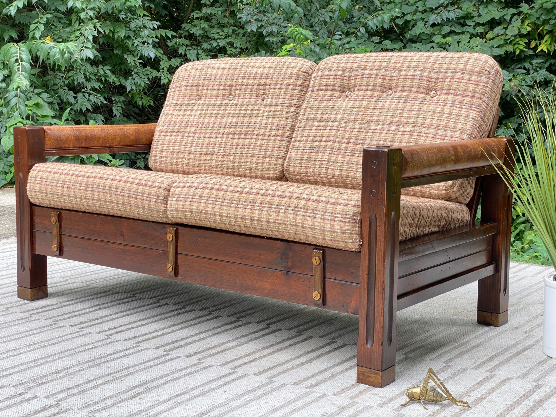 SOLD - Fresh find! 🌱🪴 We love the retro vibes of this vintage upholstered pine loveseat. Original cushions and brass accents make this an awesome piece! 31”h x 54” x 32” Good condition