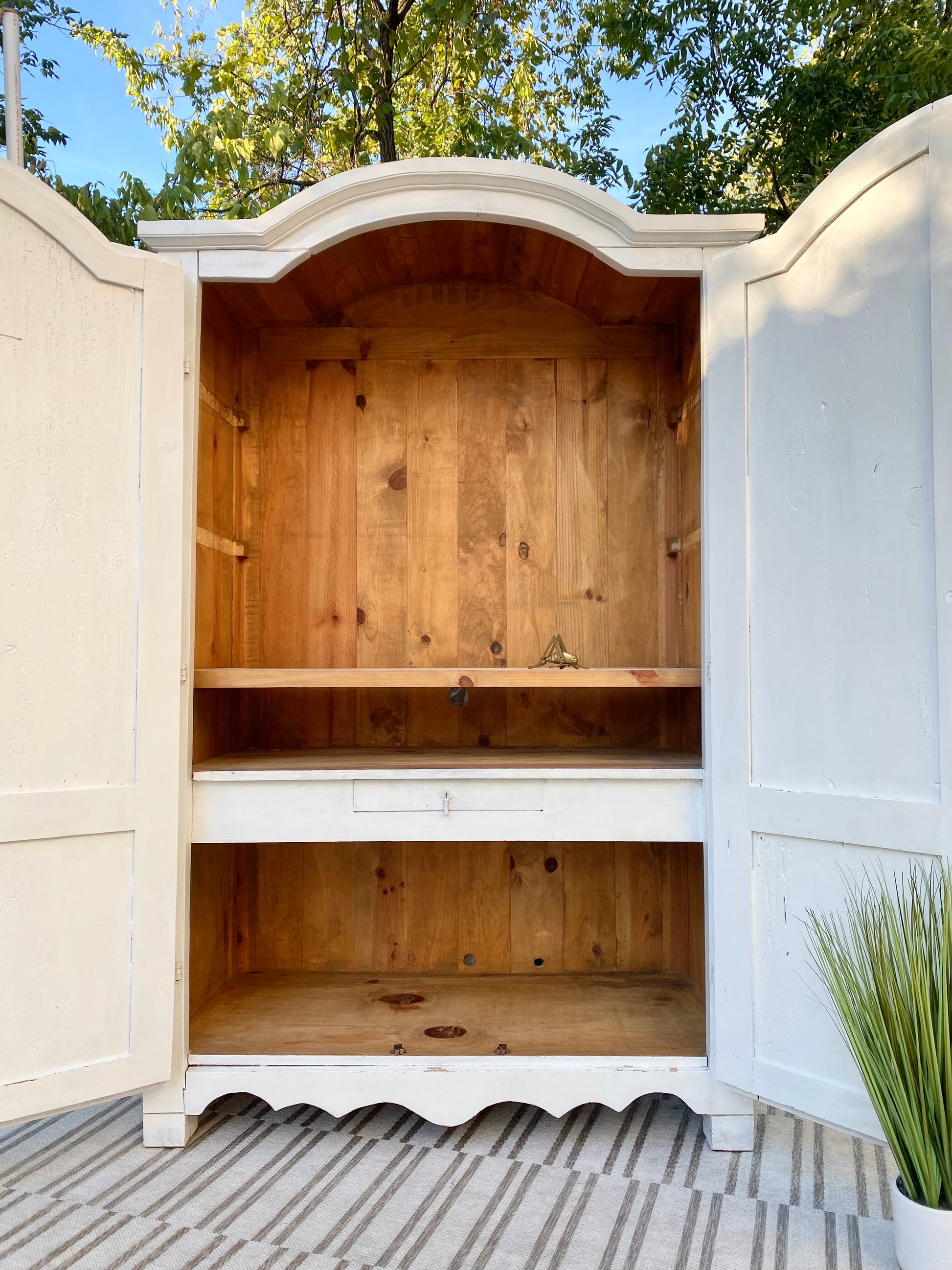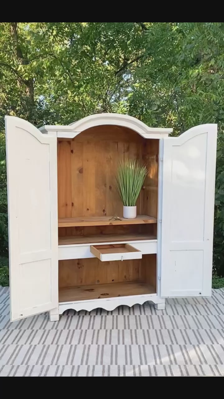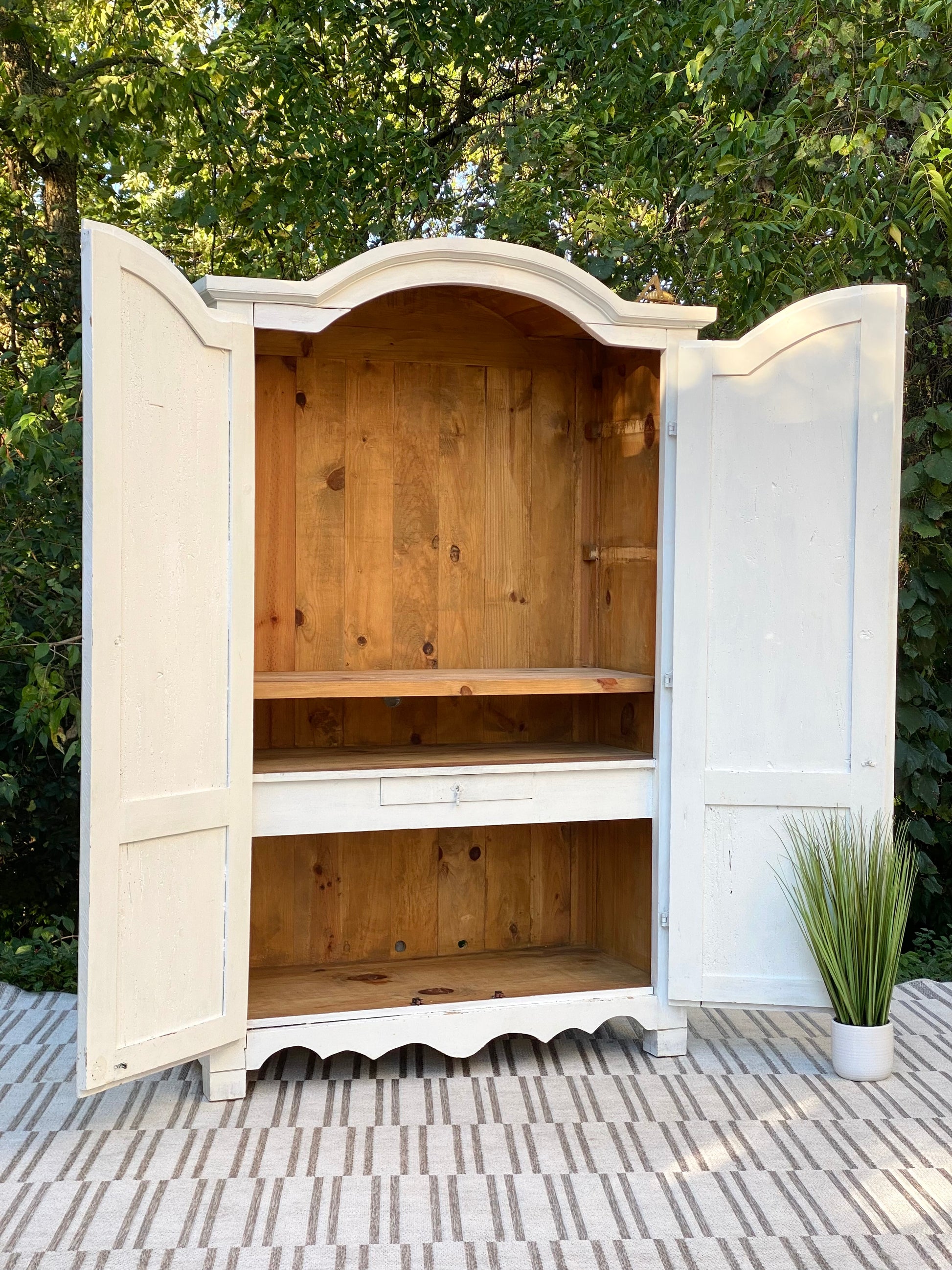 SOLD - Newest arrival! 🧡🍁 Check out this beautiful vintage white pine cabinet with top double doors and storage below. Great storage piece and has awesome farmhouse vibes! 80” x 24” x 51” Good condition