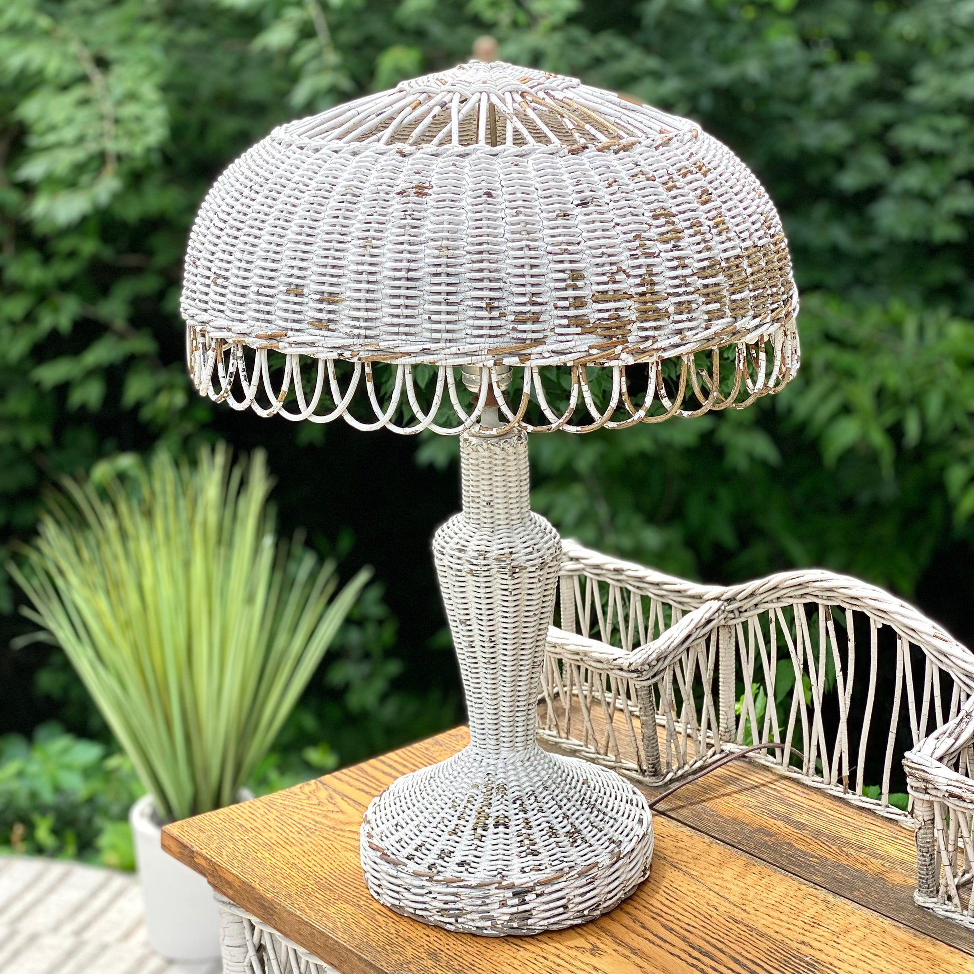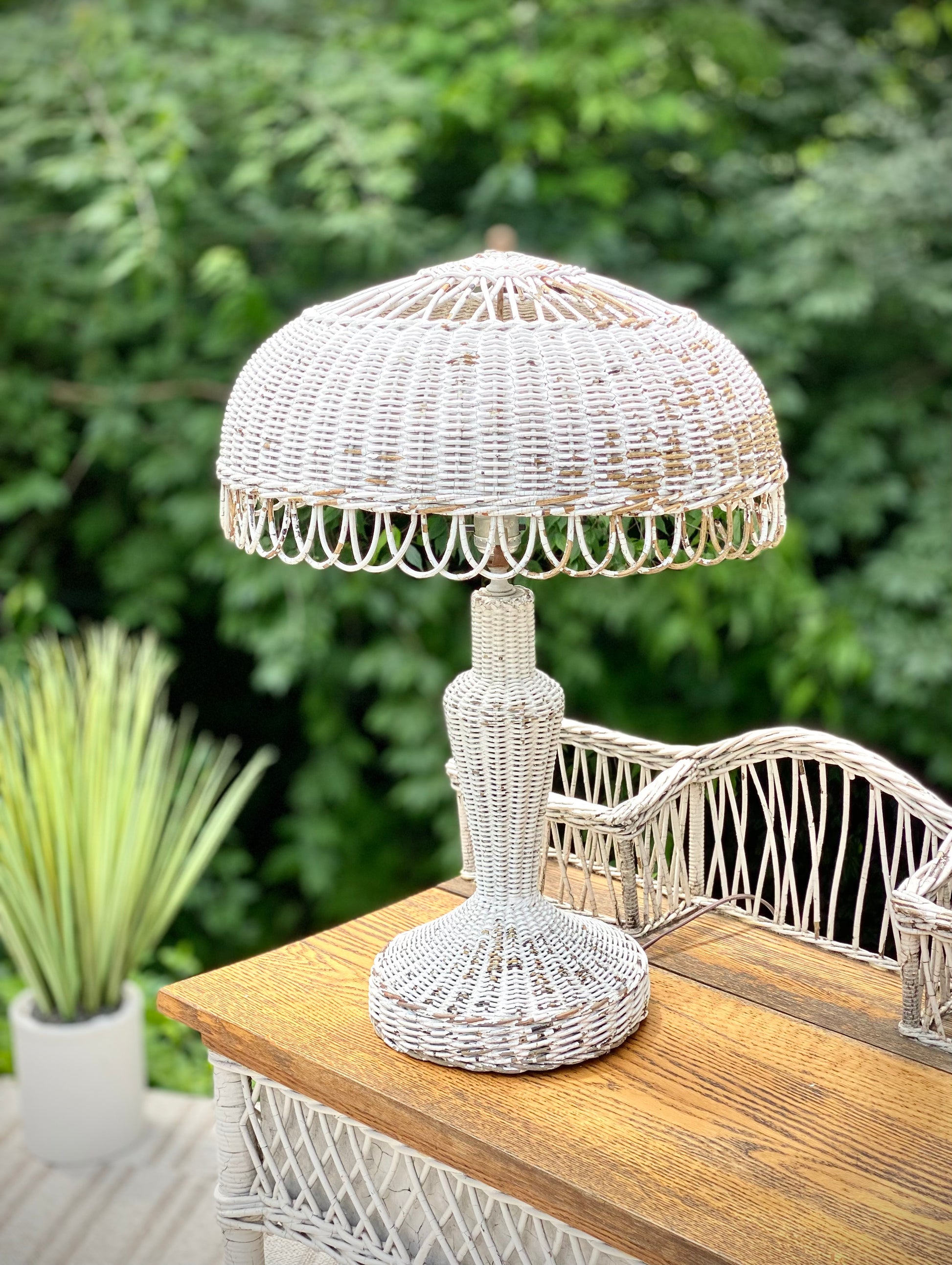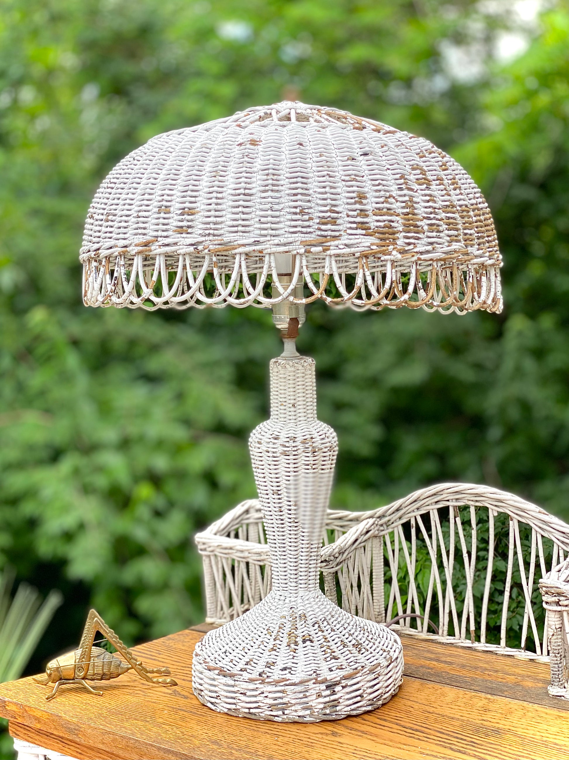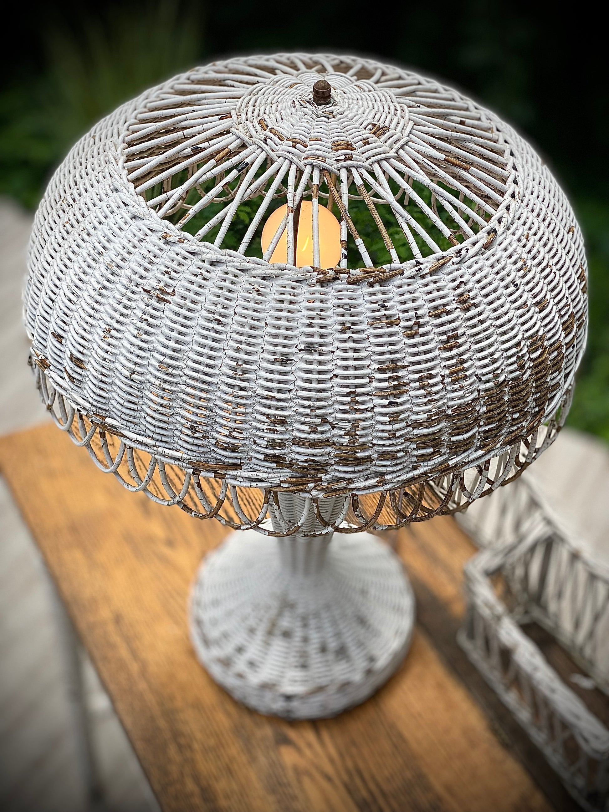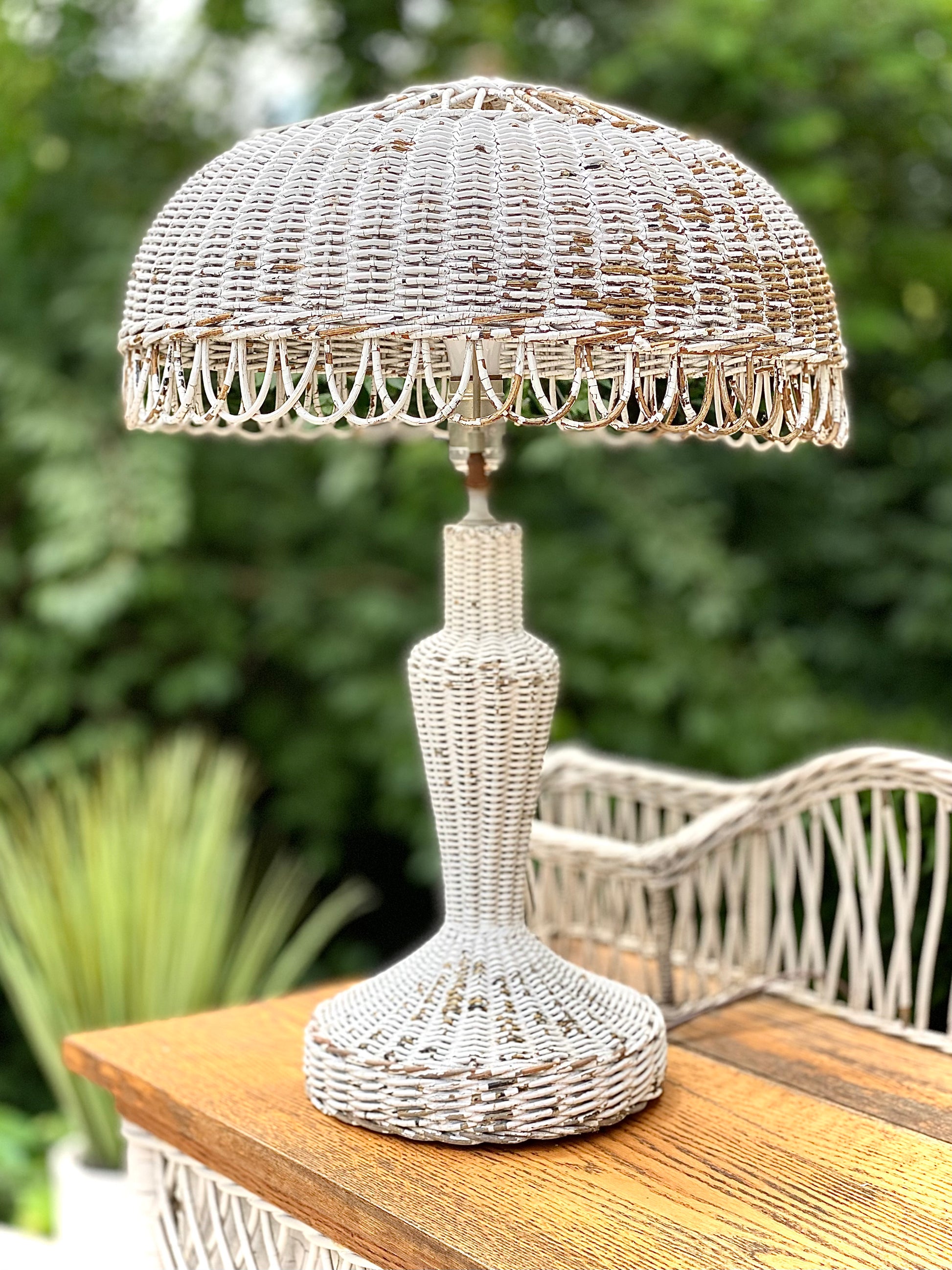SOLD - New arrival! 🪴🌱 Check out this antique distressed white wicker table lamp. Rounded bowl shade with tons of country vibes. 24” x 16” x 16” Good condition