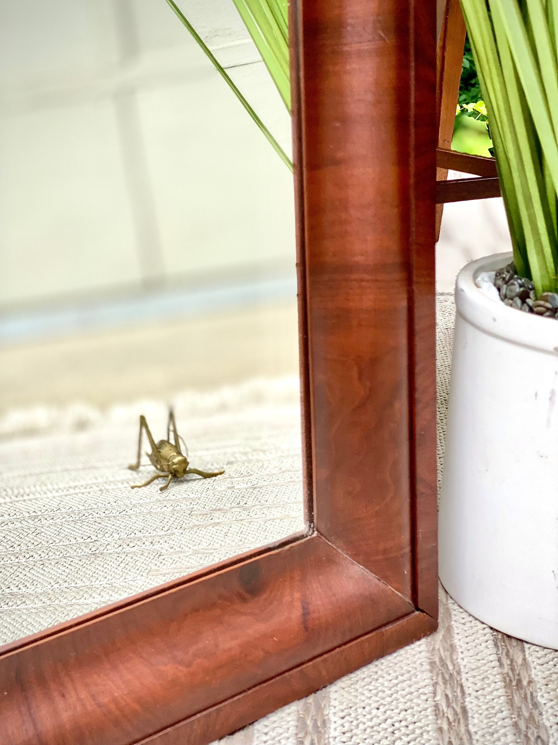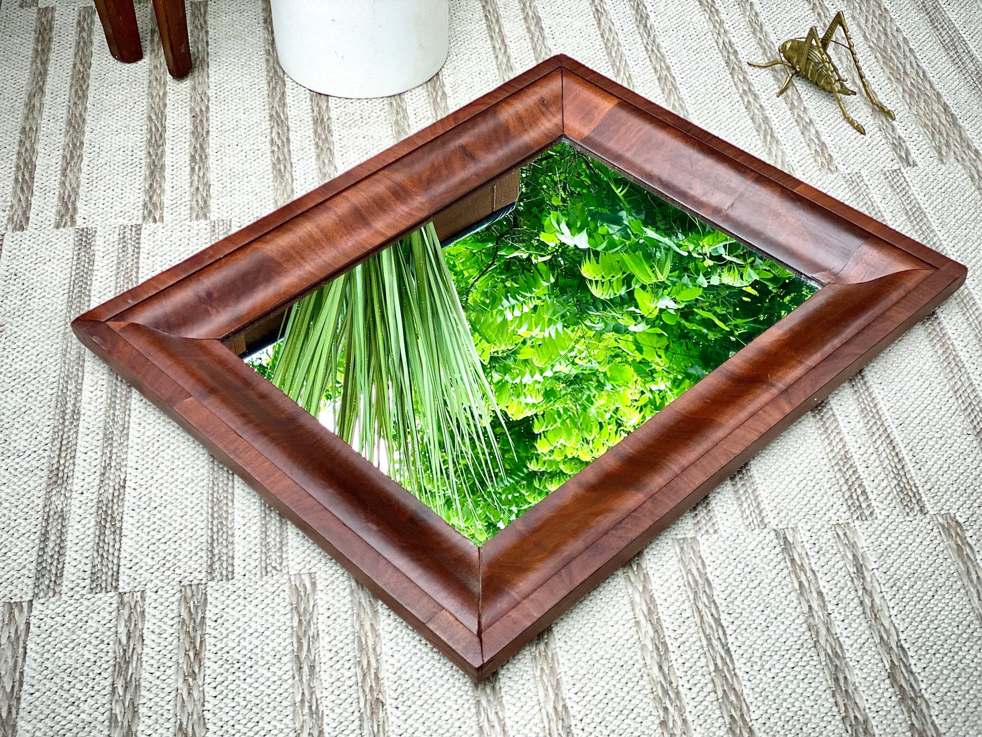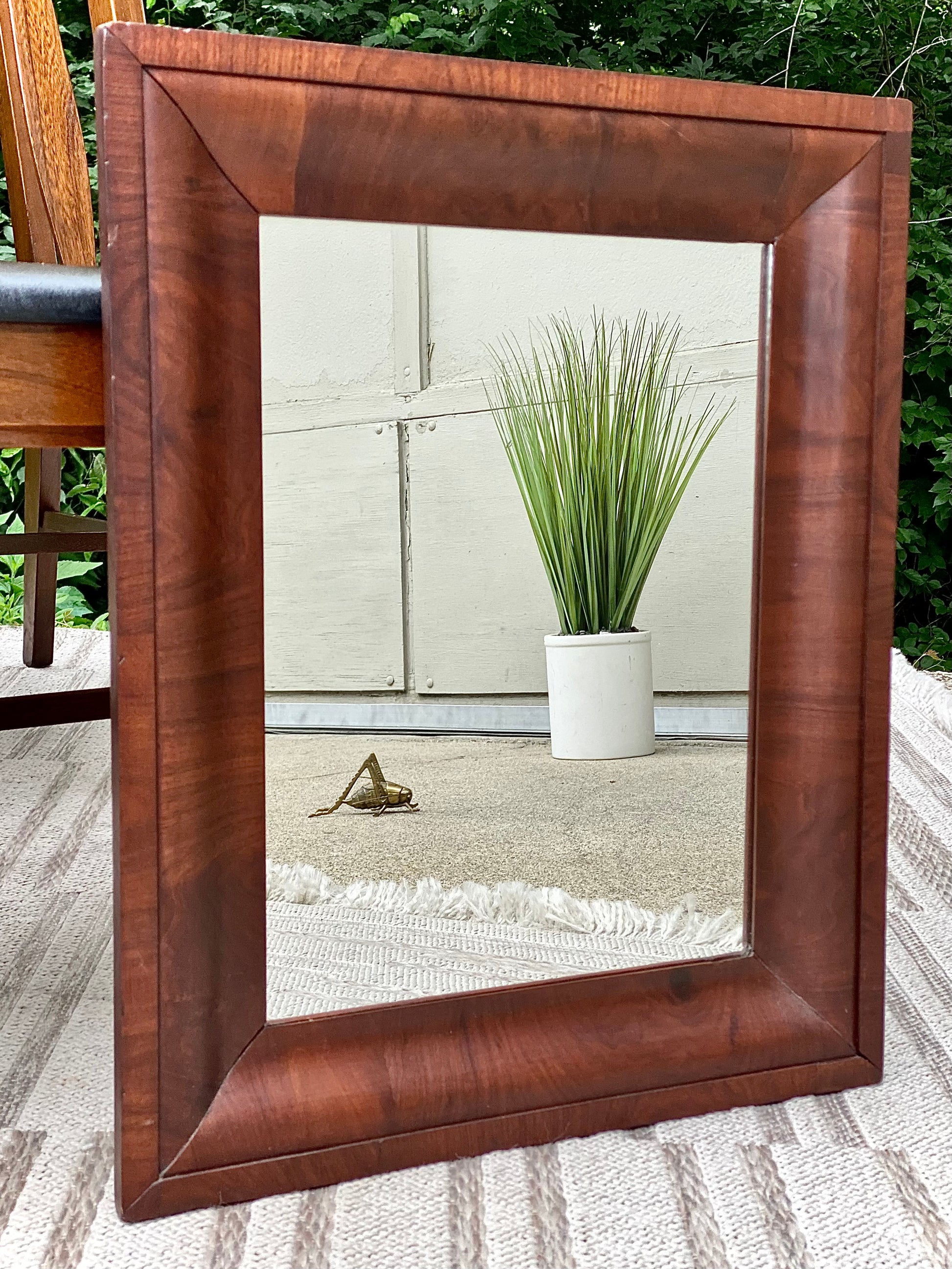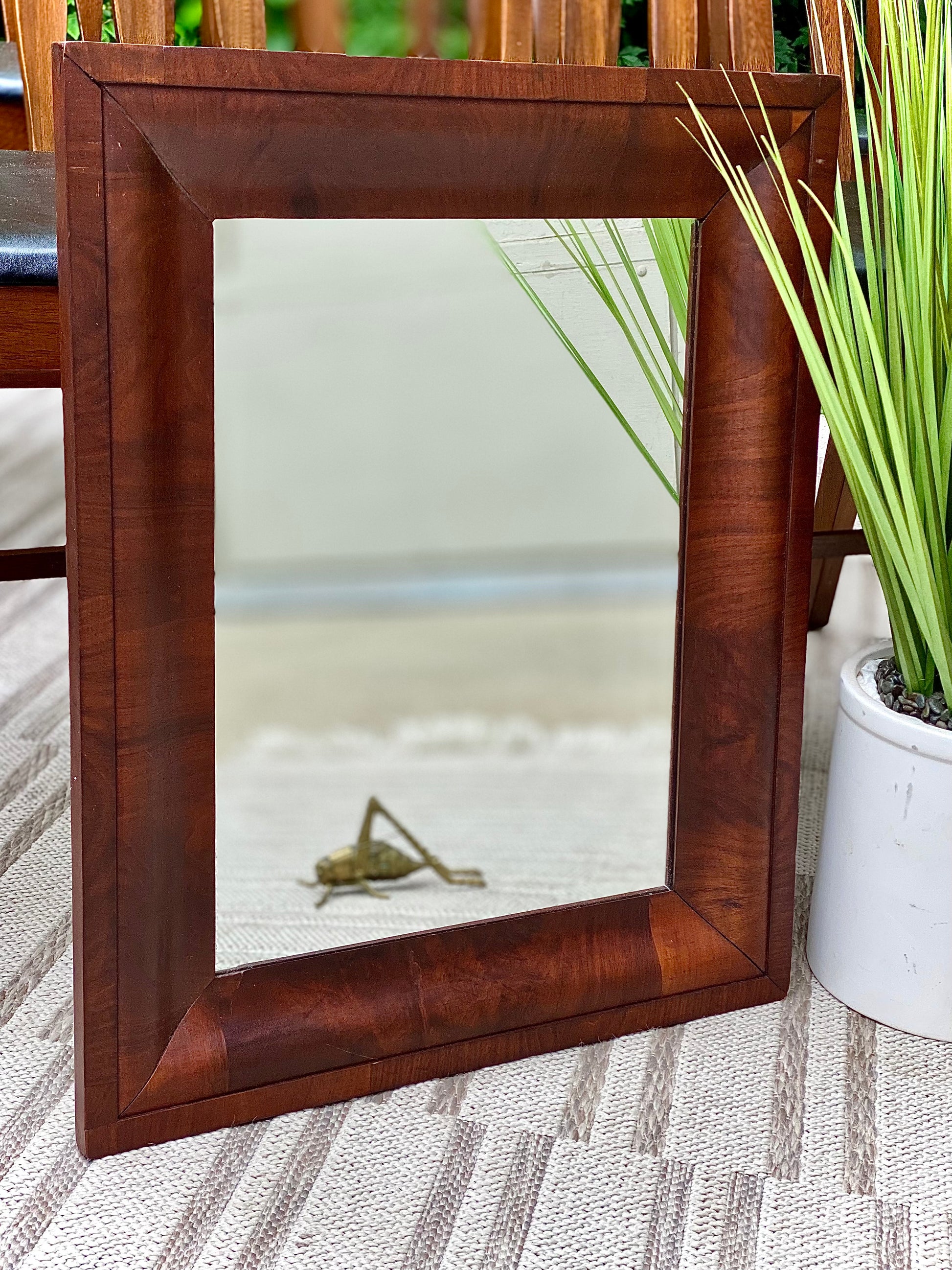 Fresh find! 🪴🌱 We love this antique wood wall mirror. Classic vibe with a warm stain finish. Ready to hang. 22” x 18” Good condition