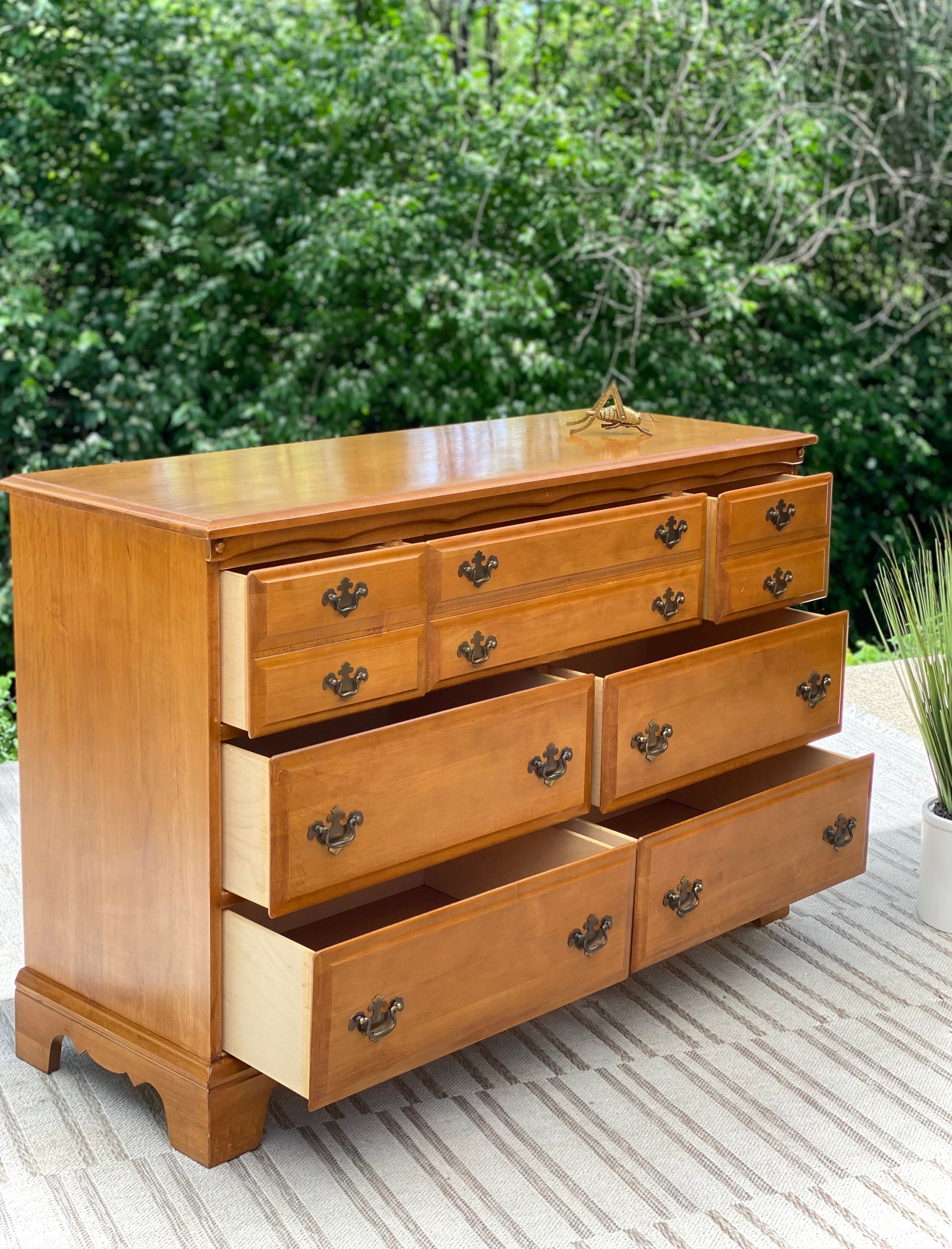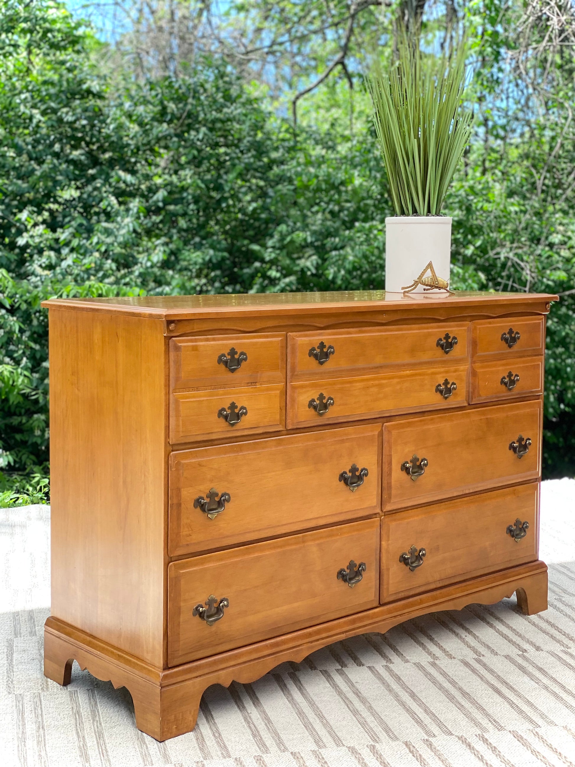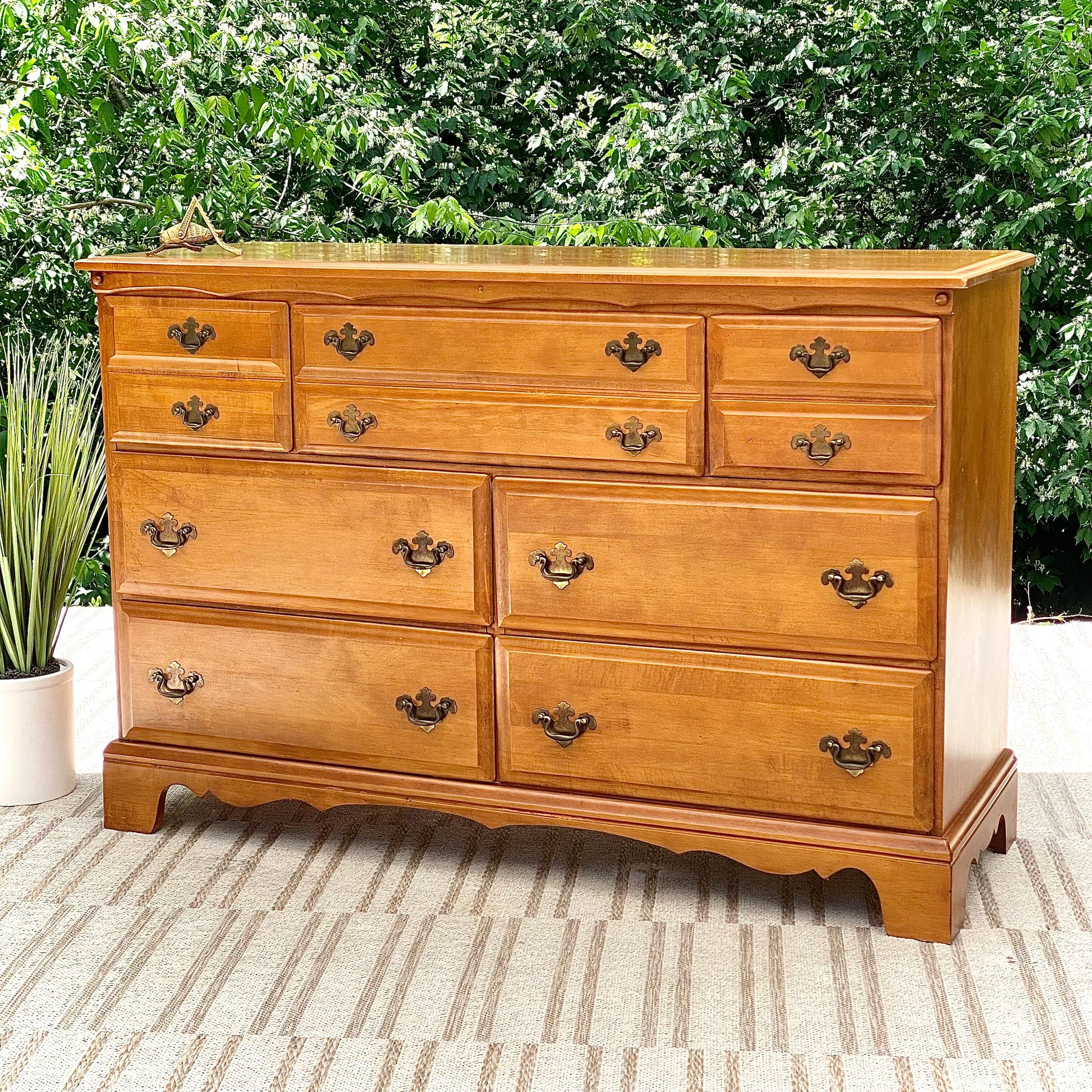 New arrival! 🪴🌱 We love the warm tones on this wooden maple seven drawer dresser. Vintage style with original hardware and tons of storage. 34” x 51” x 18” Good condition