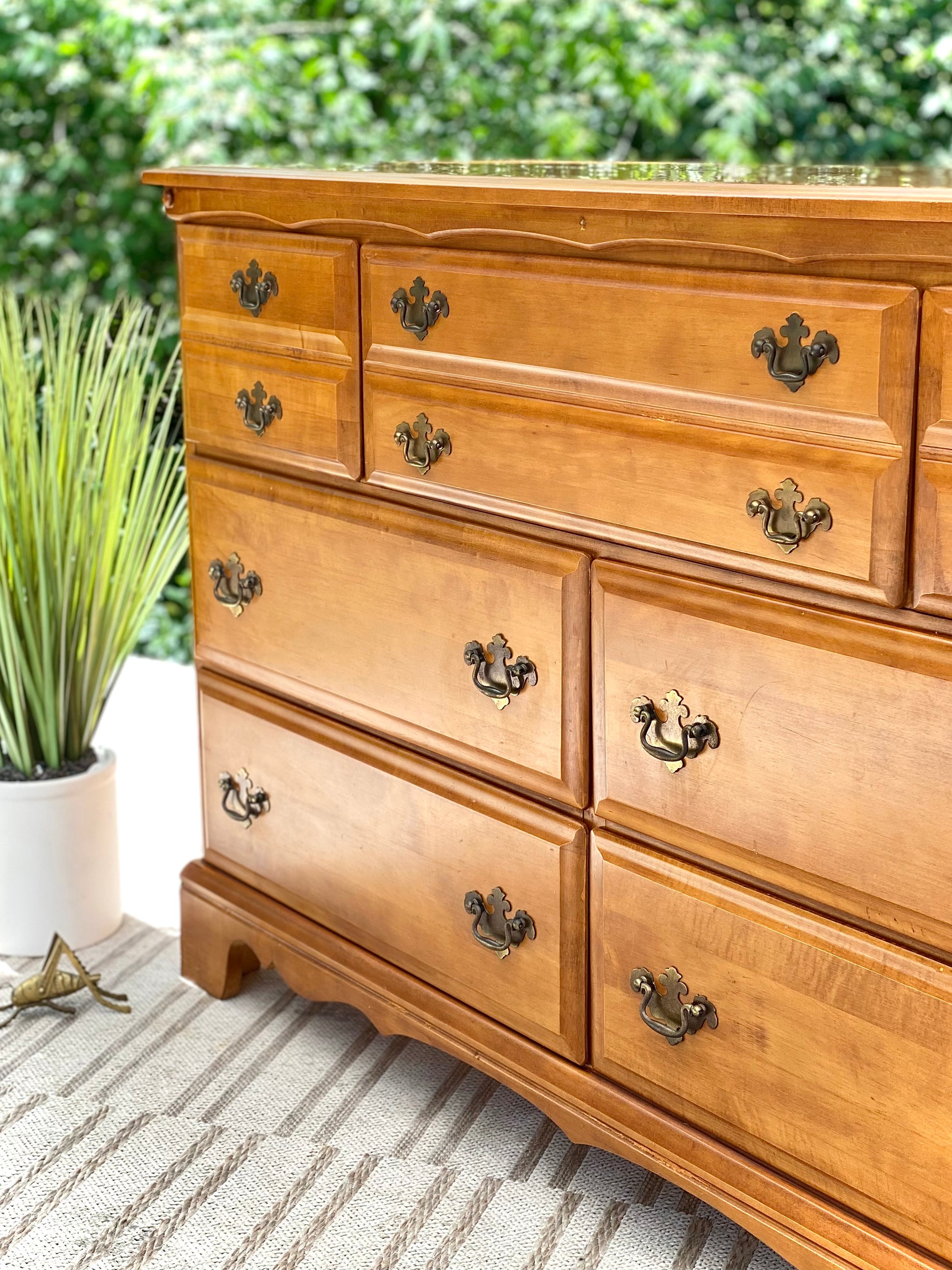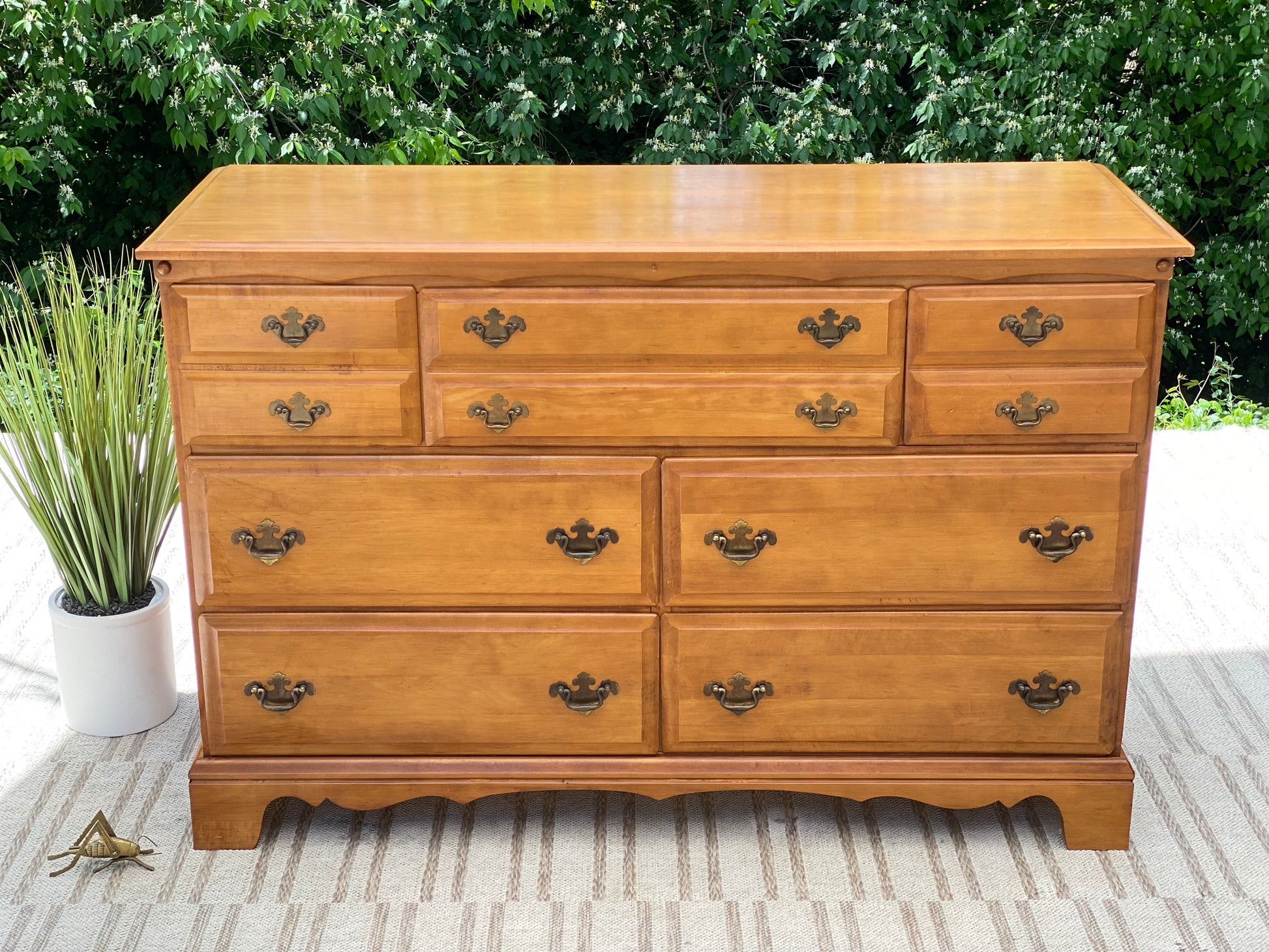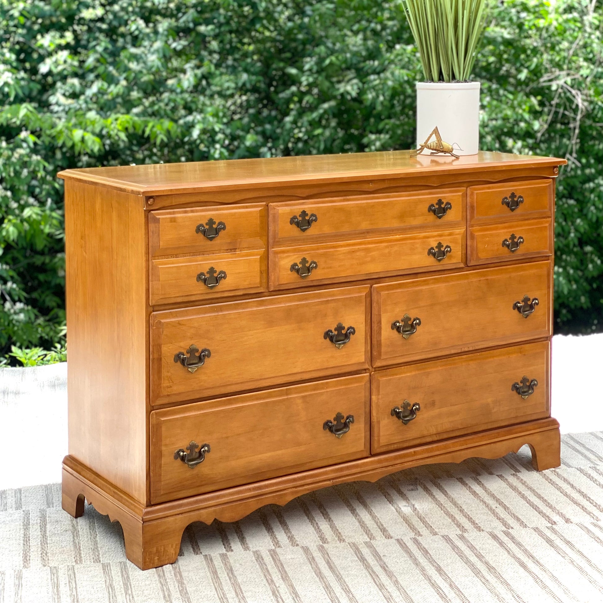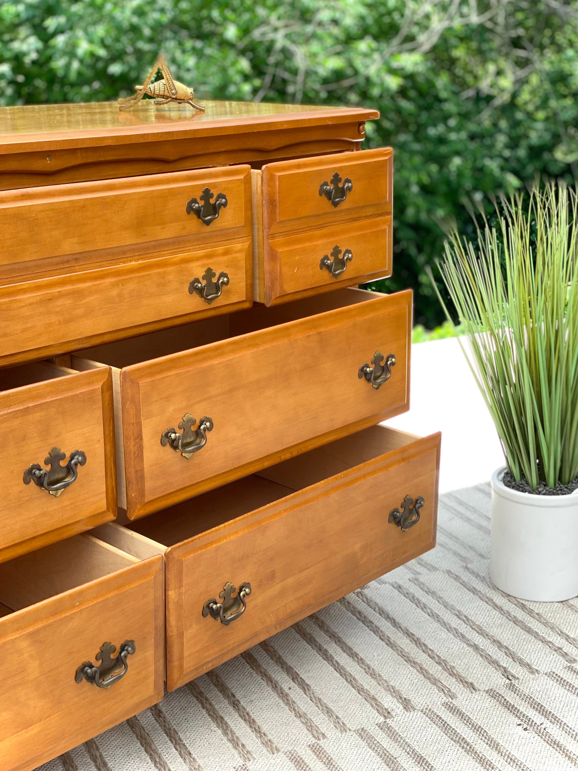 New arrival! 🪴🌱 We love the warm tones on this wooden maple seven drawer dresser. Vintage style with original hardware and tons of storage. 34” x 51” x 18” Good condition