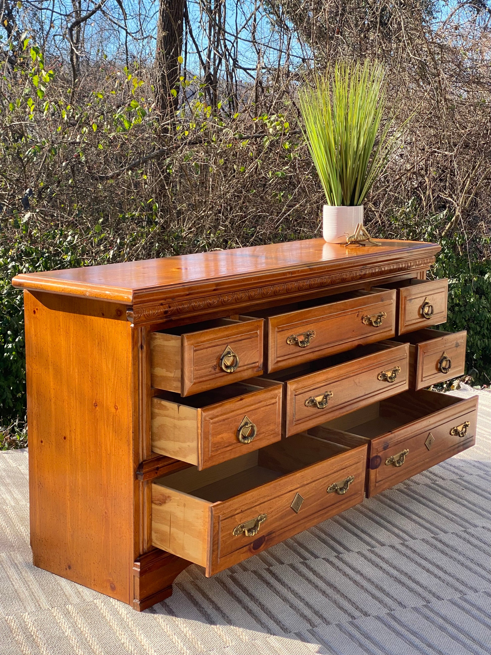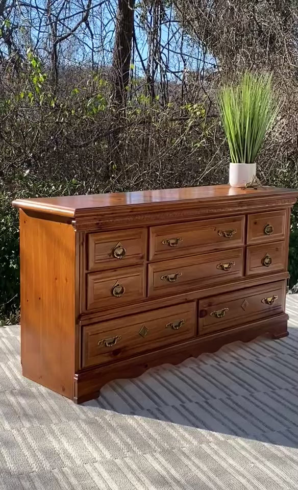 SOLD - Fresh find! ❄️❄️ Look at the awesome vintage wooden dresser with 8 spacious drawers. Original brass pulls. Made in the USA. 33” x 62” x 18” Good condition