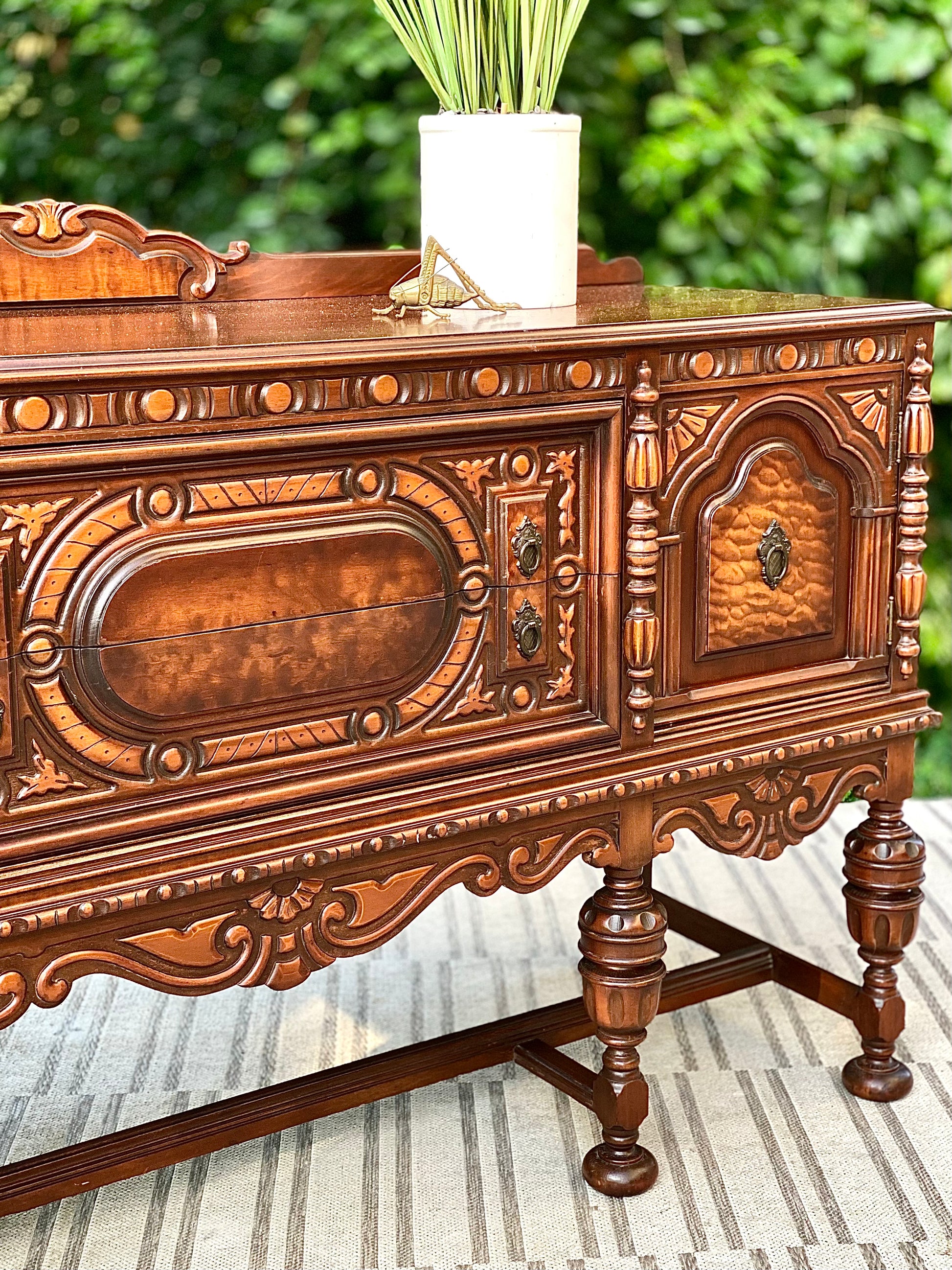 New arrival! 🍂🍁 We love the vibe of this vintage wooden credenza buffet. Two tone style with ornate detail and in overall nice, sturdy condition. Lots of storage available and great for a hallway, dining room or living space. 42”h x 66” x 22” Good condition