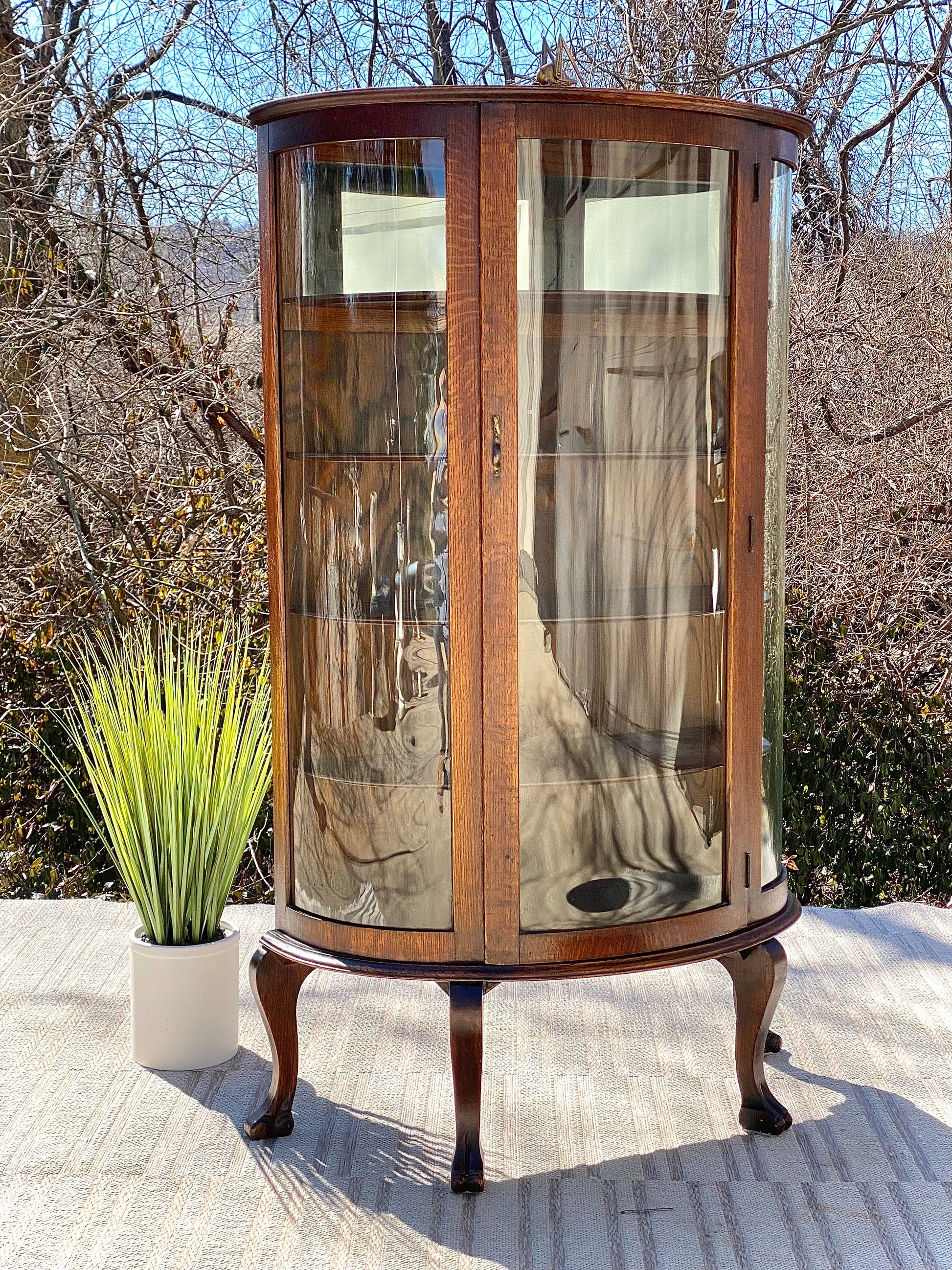 SOLD - Fresh find!!🌱❄️ We love this antique oak curved glass display case. Mirrored back top shelf with ample storage space and a classic vibe. All the glass is intact with no chips and cracks and comes with a key. 58” x 34” x 15” Good condition