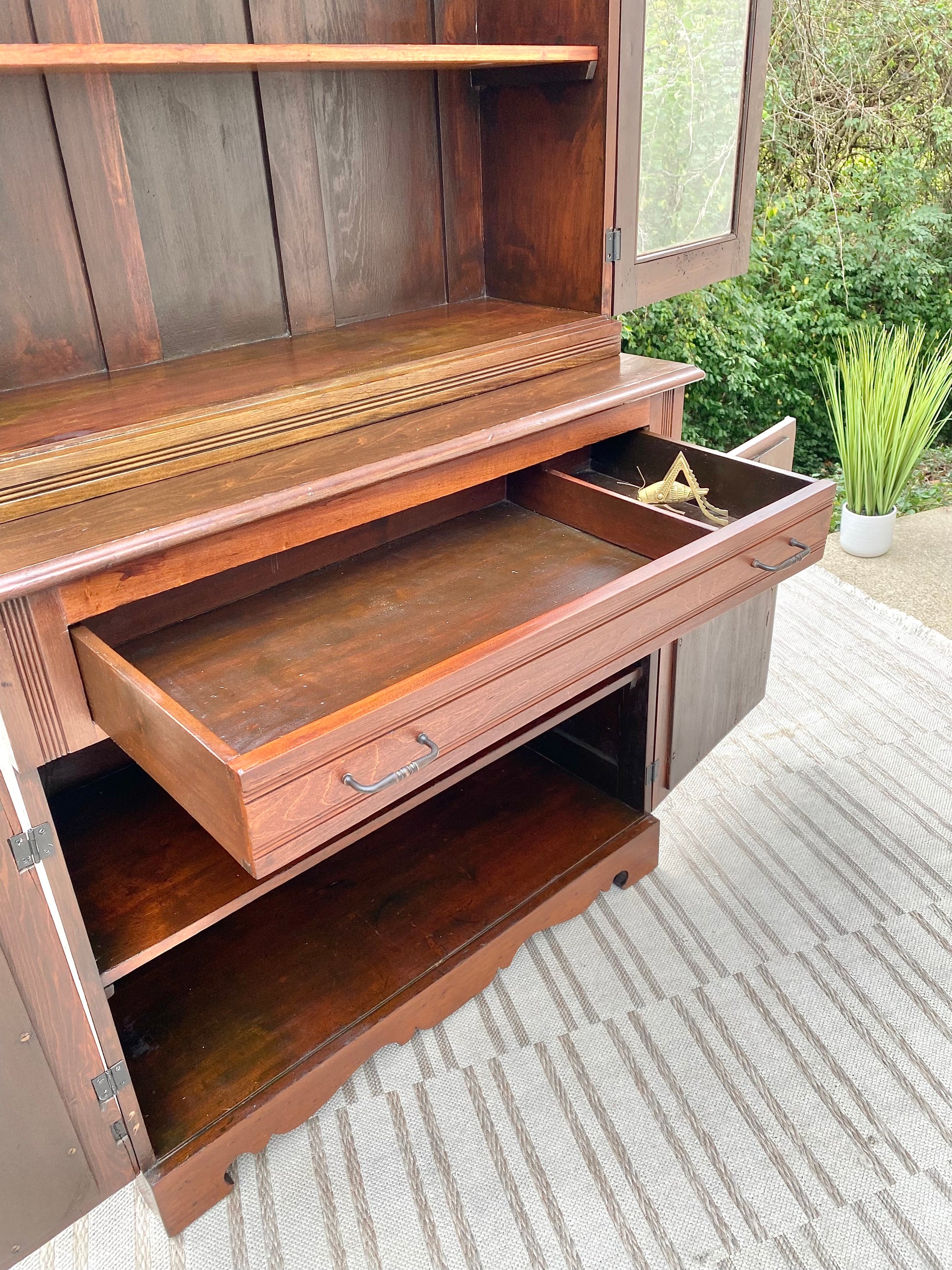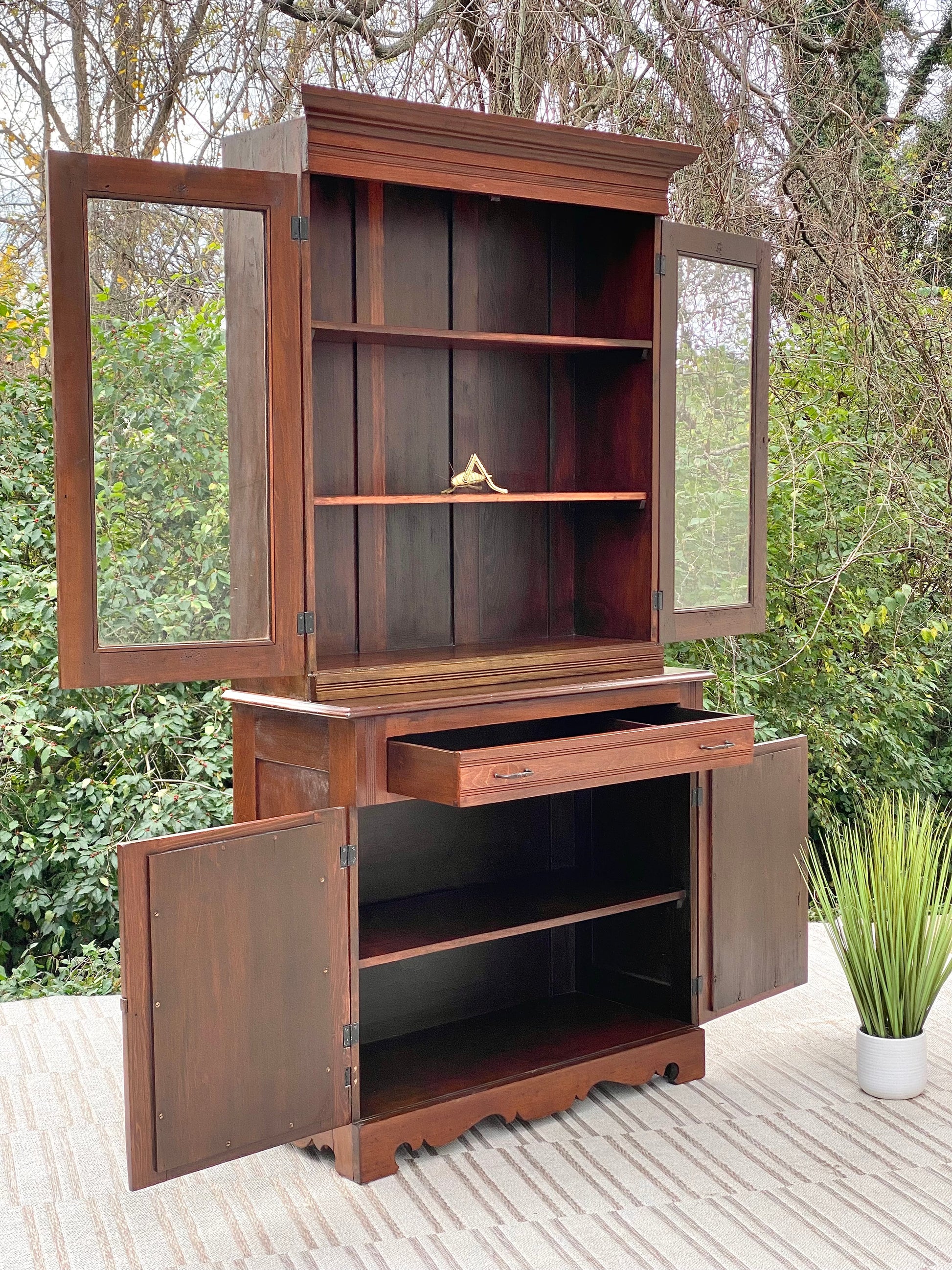 SOLD - Newest arrival! 🧡🍁 Check out this beautiful, antique primitive farmhouse 2 pice country display cabinet. Top portion has shelves with original wavy glass and plenty of storage below. Incredible antique find and ready for any room! 81” x 40” x 17” Good condition