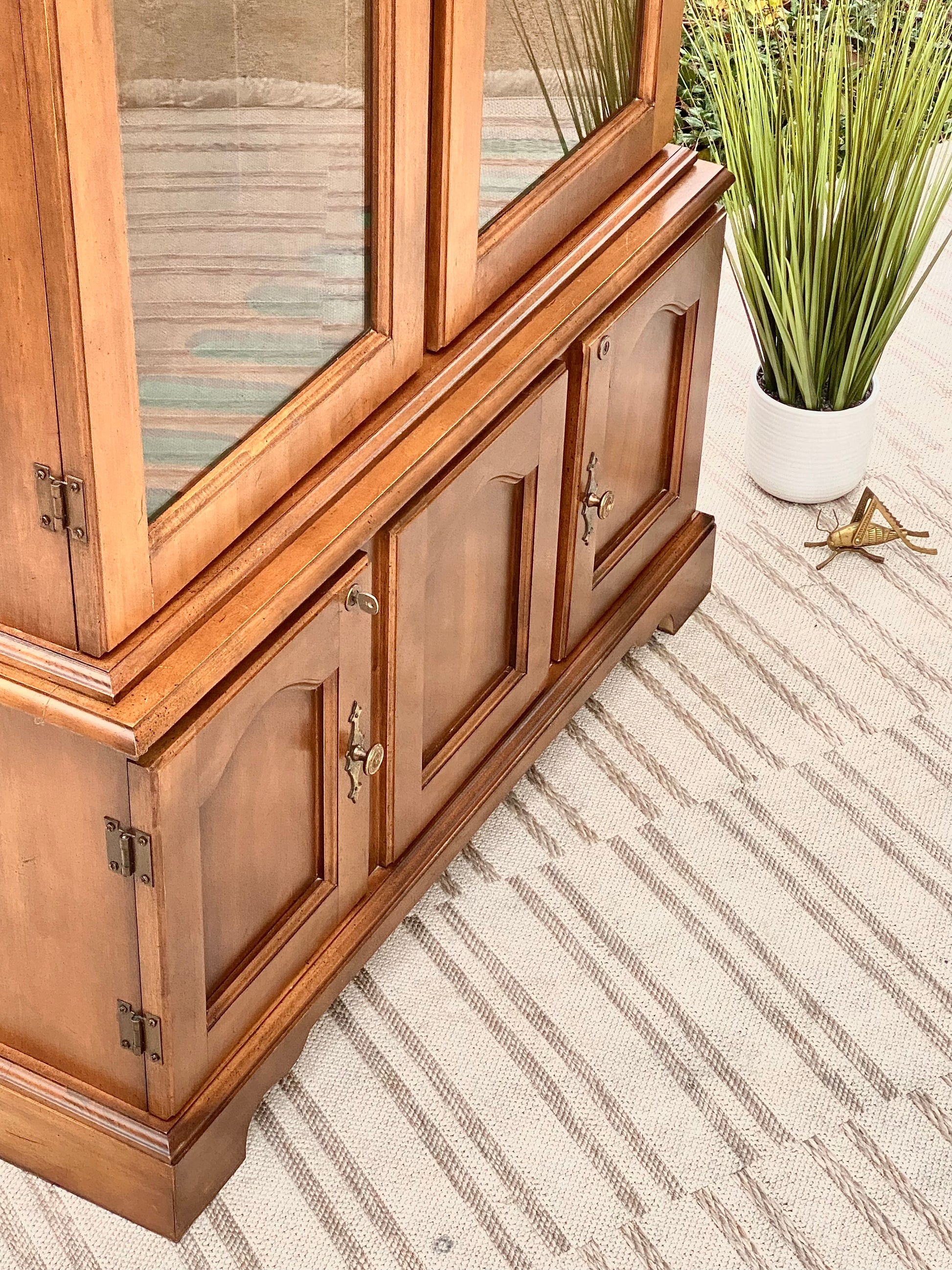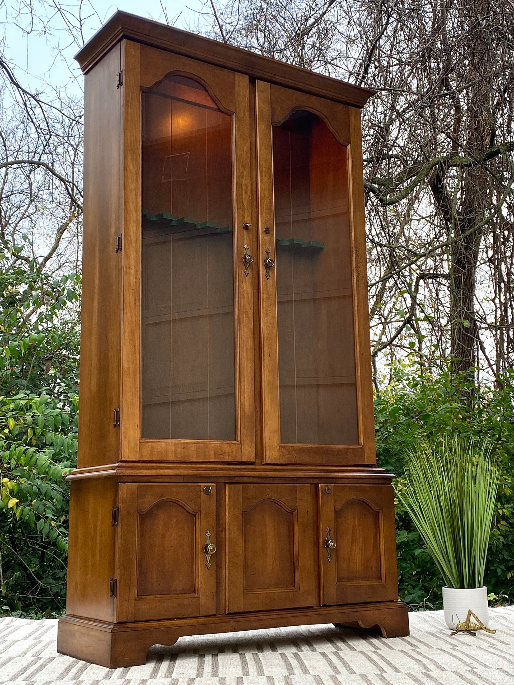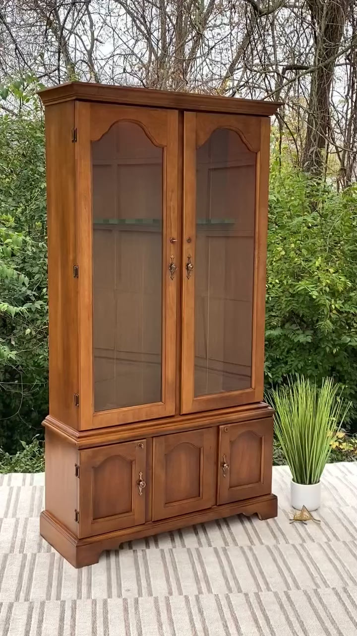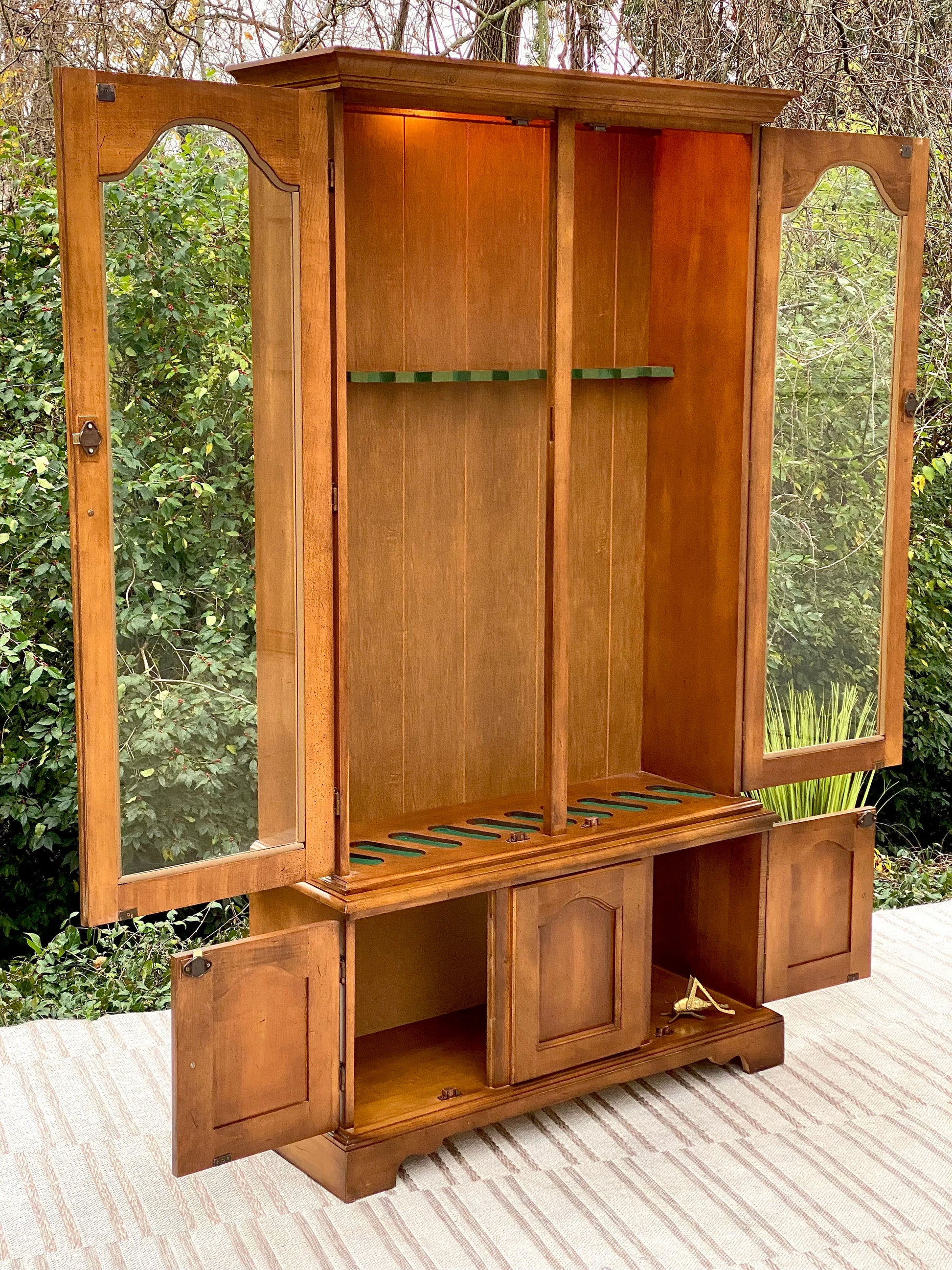 SOLD - New arrival! 🧡🍁 Check out this vintage wooden lighted gun cabinet. Comes with glass doors and lower storage. 75” x 41” x 15” Good condition