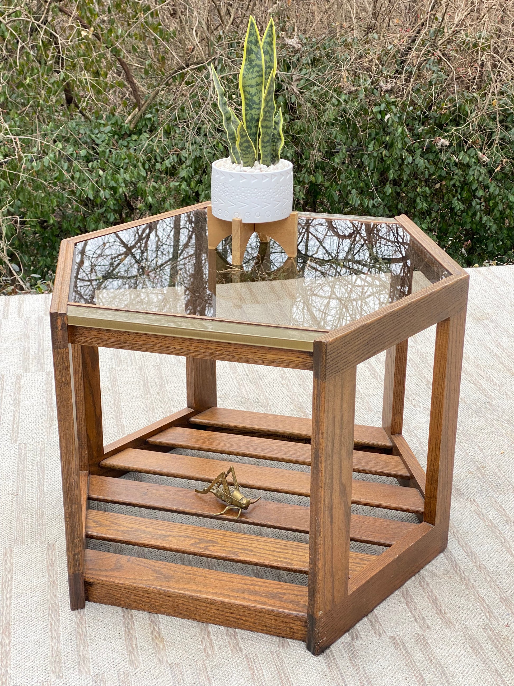 Just arrived! ❄️🍁 We love this vintage wooden Mersman glass top hexagon side table. Smoked glass top with a very unique vibe. We love it!!! 20”h x 28” x 28” Good condition