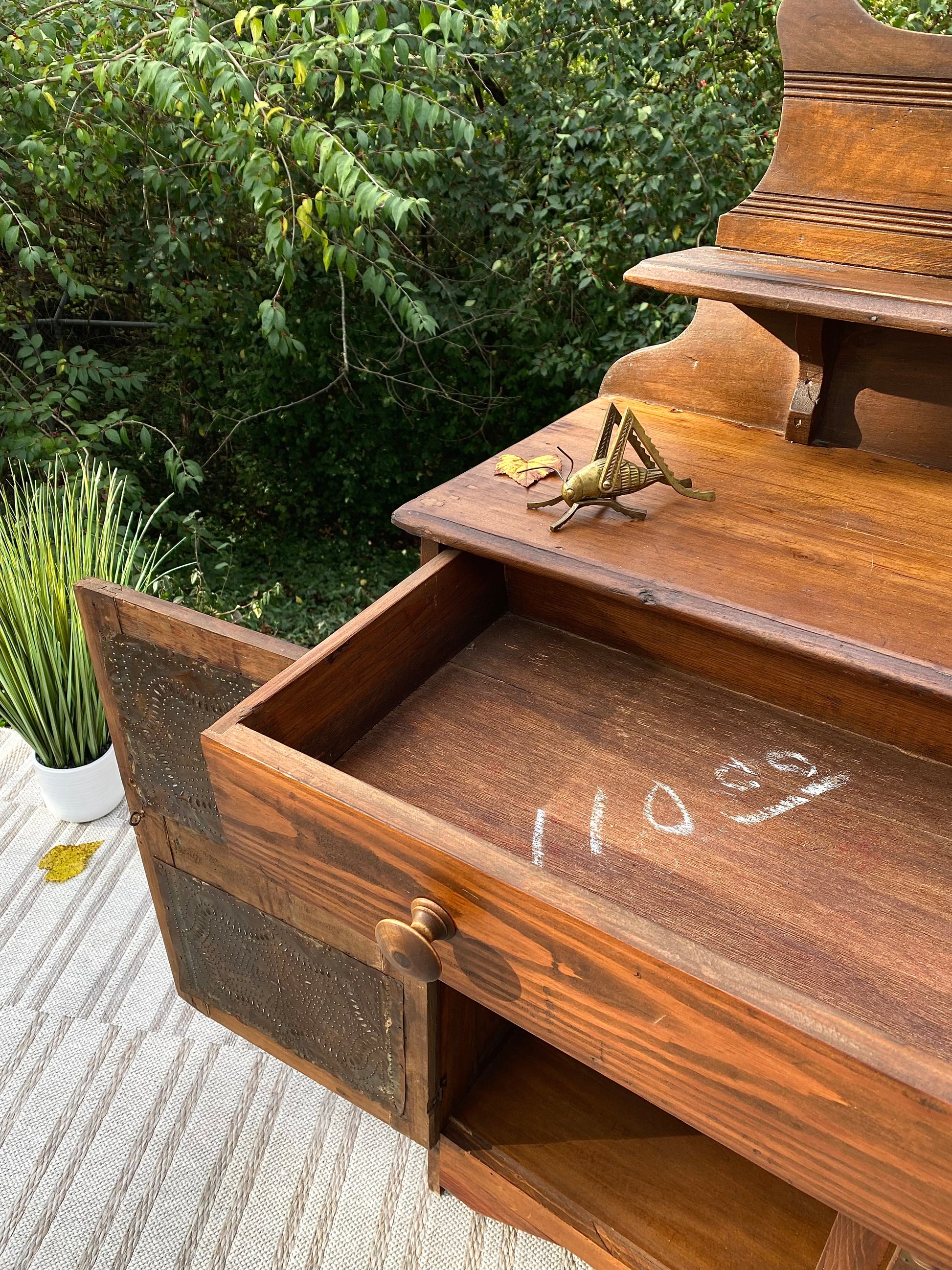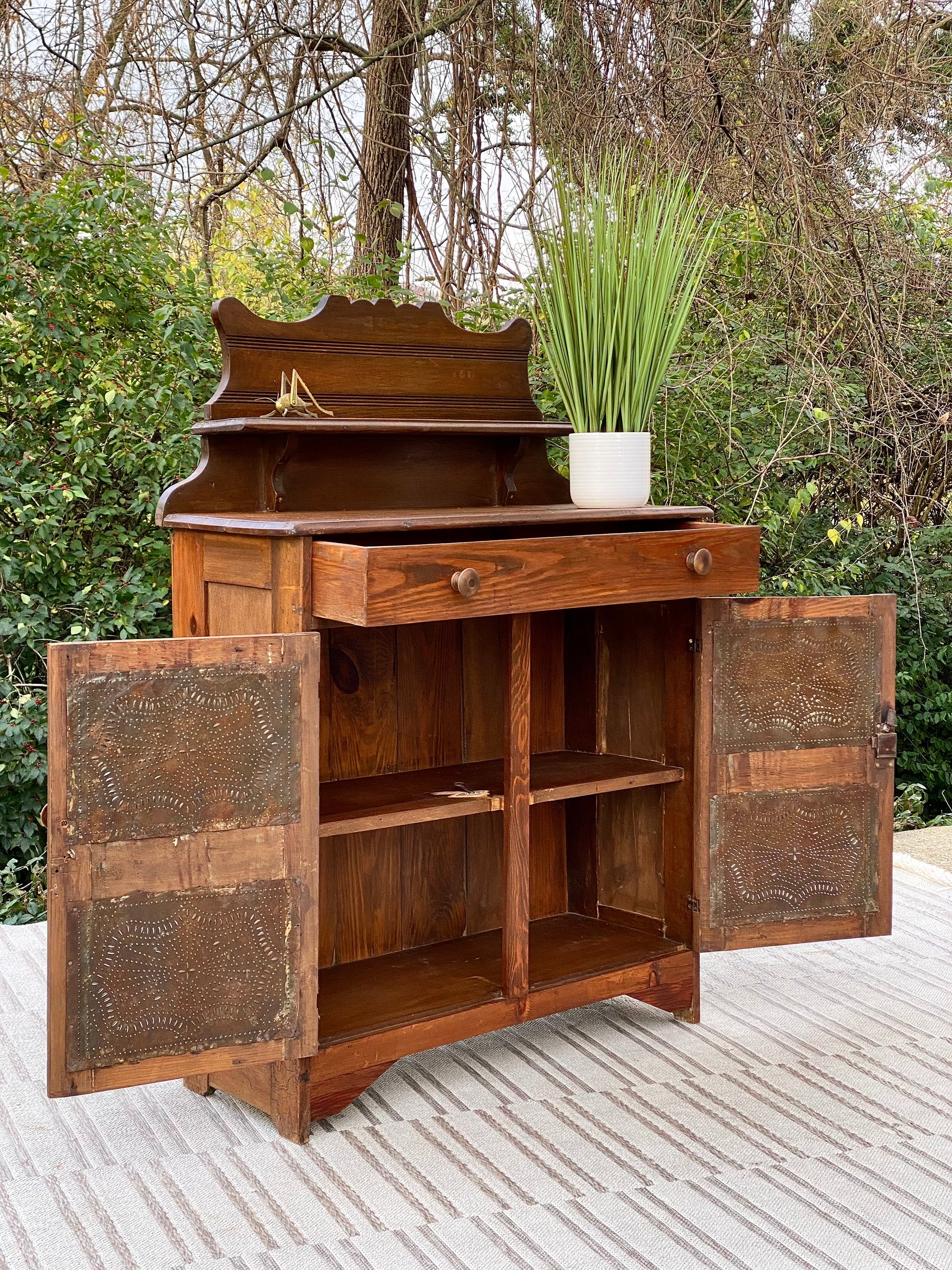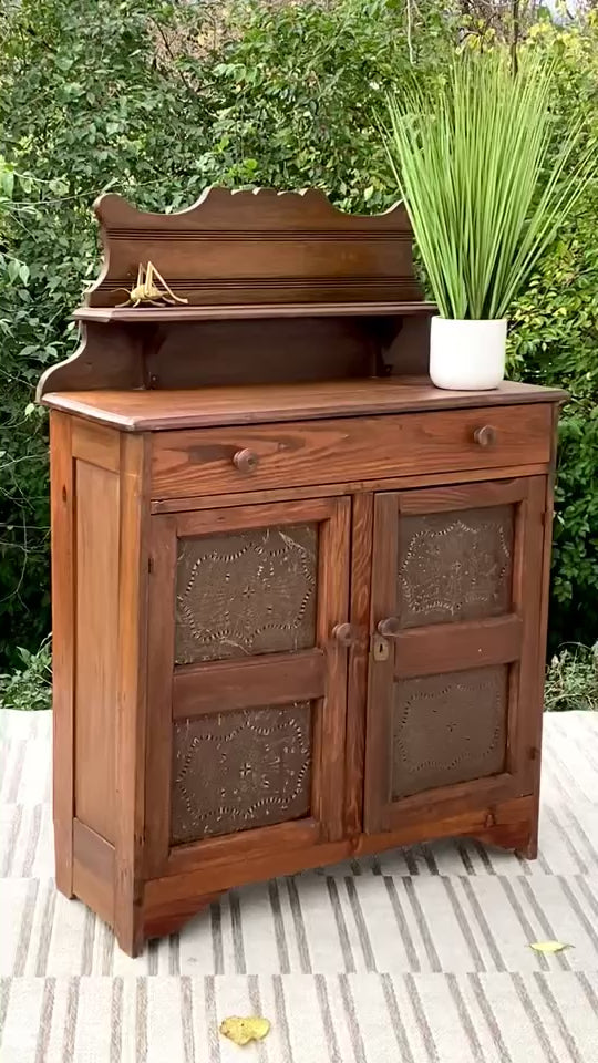 SOLD - Fresh find! 🍁🧡 Look at this beautiful vintage pine pie safe. Original metal tin plates with a wonderful patina. Lots of lower storage. 52” x 38” x 15” Good condition