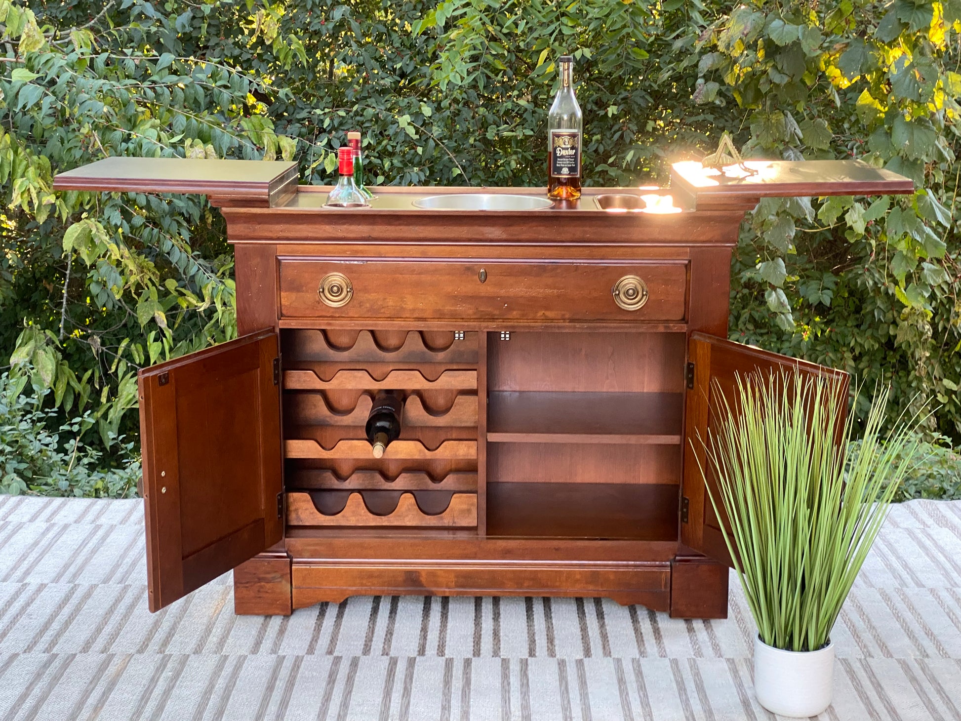 SOLD - Newest arrival!! 🍁🧡 Check out this awesome vintage wooden portable bar. Perfect piece for bottle and glass storage and serving. Wooden inlay on top. 37” x 44” x 18” Good condition