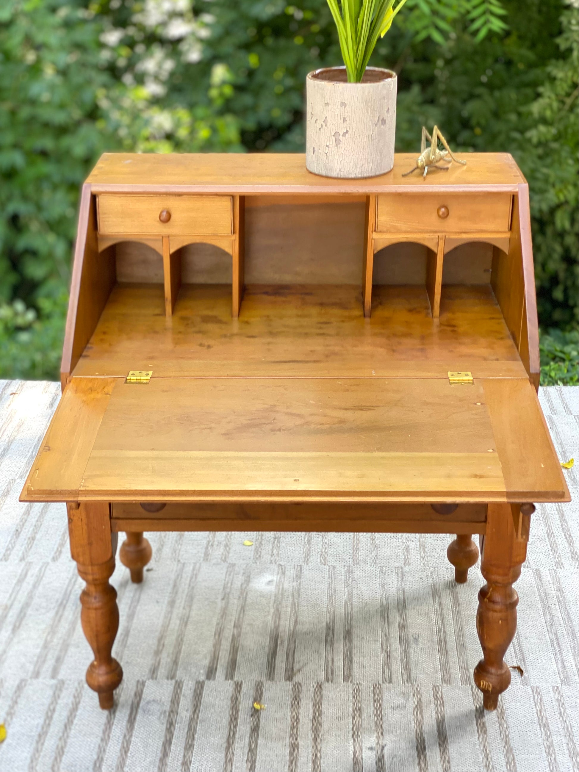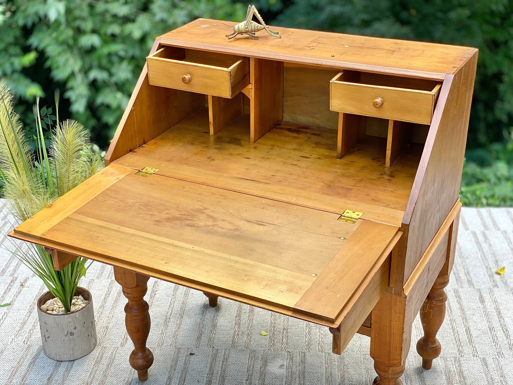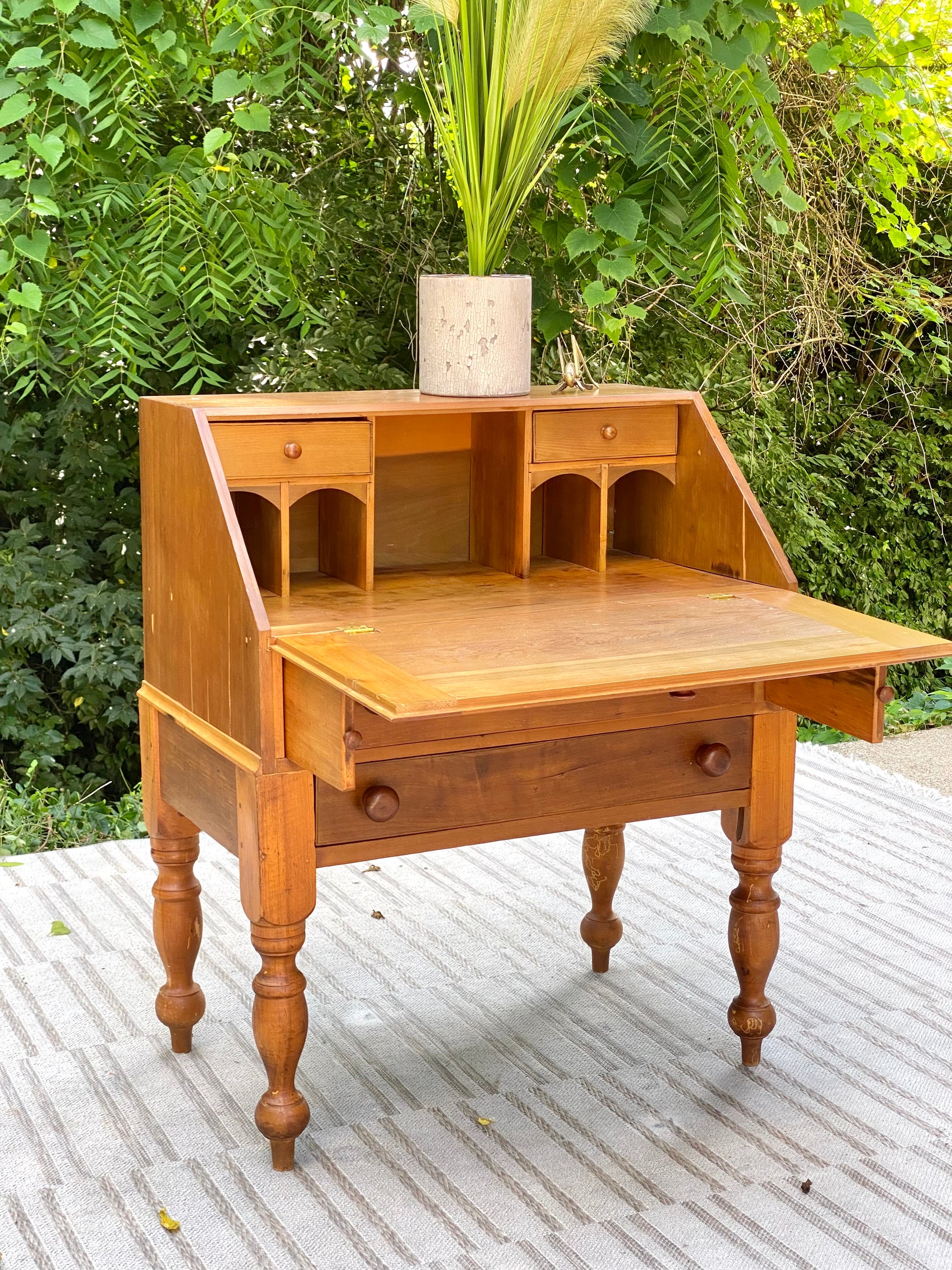 New arrival! 🪴🌱 We love the light tones of this antique wooden secretary desk. Dovetail design and lots of little cubby holes and drawers for storage. 38”h x 31” x 19” Good condition