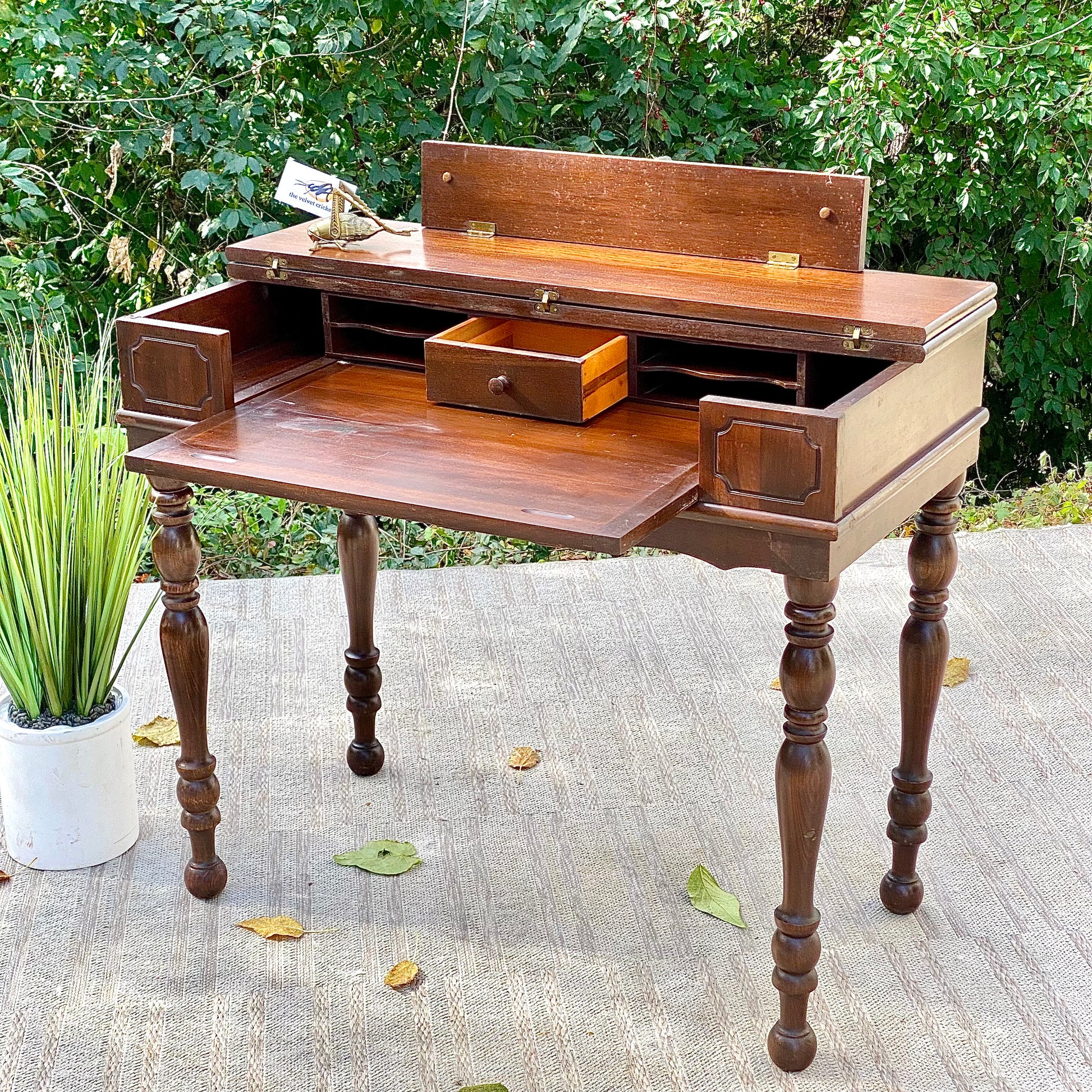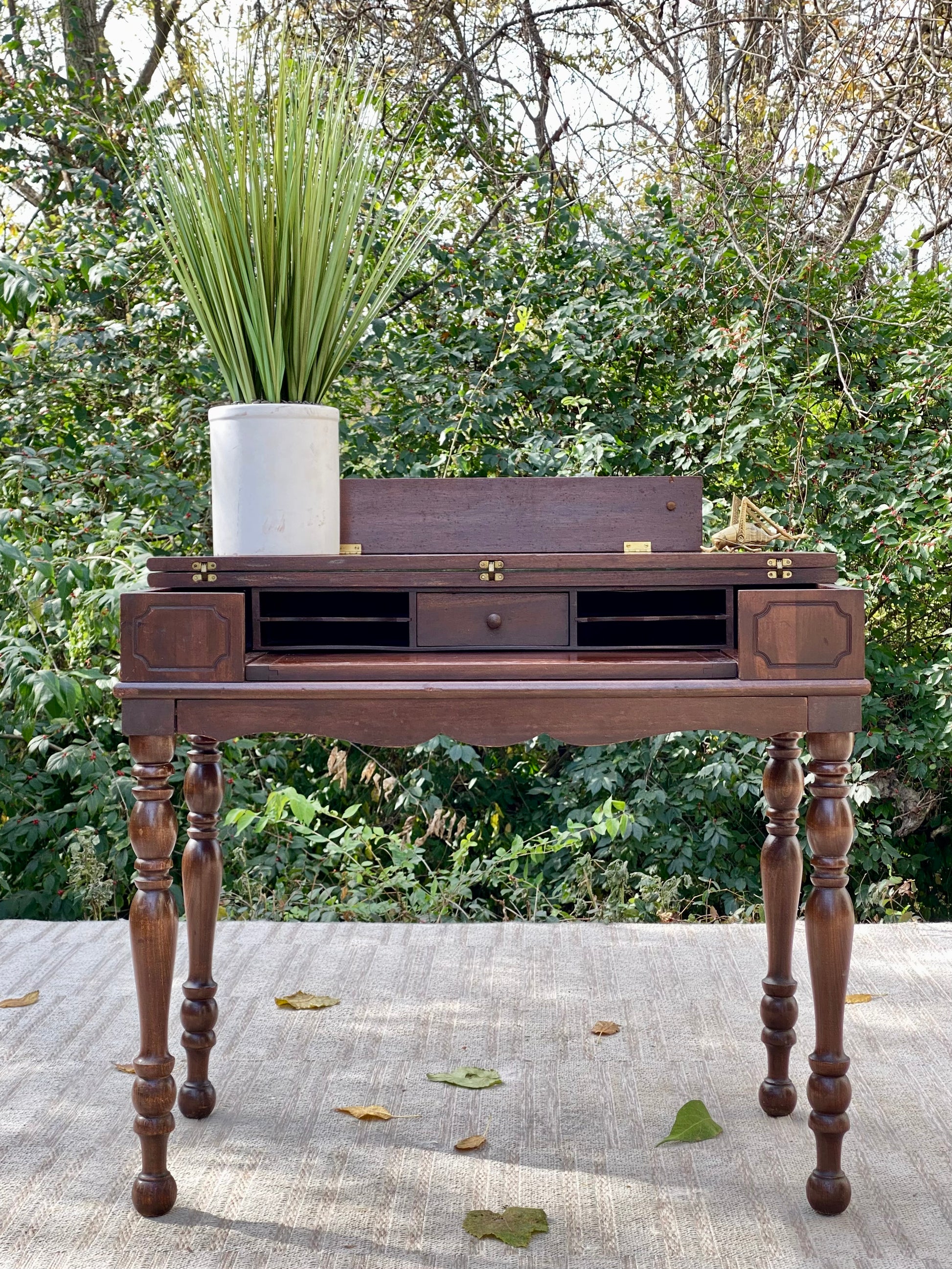 New arrival! 🍁🍂 We love this antique wooden secretary hall table. Nice writing surface and small cubbies make for a nice little desk area. The top closes creating a beautiful hallway piece. 31”h x 36” x 18” Good condition