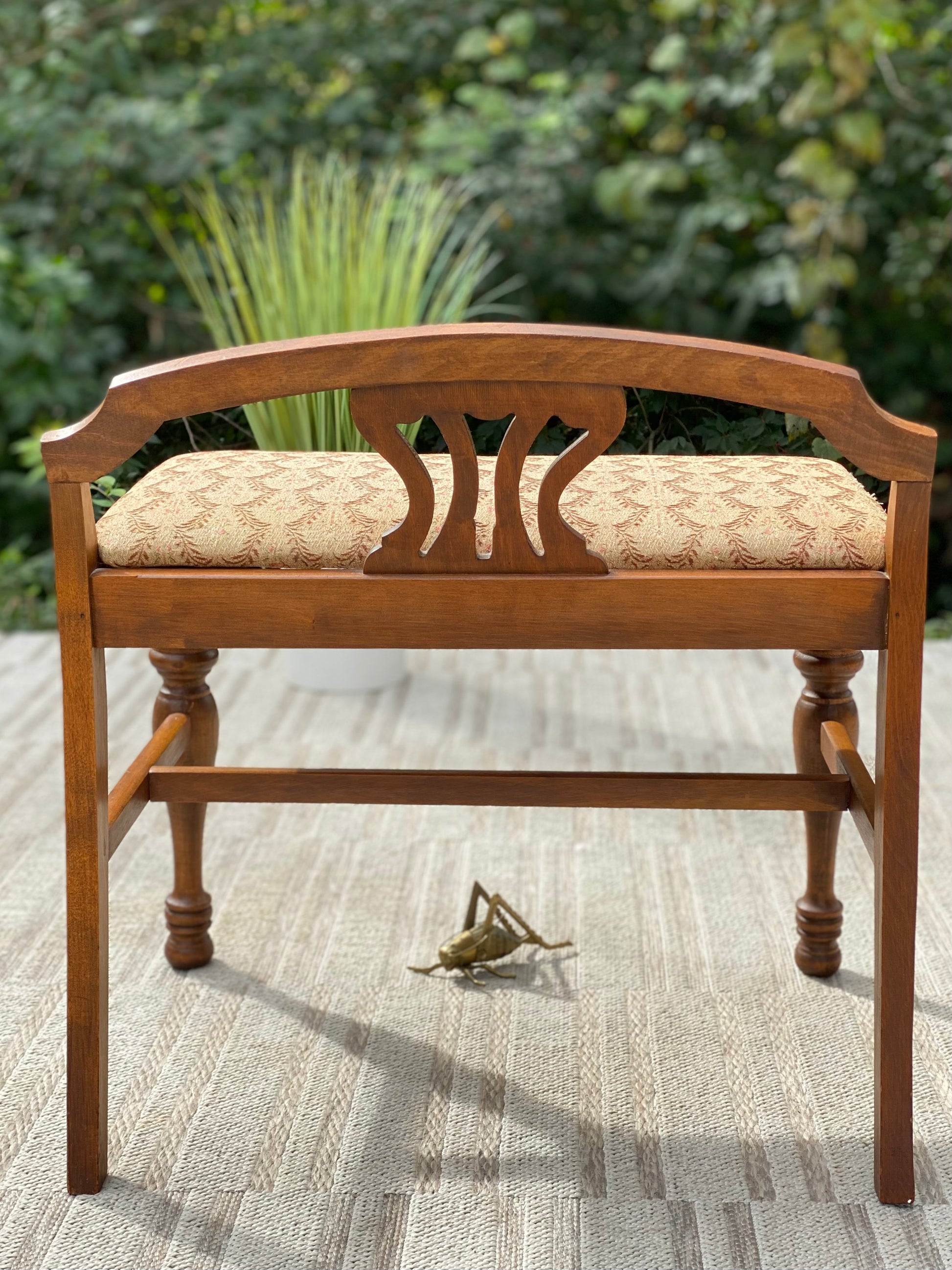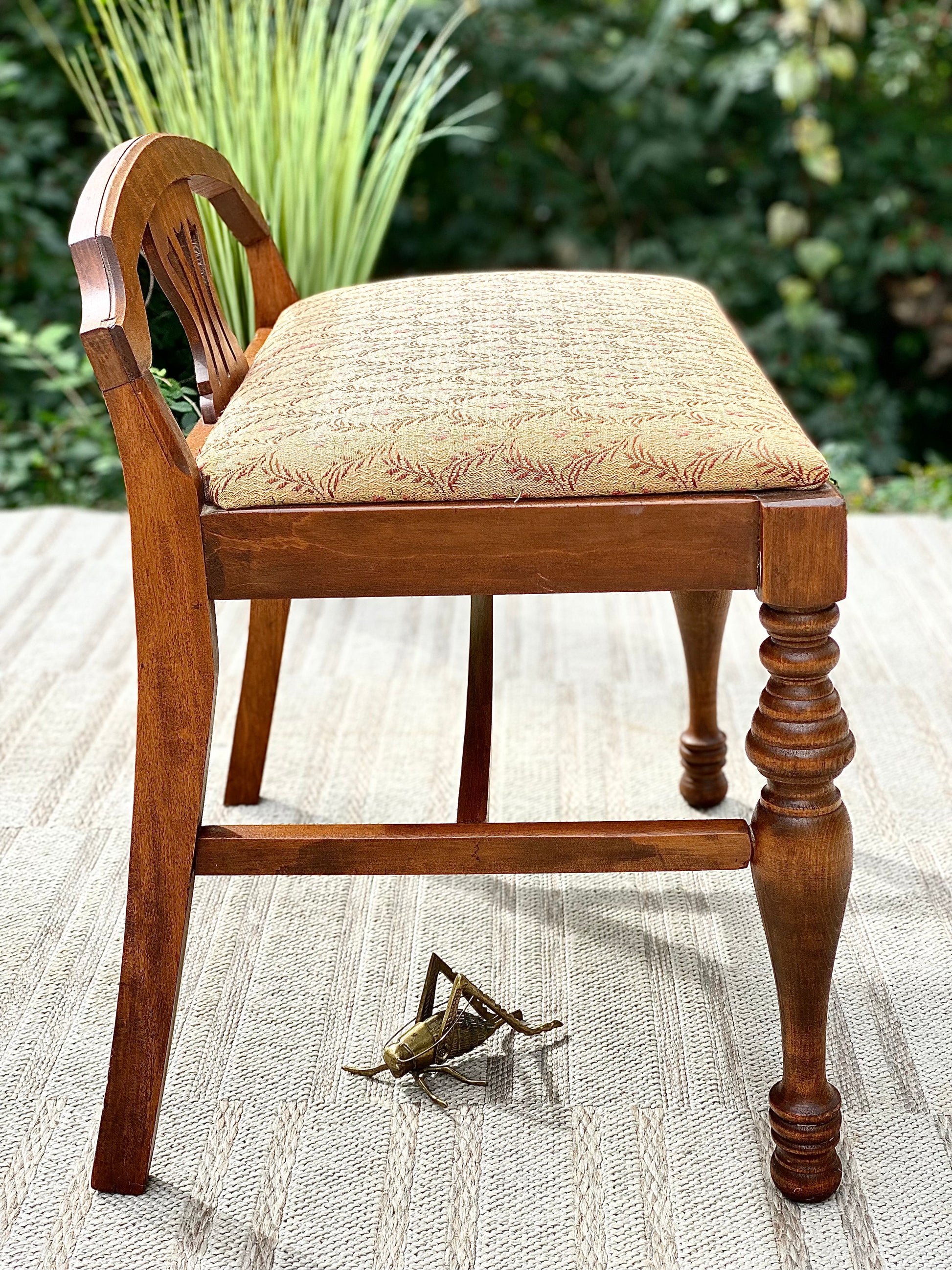 SOLD - Just arrived 🍁🍂 Check out this vintage wooden vanity bench stool. Upholstered top with a beautiful design. Sturdy construction and ready to use. 23”h x 24” x 18” Good condition