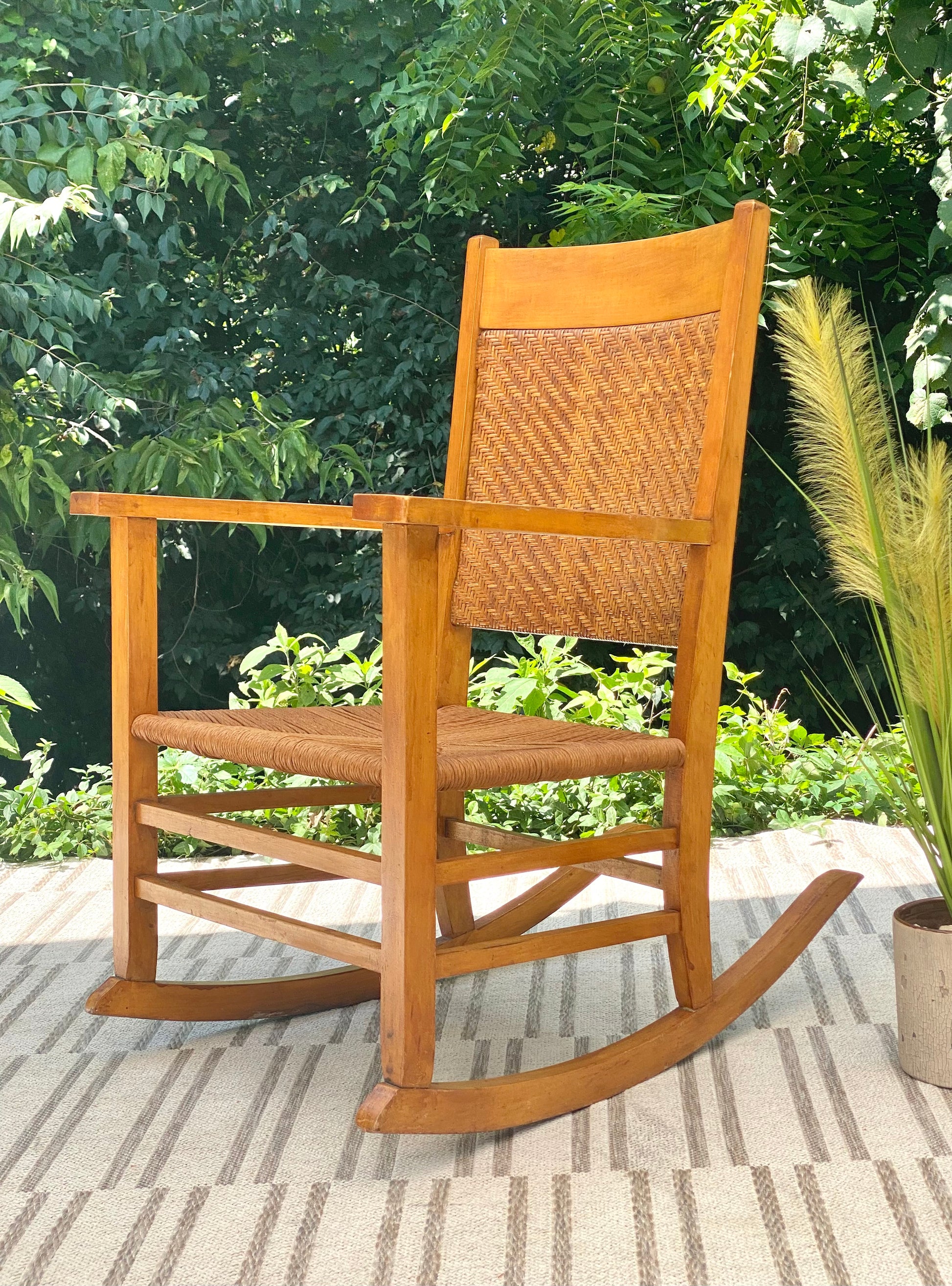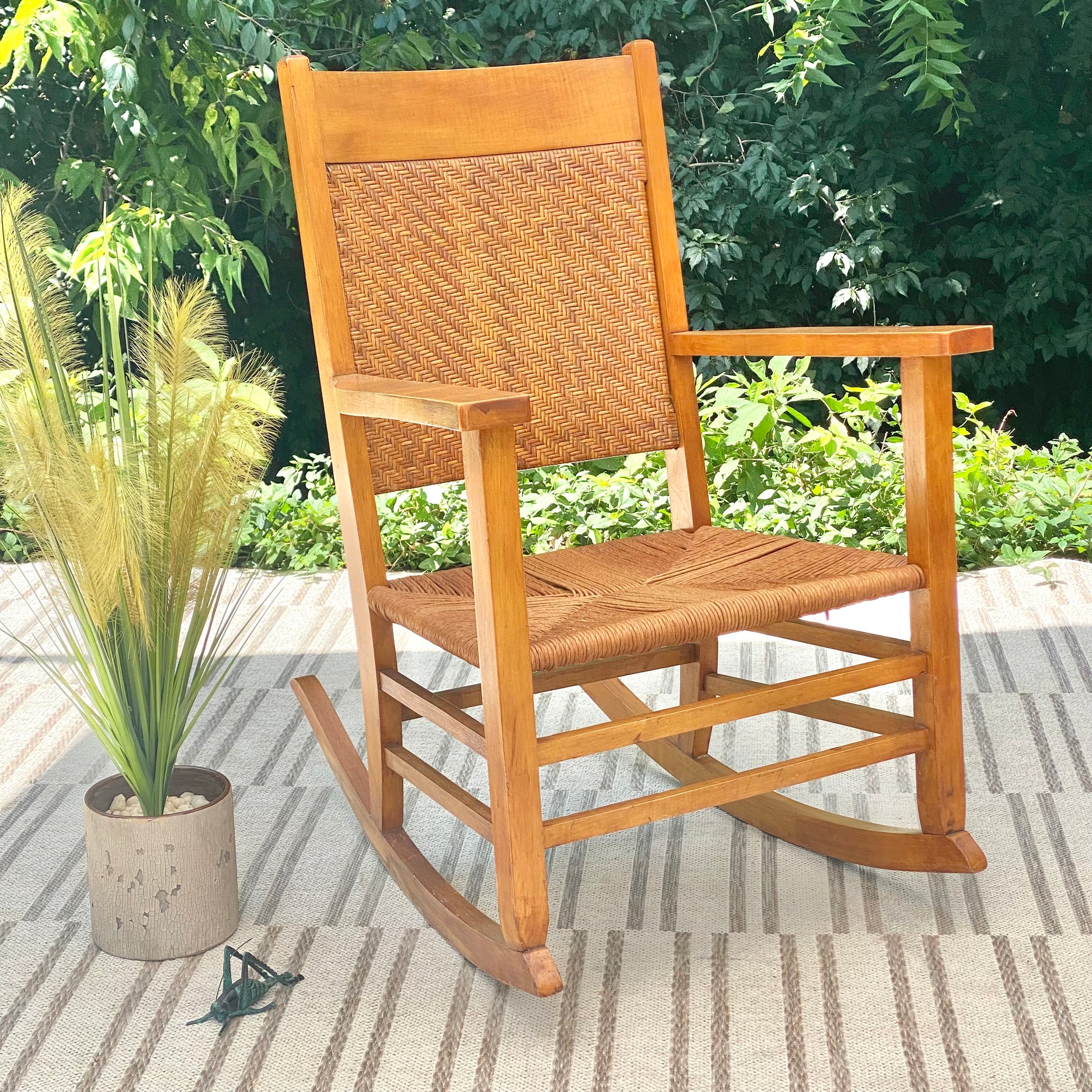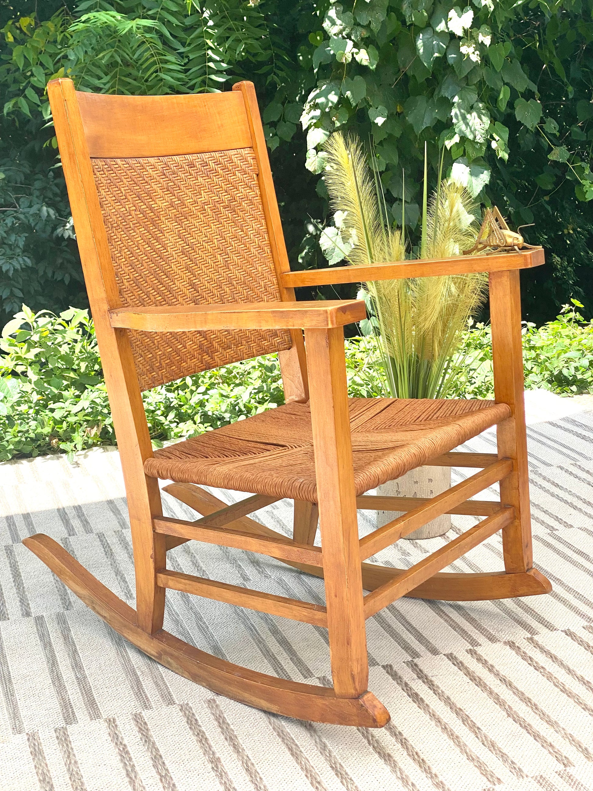 SOLD - New arrival! Nice maple colored wooden rocking chair. Perfect for any sunrise or sunset. 37" x25" x 24" Good condition