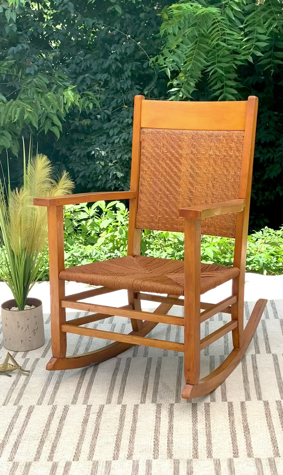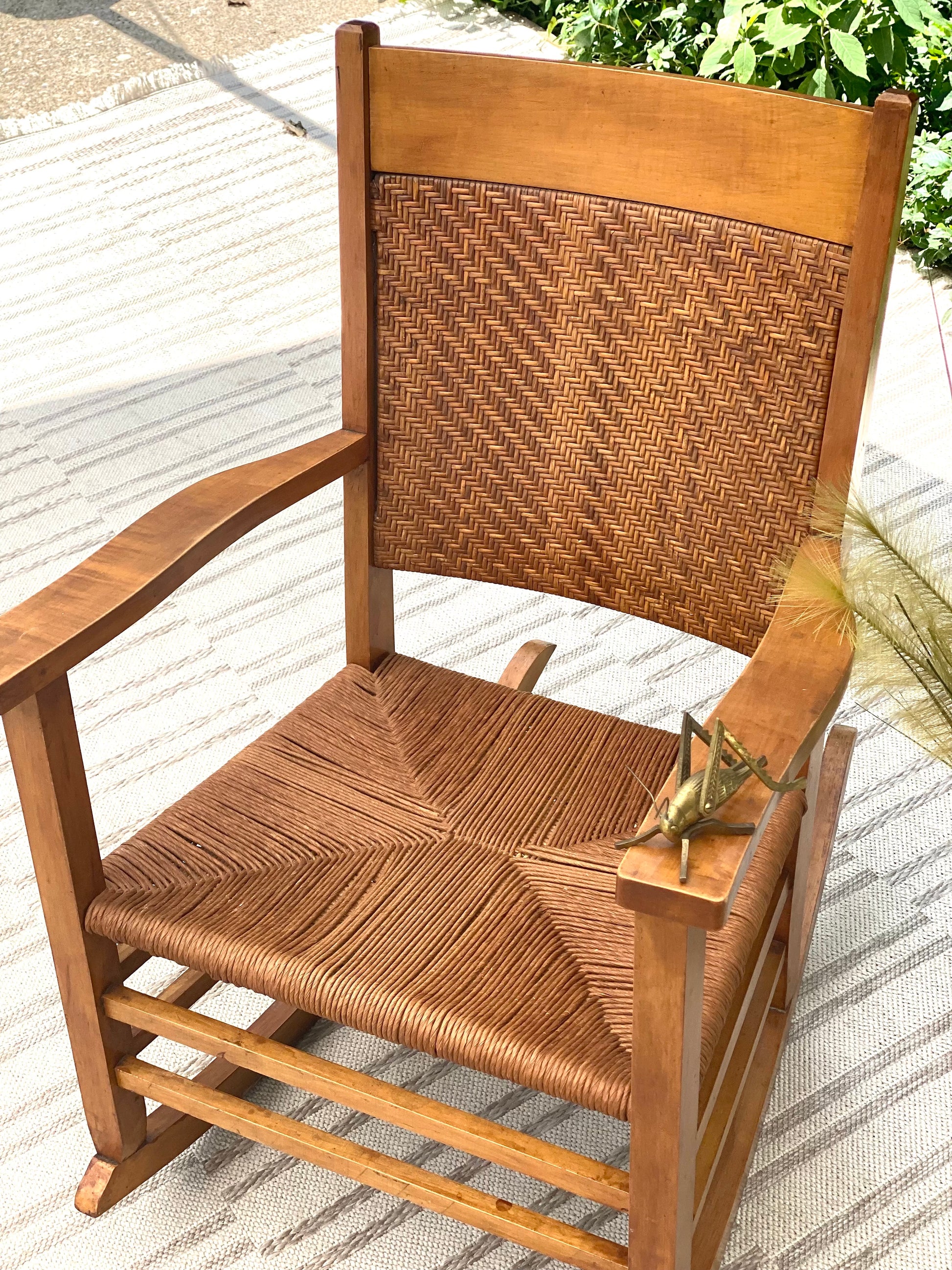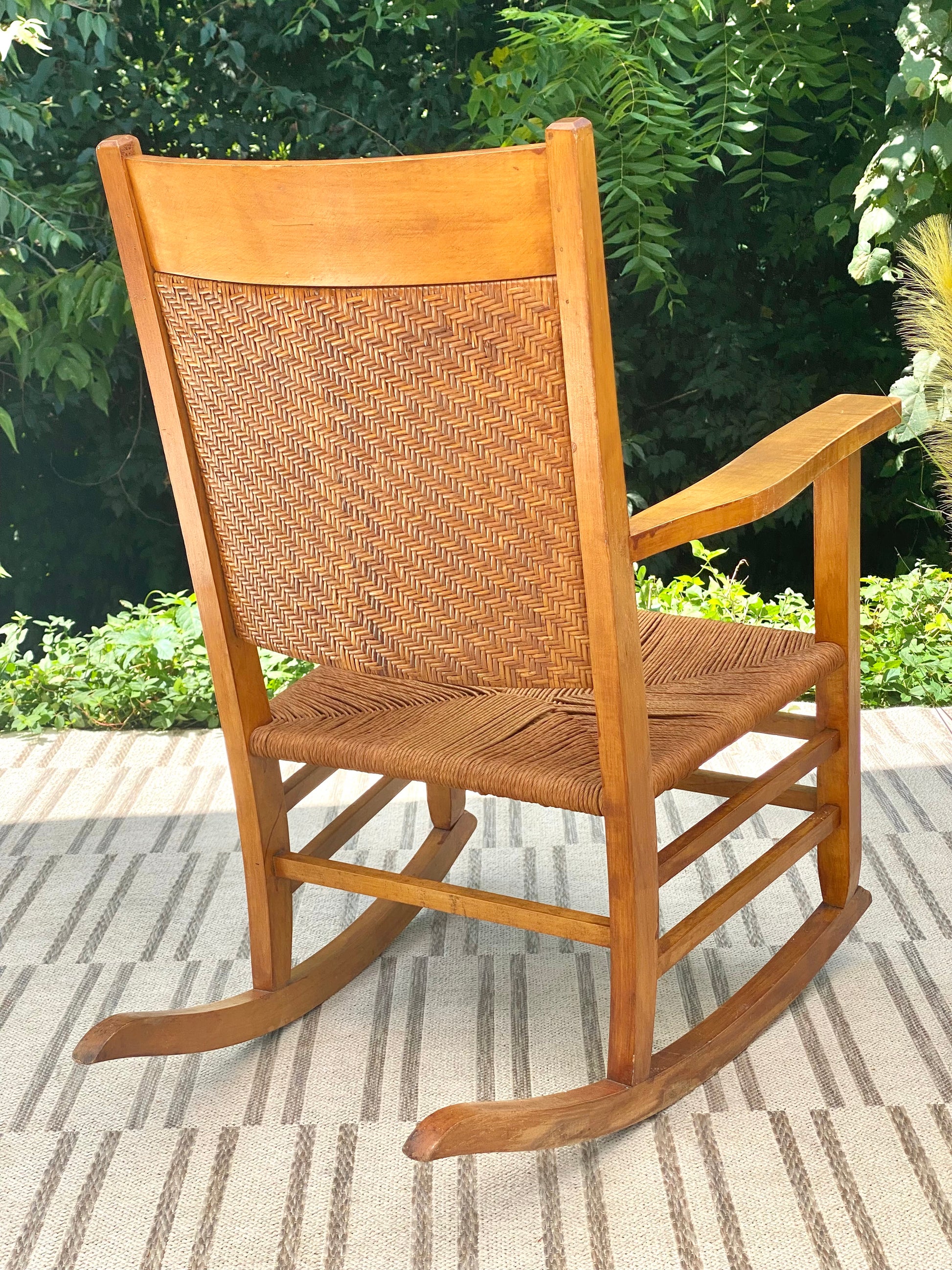 SOLD - New arrival! Nice maple colored wooden rocking chair. Perfect for any sunrise or sunset. 37" x25" x 24" Good condition